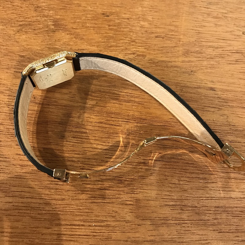 | 既に廃盤の1980年代製。オクタゴンケースの直線の美しさが印象的な『ミニサンチュール』のご紹介です。ローマンダイヤルにブルースチール針、純正の3連ラグダイヤがとても素敵です。エレガントを極めたカルティエらしさの詰まった一本です。初期のイエローゴールド製デプロイメントバックル (Dバックル)が付属しており、レザーバンドのサイズ調整が出来ない初期モデルです。現在では考えられないサービスですが、顧客一人一人に合わせてレザーバンドを制作し納品していた事が解るこのDバックルは、特別感があり、何でも買える時代に待たなければ買えない不便さを、待つ事の喜びを教えてくれる貴重なアイテムです。カルティエのサービス同様、ご購入のお客様には、クロコサイドシャイシー仕上のレザーブレスのオーダーをお付け致します。 |