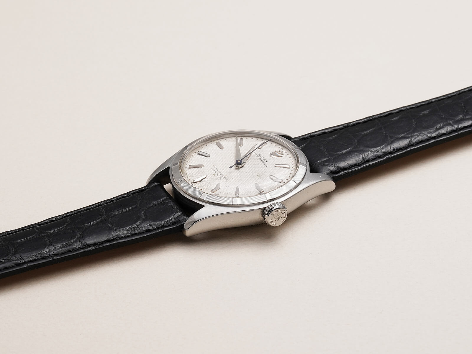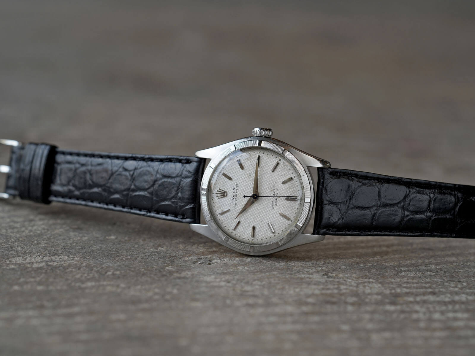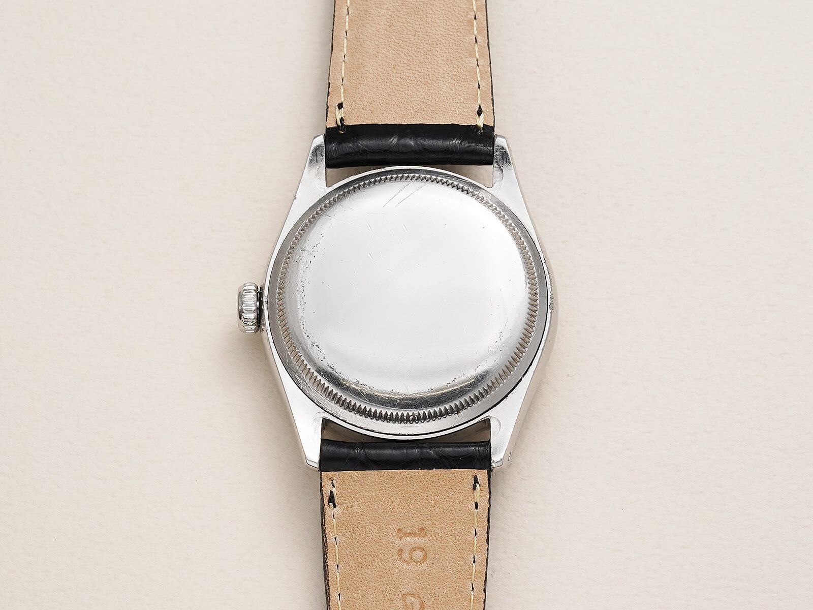 | 廃盤メンズモデル 世界で初めて完全防水自動巻き腕時計を開発したロレックス。手巻ベースの機械に自動巻ローターを搭載したことで厚みが増してしまい、特徴的な膨らみを持った裏蓋の完全防水ケースを開発。正式名称はオイスターパーペチュアルで、裏蓋が泡のように膨らんでいることから、アメリカで愛称として「バブルバック」と呼ばれるようになりました。40年代の秒針がセンターに切り替わり始めていた時代に、防水、自動巻き、高精度クロノメーター認定を実現した、正に夢のような時計として存在しました。 今回ご紹介のRef6107は、[ セミバブルバック / Semi Bubble back ] と呼ばれる、バブルバックの最終モデルです。裏蓋がやや膨れたステンレス製のスクリューバックケースに、傾斜の付いたエンジンターンドベゼルを装備し、経年変化で味のある風合いを魅せるホワイトハニカムダイヤルとドルフィンハンド、バレットインデックス、綺麗なブルースチール加工の秒針がヴィンテージ感を引き立たせてくれます。「ROLEX OYSTER」と刻印された、ねじ込み式では無いリューズ(スーパーオイスターリューズ)が採用されており、様々な変遷のあった時代特有のディテールが、ヴィンテージロレックスの魅力を堪能させてくれる逸品です。 ムーブメントは、ダイヤルに表記された「Officially Certified Chronometer」の文字が表す通り、自動巻クロノメーター規格を通過したキャリバー645を搭載。多くのバブルバックモデルに搭載された、名機キャリバー630の基本構造はそのままに、よりフラット化を実現。1950年代より高い視認性を求める傾向となり、紳士用腕時計に拡大化が求められ、バブルバックよりも大型化されました。後に開発された名機キャリバー1030へと変わっていくことで、セミバブルは製造期間が短く、とても貴重な存在です。 レザーブレスには、当店オリジナルのクロコダイルレザーのブラックをセレクト。洗練された美しさと趣のある存在感を示し、目にする人を魅了してくれる素晴らしい時計です。是非店頭にてご覧ください。 |