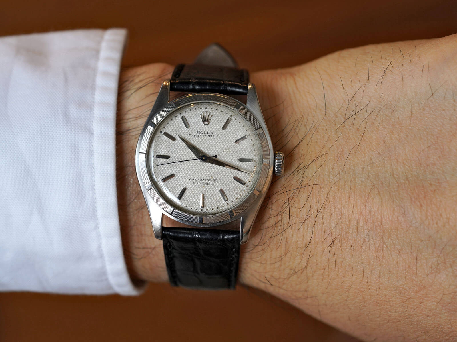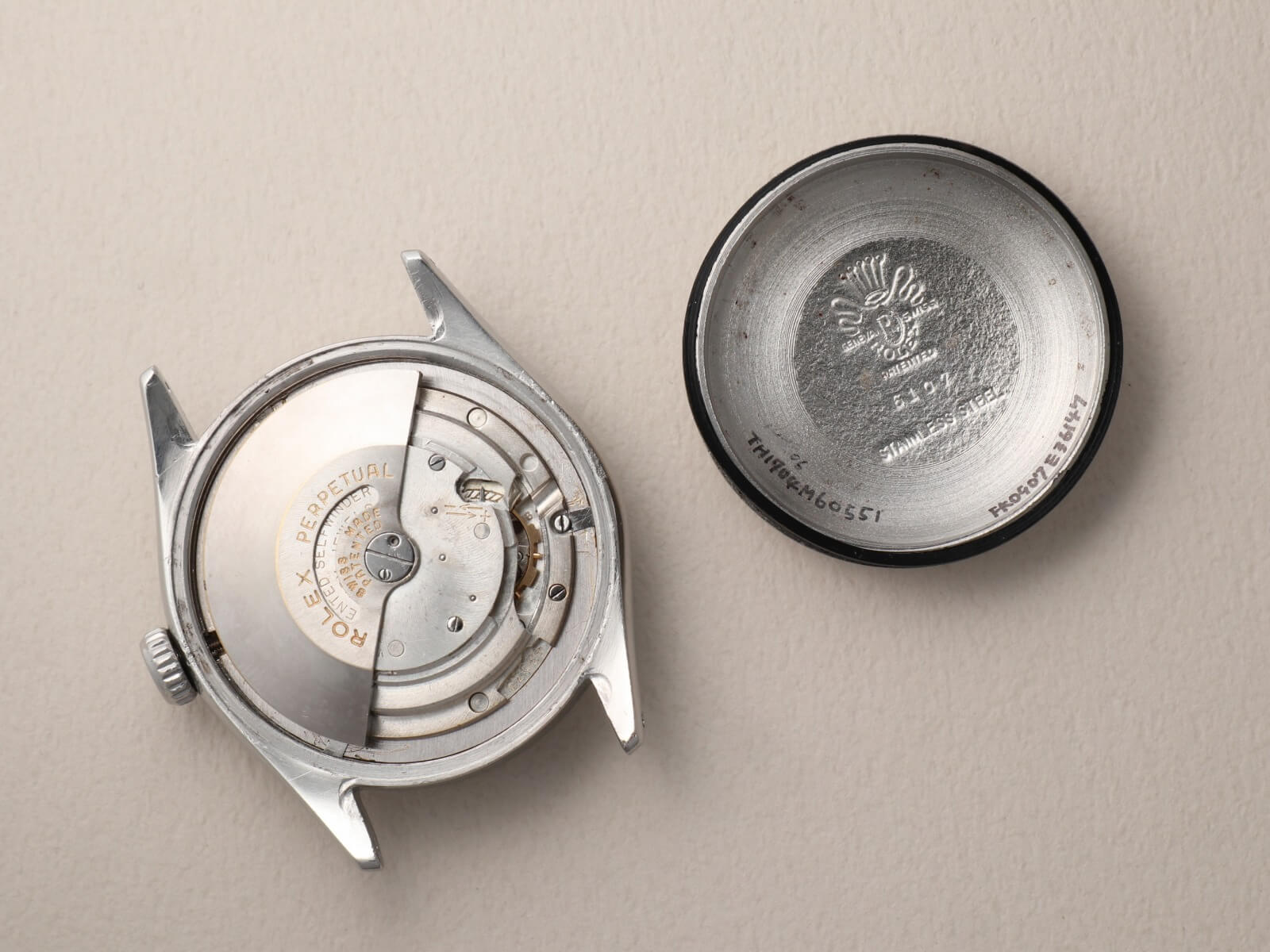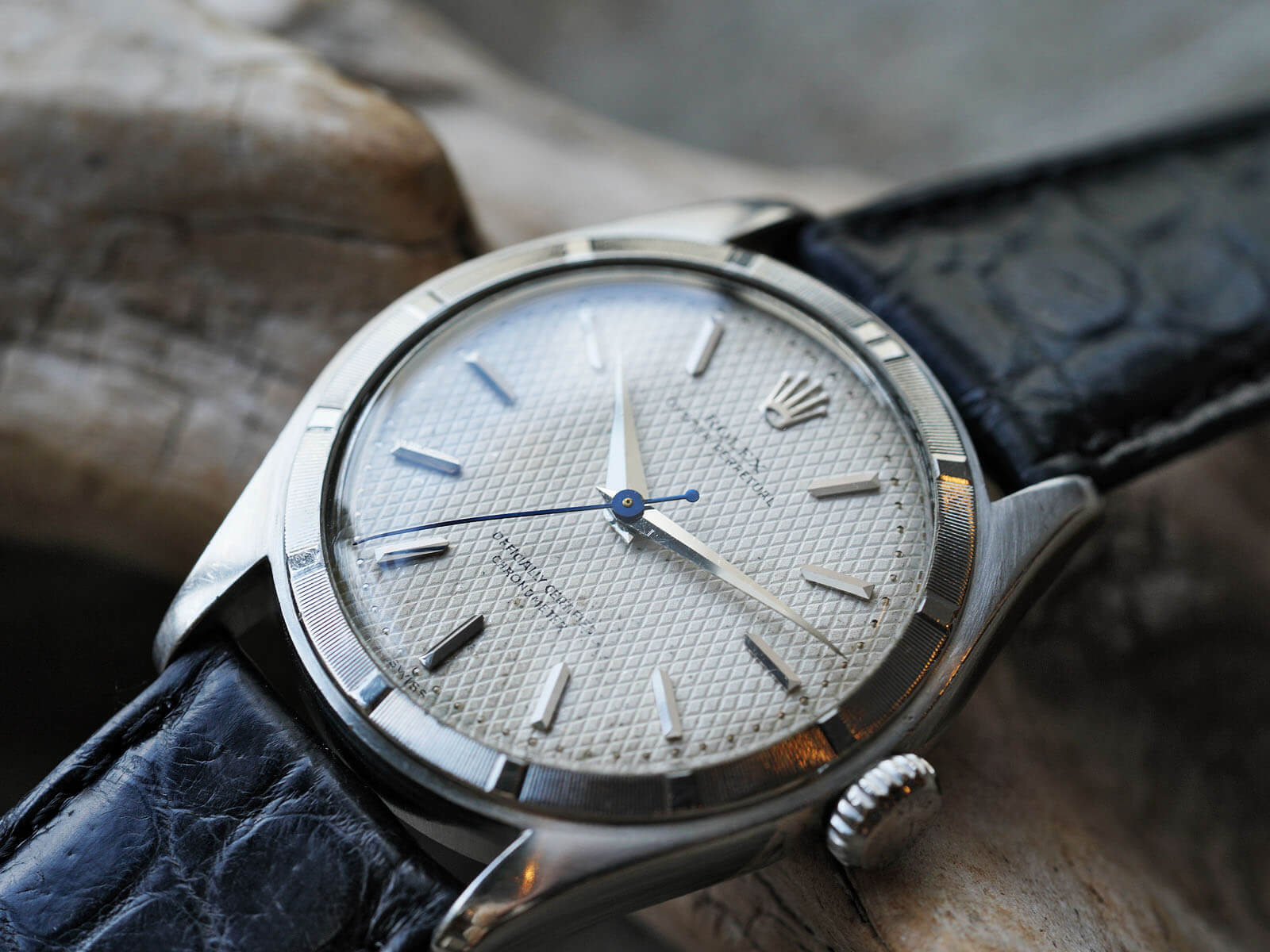 | 廃盤メンズモデル 世界で初めて完全防水自動巻き腕時計を開発したロレックス。手巻ベースの機械に自動巻ローターを搭載したことで厚みが増してしまい、特徴的な膨らみを持った裏蓋の完全防水ケースを開発。正式名称はオイスターパーペチュアルで、裏蓋が泡のように膨らんでいることから、アメリカで愛称として「バブルバック」と呼ばれるようになりました。40年代の秒針がセンターに切り替わり始めていた時代に、防水、自動巻き、高精度クロノメーター認定を実現した、正に夢のような時計として存在しました。 今回ご紹介のRef6107は、[ セミバブルバック / Semi Bubble back ] と呼ばれる、バブルバックの最終モデルです。裏蓋がやや膨れたステンレス製のスクリューバックケースに、傾斜の付いたエンジンターンドベゼルを装備し、経年変化で味のある風合いを魅せるホワイトハニカムダイヤルとドルフィンハンド、バレットインデックス、綺麗なブルースチール加工の秒針がヴィンテージ感を引き立たせてくれます。「ROLEX OYSTER」と刻印された、ねじ込み式では無いリューズ(スーパーオイスターリューズ)が採用されており、様々な変遷のあった時代特有のディテールが、ヴィンテージロレックスの魅力を堪能させてくれる逸品です。 ムーブメントは、ダイヤルに表記された「Officially Certified Chronometer」の文字が表す通り、自動巻クロノメーター規格を通過したキャリバー645を搭載。多くのバブルバックモデルに搭載された、名機キャリバー630の基本構造はそのままに、よりフラット化を実現。1950年代より高い視認性を求める傾向となり、紳士用腕時計に拡大化が求められ、バブルバックよりも大型化されました。後に開発された名機キャリバー1030へと変わっていくことで、セミバブルは製造期間が短く、とても貴重な存在です。 レザーブレスには、当店オリジナルのクロコダイルレザーのブラックをセレクト。洗練された美しさと趣のある存在感を示し、目にする人を魅了してくれる素晴らしい時計です。是非店頭にてご覧ください。 |