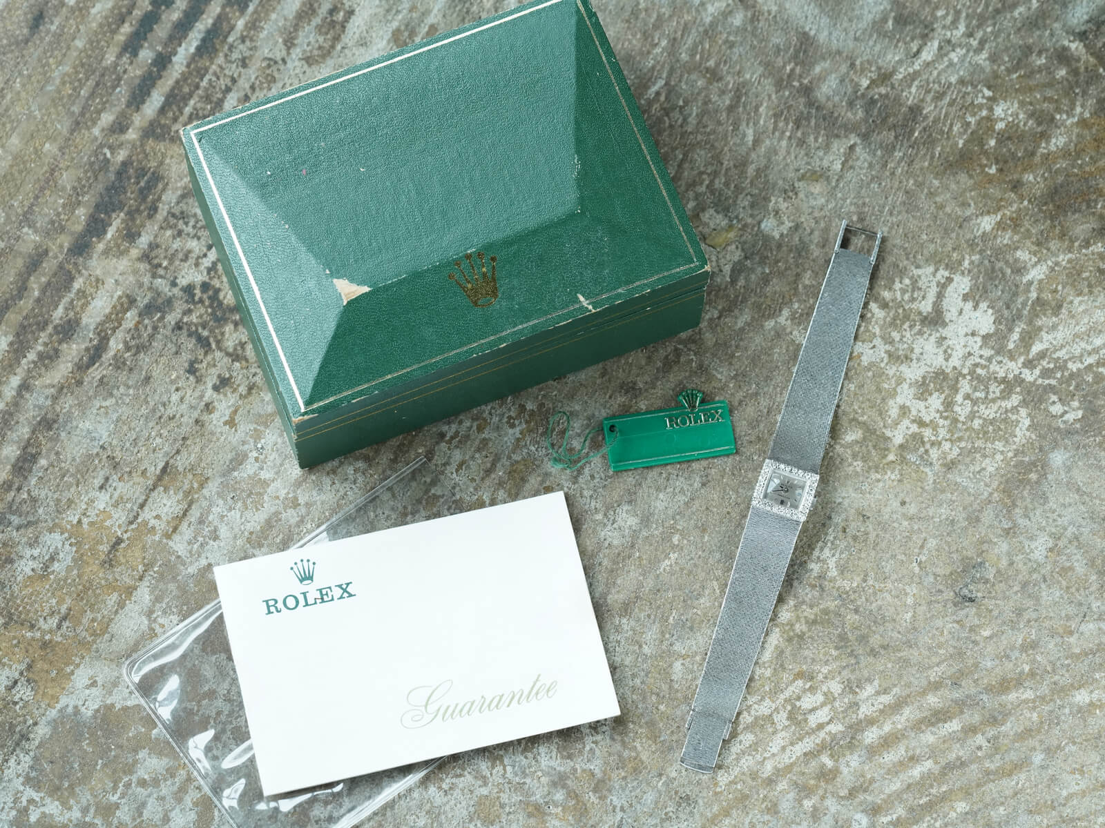 | 廃盤レディースモデル ヴィンテージロレックスのダイヤルに入った、「正確、精密」と言う意味を持つ「Precision / プレシジョン」の文字。時計の精度を競い合っていた時計業界の中で、主にクロノメーター認定を受けていないモデルに使われた、認定をパスしていなくても、高い精度と信頼性を持つムーブメントである事を示したシリーズ名です。 今回は、ホワイトゴールドのラグジュアリーな美しさが印象的なモデルRef.2166のご紹介です。細かくパヴェダイヤがセッティングされた、綺麗なスクエアケースで美しく優美なジュエリーテイストを演出し、気高く貫禄をも感じさせてくれます。誰もが知るブランド・ロレックスとは違った印象の、優雅で上品な佇まいを感じさせる素晴らしいモデルです。 搭載ムーブメントは、メンテナンス性に優れたキャリバー1400。代表的モデルのカメレオンに多く搭載された信頼性の高いムーブメントです。 ブレスレットは、非純正品ではありますが、綺麗なバーク模様の施されたホワイトゴールド製ヴィンテージブレスが付属されております。購入日付の記載はありませんが、シリアル番号の合致したメーカーギャランティとメーカー純正ボックスも付属。現代とは異なるジュエリー感覚が際立ち、人を惹きつける魅力を持った至高の逸品。是非店頭にてご覧ください。 |