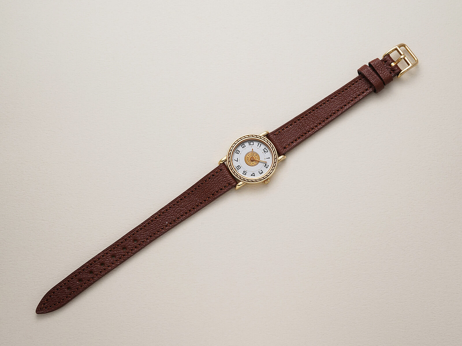| 廃盤レディースモデル ベゼルのステッチ模様とダイヤル中央にあるセリエコインのシンボルデザインで、エルメスが好きな人だけでなく、世界中の女性に愛され続ける上品で高級感の感じられる時計です。 今回は、ディスコンとなった貴重なモデルRef.8330「 セリエ / Serie 」のご紹介です。ラウンドケースのベゼル部分に模様が施された綺麗な曲線に、アラビア表記されたホワイトダイヤルで、上品な女性らしさを感じさせる綺麗なデザイン。綺麗な光沢を放つイエローゴールドケースが、さりげなくエレガントに、クラシカルなドレステイストを感じさせてくれる素敵なモデルです。 ムーブメントは、時間合わせの必要の無いクオーツムーブメントなので、故障も少なくメンテナンス性に優れております。 レザーブレスには、CASSIS社製のゴートスキンレザーのブラウンをセレクト。貴重な純正尾錠も付属しておりますので、ともにお使い頂くことをお勧め致します。エルメスらしさと気品を漂わせてくれるお奨めの一本を是非店頭にてご覧ください。 |