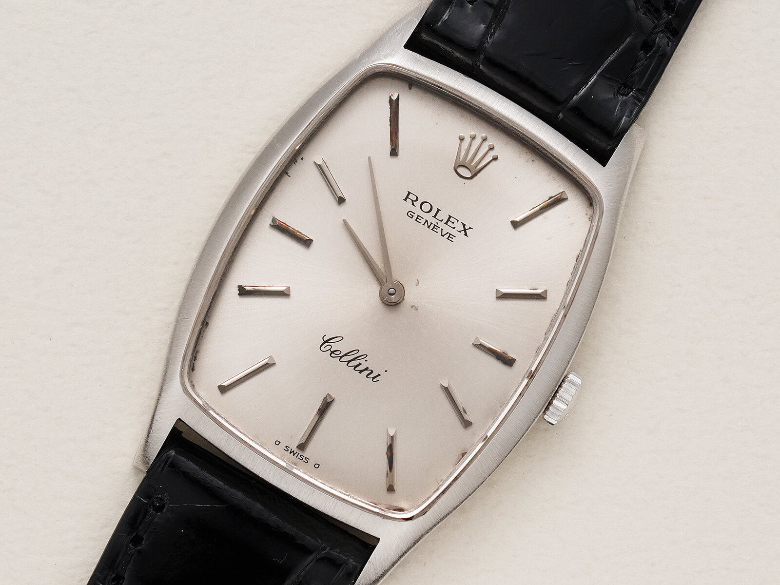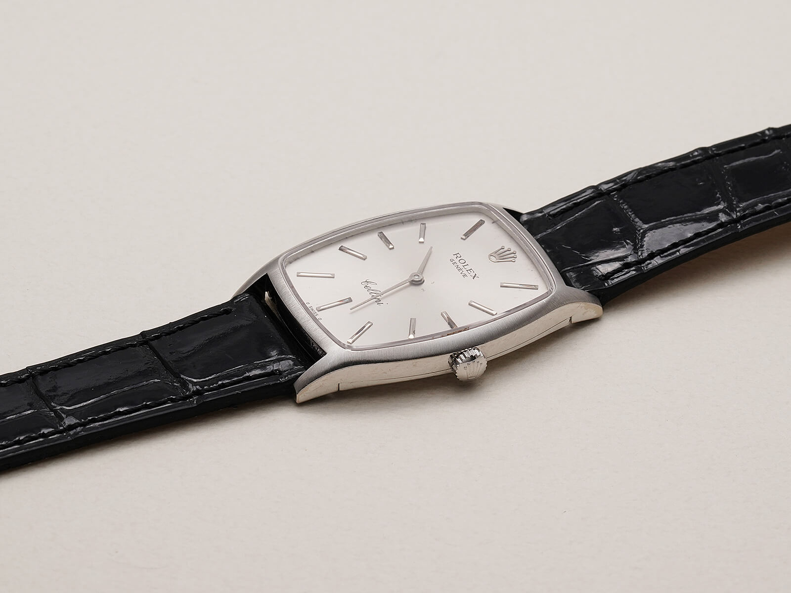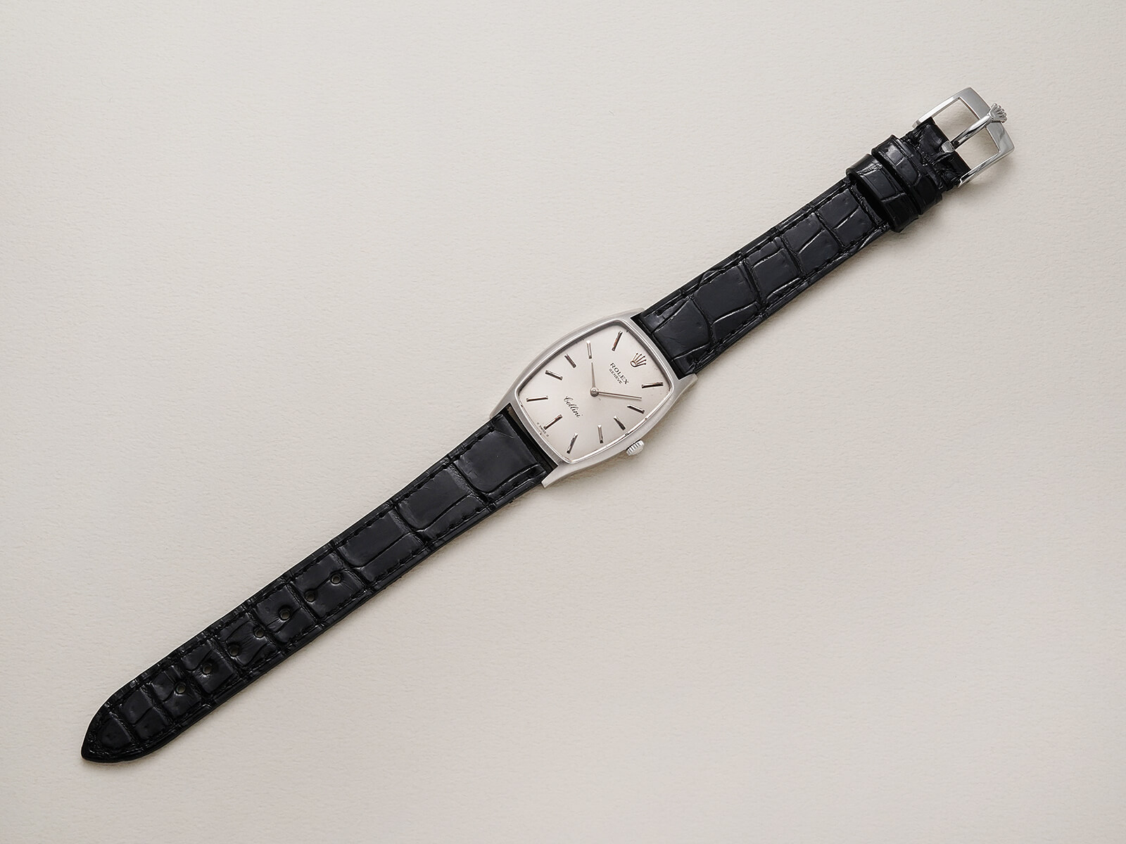 | 廃盤メンズモデル 16世紀のイタリアルネッサンスの彫刻師であるベンベヌト・チェリーニに由来する、純粋なドレスウォッチシリーズであるロレックスの「Cellini / チェリーニ」。実用性を重視した防水・防塵を表すオイスターケースの自動巻きモデルに人気が集中していますが、誰もが知る有名ブランドの別の一面と言える、優雅で上品な佇まいを感じさせるお洒落なシリーズです。 今回のご紹介は、シンプルで端正なラインの美しいモデルRef.3809-4-709です。柔らかい曲線で表現されたホワイトゴールド製トノーケースが、気品ある雰囲気を演出した綺麗なデザイン。サンバースト加工の施されたシルバーダイヤルに、シャープなバーインデックスとペンシルハンドの2針仕様で知性と品格を印象づけることのできるロレックスらしい素晴らしいモデルです。6時下に表記された「シグマ/σ」マークは、インデックス等に金性の素材が使用されている事を表しております。 ムーブメントは、キャリバー1600手巻き式を搭載。多くのチェリーニに使用され、精度とメンテナンス性は勿論高く、ドレスウォッチとして薄いケースを実現した名機です。 レザーブレスには、当店オリジナルのクロコダイルレザーベルトのシャイニーブラックをセレクト。王冠マークの付いた貴重なステンレス製純正尾錠も付属しておりますので、共にお使いいただく事をお勧めいたします。お洒落で美しく、さりげない高級感を感じさせてくれる素敵な時計です。是非店頭にてご覧ください。 |