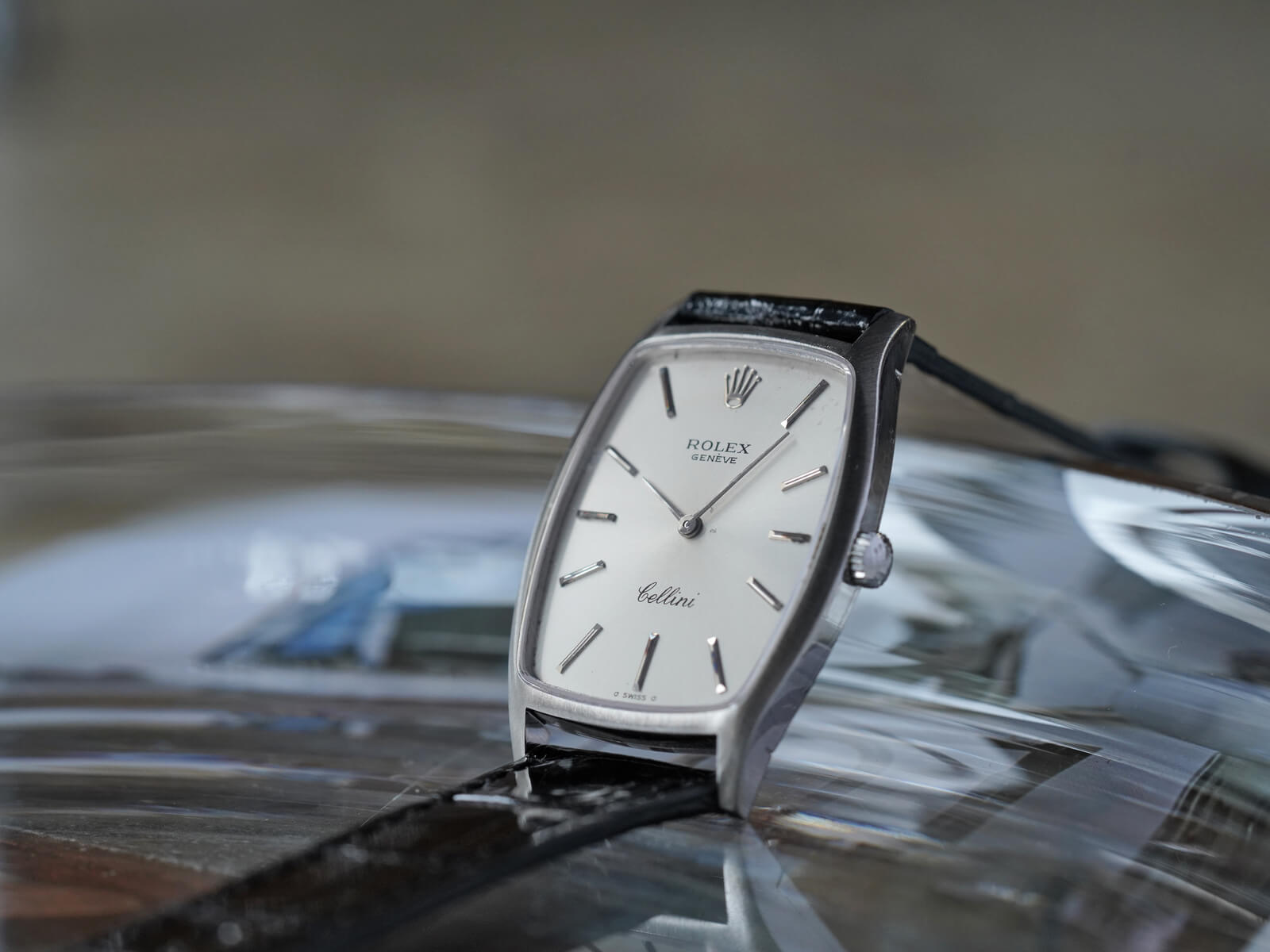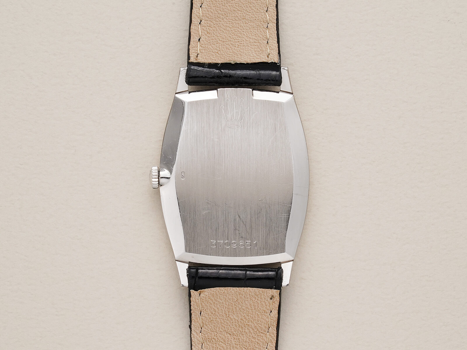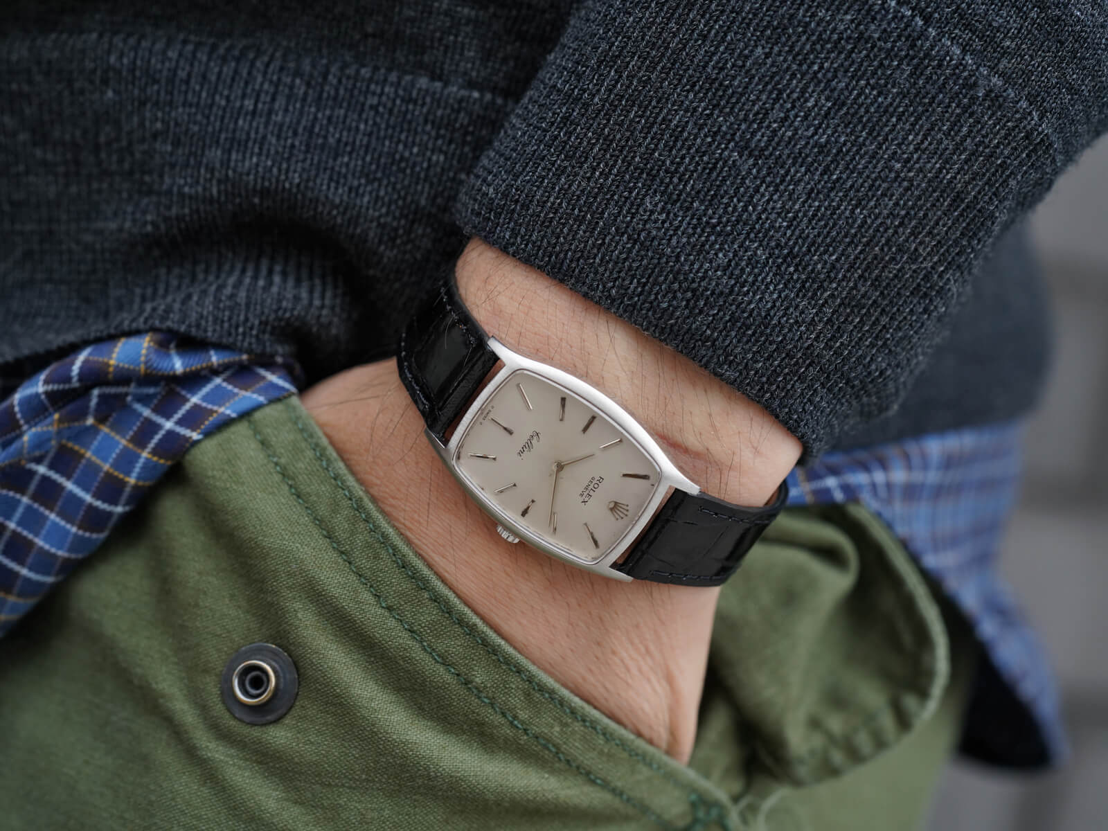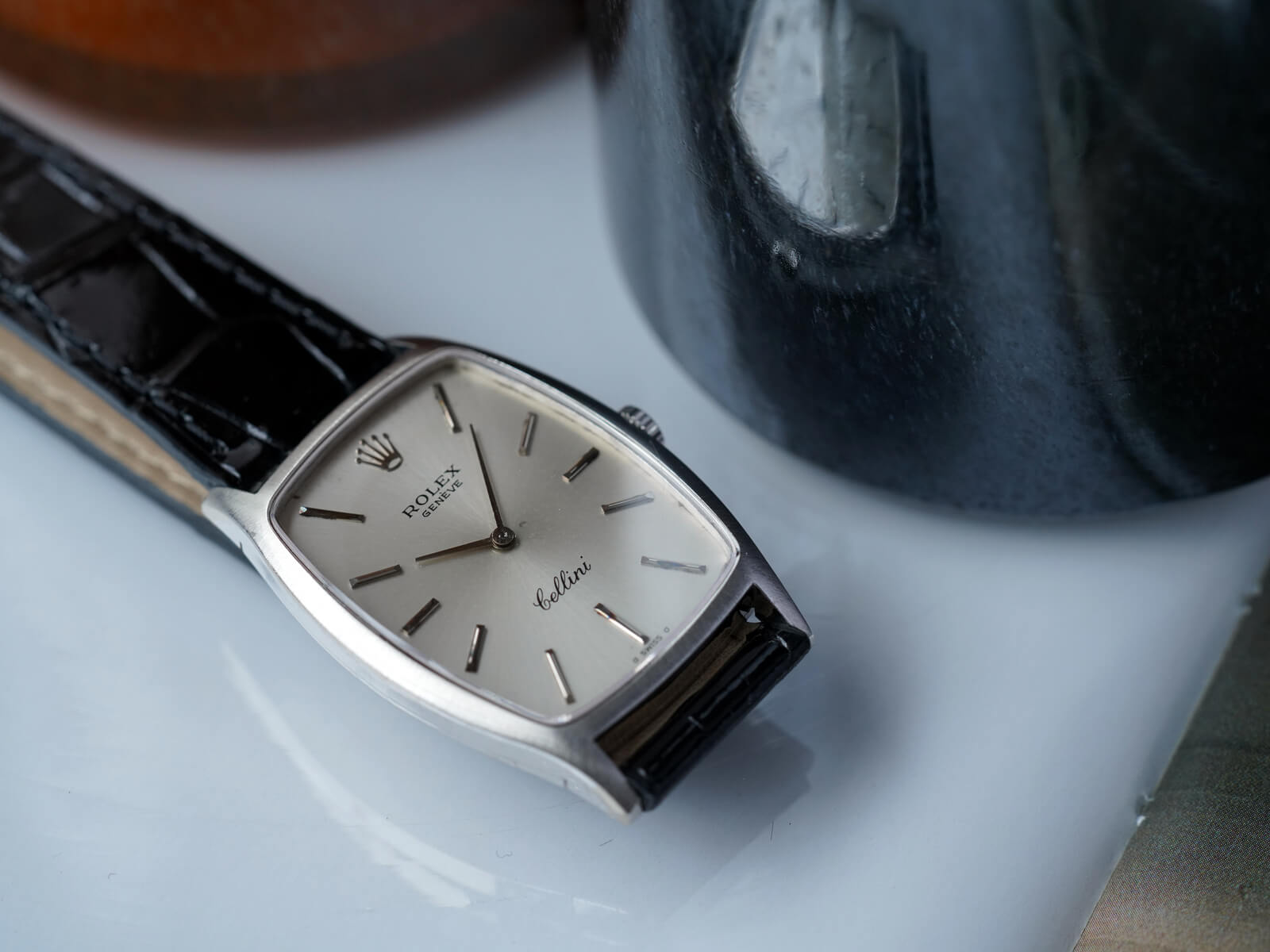 | 廃盤メンズモデル 16世紀のイタリアルネッサンスの彫刻師であるベンベヌト・チェリーニに由来する、純粋なドレスウォッチシリーズであるロレックスの「Cellini / チェリーニ」。実用性を重視した防水・防塵を表すオイスターケースの自動巻きモデルに人気が集中していますが、誰もが知る有名ブランドの別の一面と言える、優雅で上品な佇まいを感じさせるお洒落なシリーズです。 今回のご紹介は、シンプルで端正なラインの美しいモデルRef.3809-4-709です。柔らかい曲線で表現されたホワイトゴールド製トノーケースが、気品ある雰囲気を演出した綺麗なデザイン。サンバースト加工の施されたシルバーダイヤルに、シャープなバーインデックスとペンシルハンドの2針仕様で知性と品格を印象づけることのできるロレックスらしい素晴らしいモデルです。6時下に表記された「シグマ/σ」マークは、インデックス等に金性の素材が使用されている事を表しております。 ムーブメントは、キャリバー1600手巻き式を搭載。多くのチェリーニに使用され、精度とメンテナンス性は勿論高く、ドレスウォッチとして薄いケースを実現した名機です。 レザーブレスには、当店オリジナルのクロコダイルレザーベルトのシャイニーブラックをセレクト。王冠マークの付いた貴重なステンレス製純正尾錠も付属しておりますので、共にお使いいただく事をお勧めいたします。お洒落で美しく、さりげない高級感を感じさせてくれる素敵な時計です。是非店頭にてご覧ください。 |