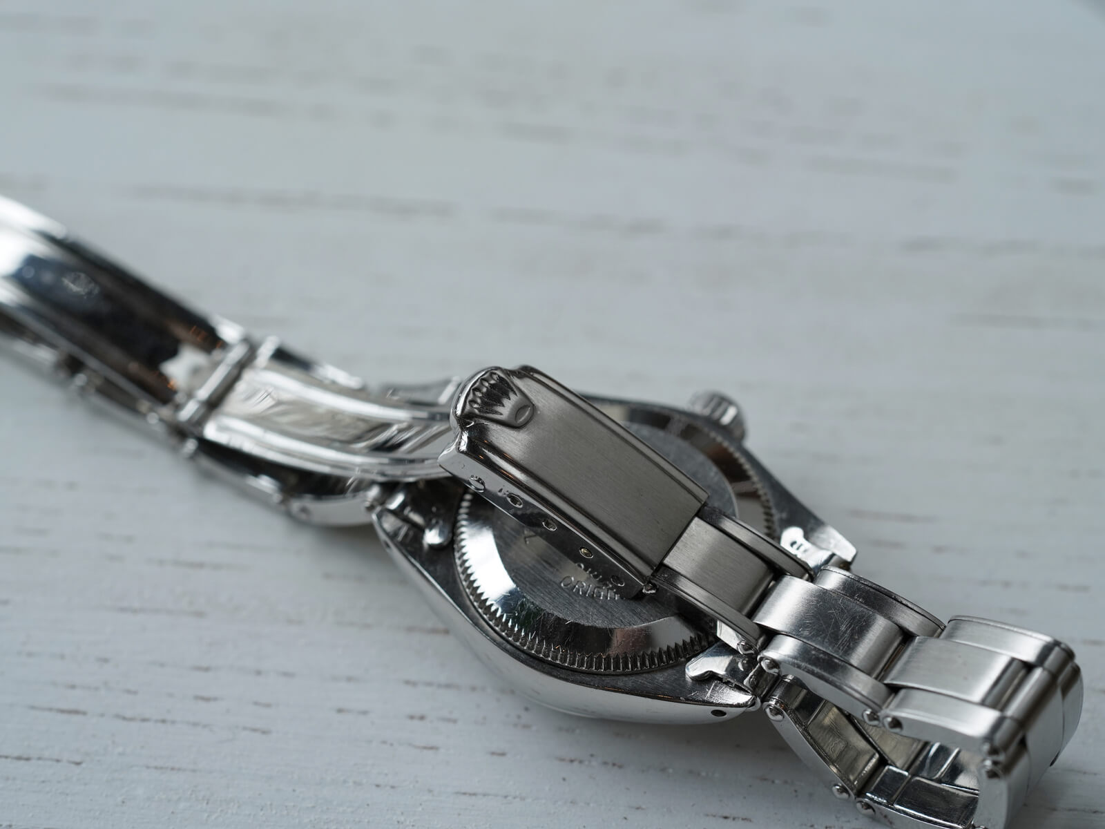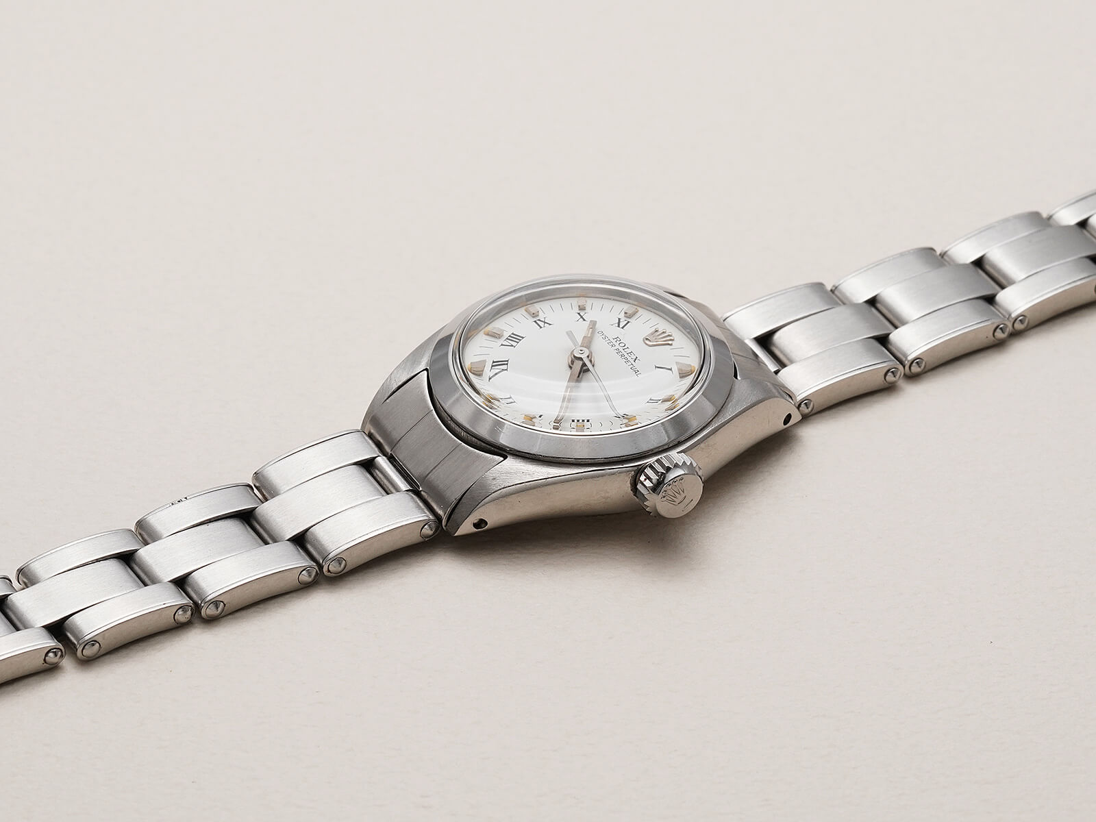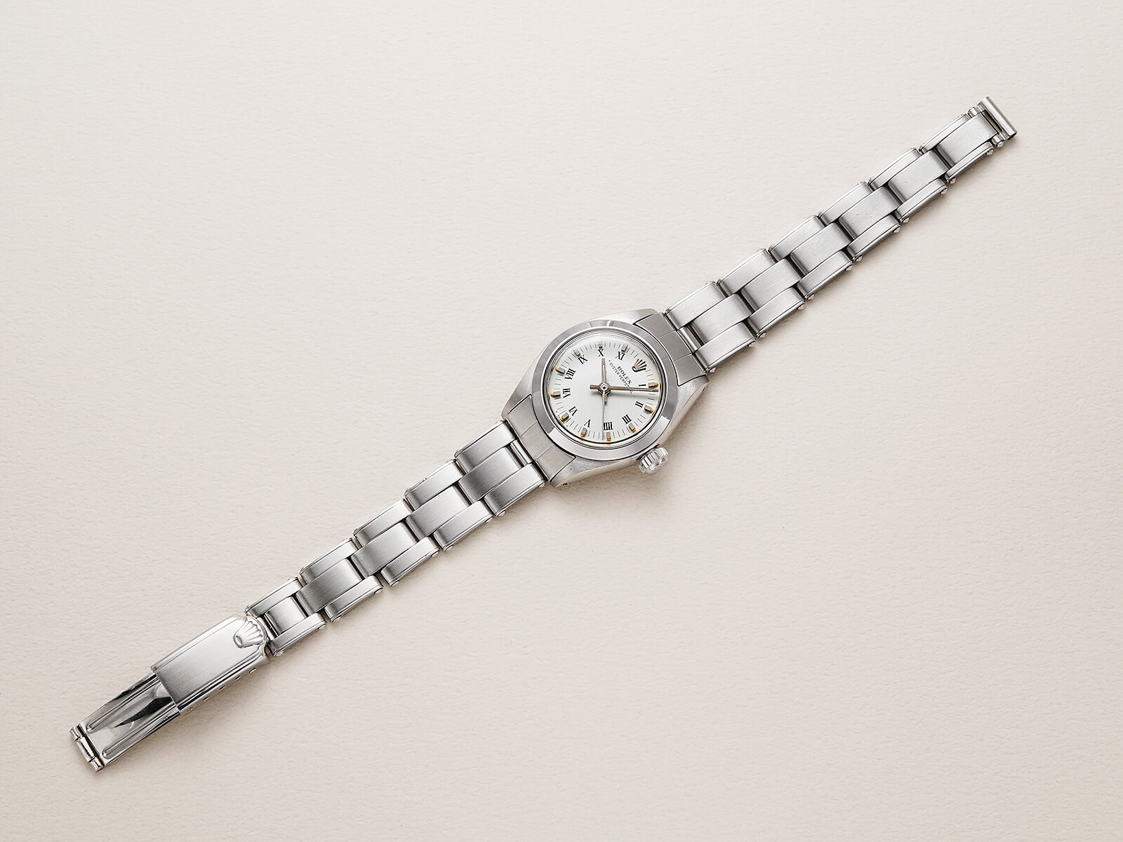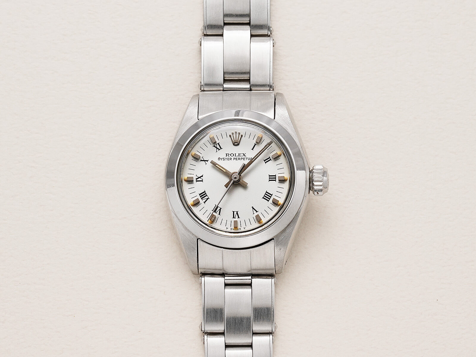 | レディースモデル ヴィンテージロレックスの中でも重要な防水・防塵ケースを表すオイスターケースと、自動巻きを表す「Oyster Perpetual / オイスターパーペチュアル」。その二つの機能で、日付表示の無いノンデイトのシンプルなスタイルが魅力的なモデルです。 今回ご紹介のRef.6718は、ロレックスにおいて非常にレアな存在である、ホワイトローマンダイヤルのモデルです。ショートインデックスと可愛らしいローマ数字との組み合わせがバランスが良く、ロレックスらしい実用性に、お手元をエレガントに演出してくれる素晴らしいデザインです。 ムーブメントは、キャリバー2030を搭載。25mmとコンパクトながら卓越した精度と耐久性を持った傑作ムーブメントで、信頼性も高く、メンテナンスもパーツが豊富に存在するので、末永くお使い頂けます。 ブレスレットは、廃番となった王冠が飛び出た様な形の通称”デベソバックル”に純正13㎜「3連リベッドブレス/Riveted Bracelet」が付属し、50年以上前のものとは思えない素晴らしいコンディション。シリアルナンバーの頭が7になっていますが、型番、キャリバーより69年製と特定し、ケースがメーカーにて交換され新しくなっていると思われます。シンプルで独特な存在感でラグジュアリーな要素を感じさせるお奨めの逸品。 是非店頭にてご覧ください。 |