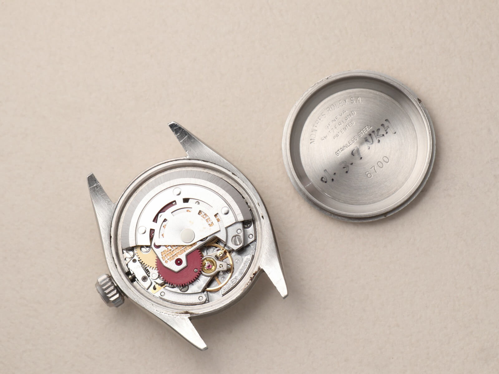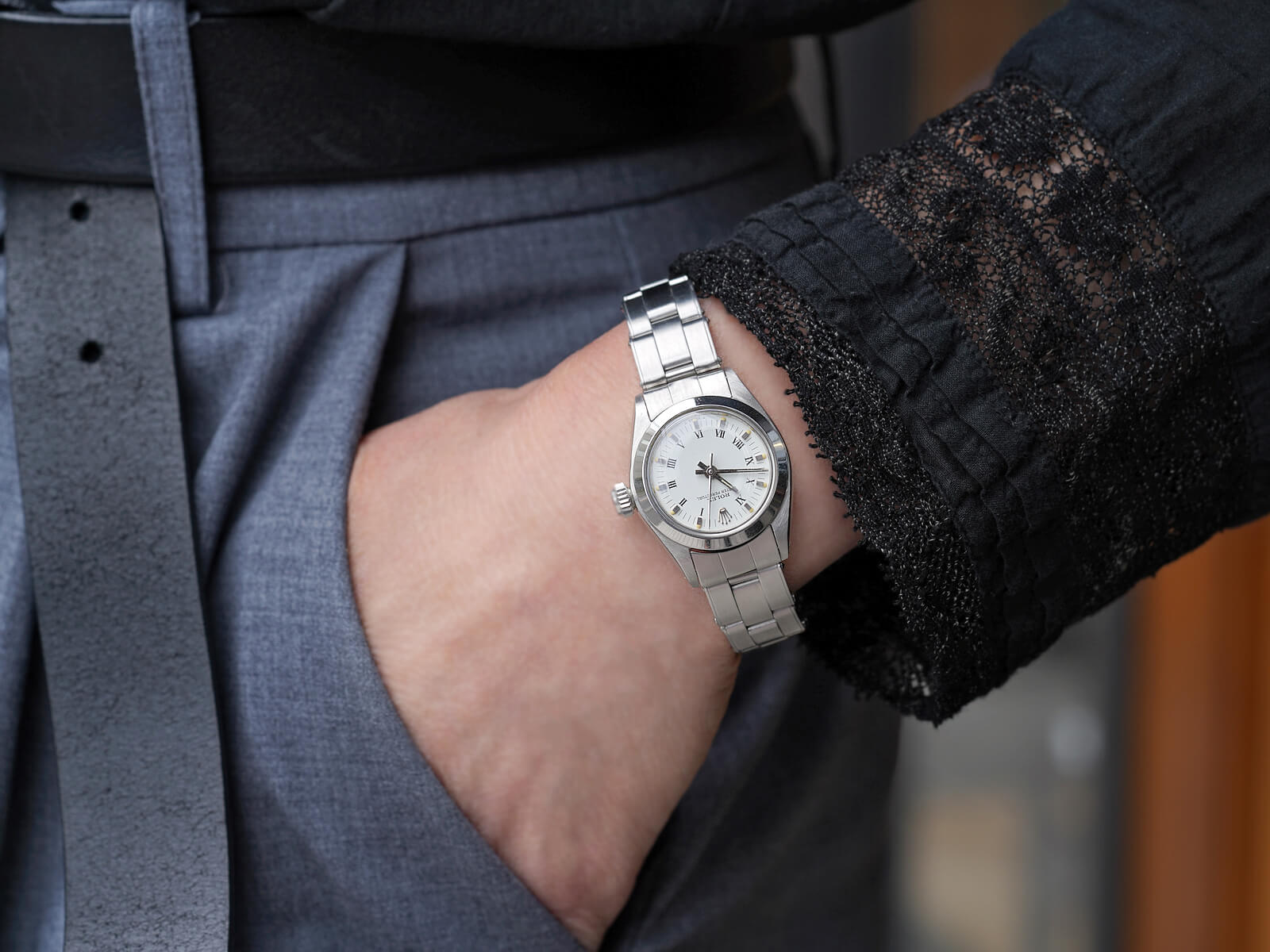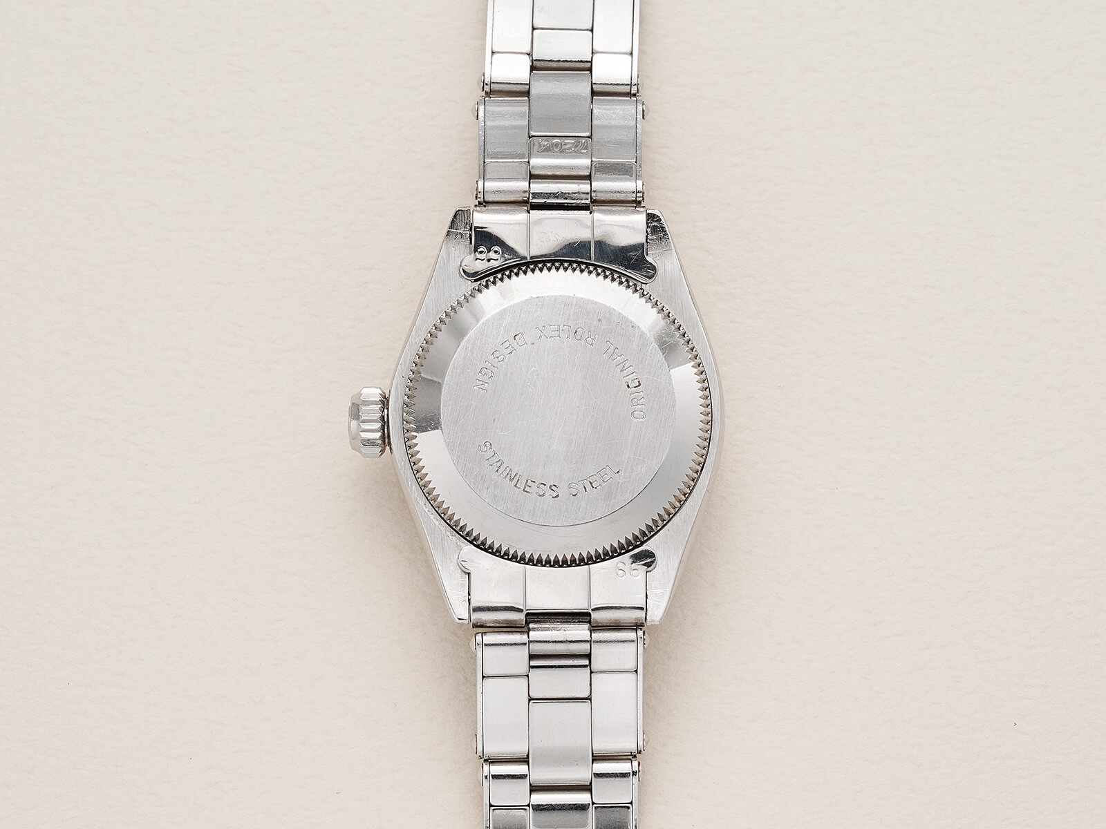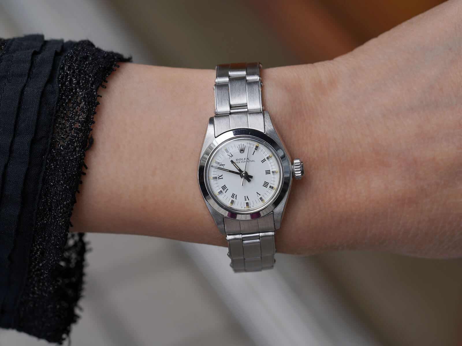 | レディースモデル ヴィンテージロレックスの中でも重要な防水・防塵ケースを表すオイスターケースと、自動巻きを表す「Oyster Perpetual / オイスターパーペチュアル」。その二つの機能で、日付表示の無いノンデイトのシンプルなスタイルが魅力的なモデルです。 今回ご紹介のRef.6718は、ロレックスにおいて非常にレアな存在である、ホワイトローマンダイヤルのモデルです。ショートインデックスと可愛らしいローマ数字との組み合わせがバランスが良く、ロレックスらしい実用性に、お手元をエレガントに演出してくれる素晴らしいデザインです。 ムーブメントは、キャリバー2030を搭載。25mmとコンパクトながら卓越した精度と耐久性を持った傑作ムーブメントで、信頼性も高く、メンテナンスもパーツが豊富に存在するので、末永くお使い頂けます。 ブレスレットは、廃番となった王冠が飛び出た様な形の通称”デベソバックル”に純正13㎜「3連リベッドブレス/Riveted Bracelet」が付属し、50年以上前のものとは思えない素晴らしいコンディション。シリアルナンバーの頭が7になっていますが、型番、キャリバーより69年製と特定し、ケースがメーカーにて交換され新しくなっていると思われます。シンプルで独特な存在感でラグジュアリーな要素を感じさせるお奨めの逸品。 是非店頭にてご覧ください。 |