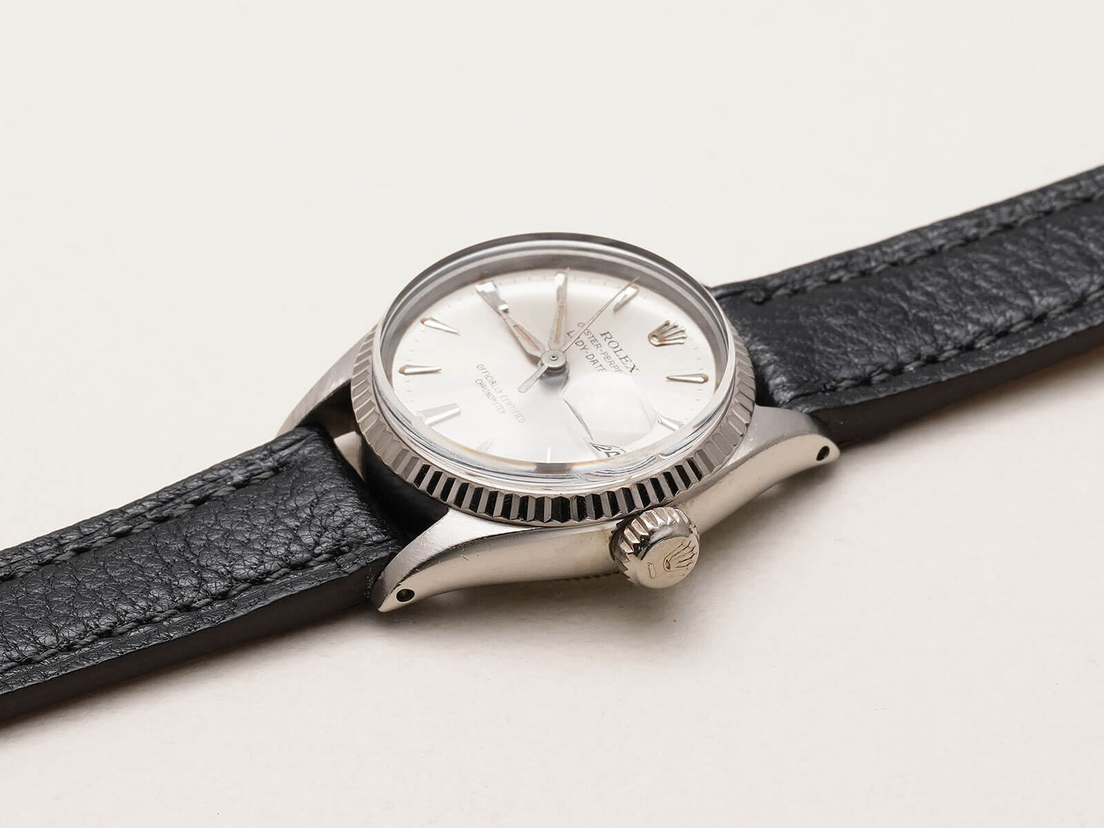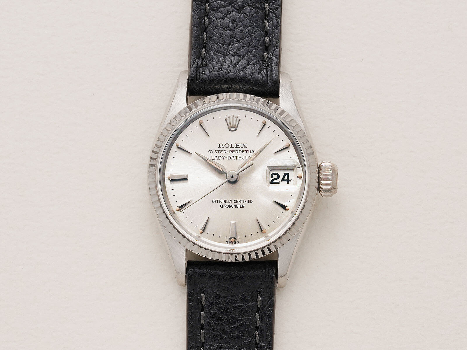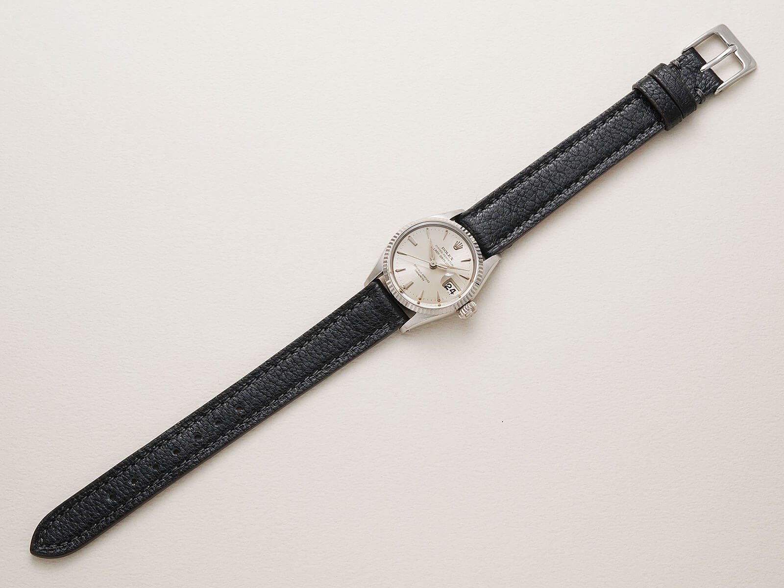 | レディースモデル 「Oyster perpetual Datejust / オイスターパーペチュアルデイトジャスト」。オイスターケース、パーペチュアル機能、デイトジャスト機能の3大発明が全て詰まったロレックスを語る上で欠かせないモデル。世界的に普通性とラグジュアリーを提供する代名詞でもあります。 今回は、女性のために製作された「Lady-Datejust / レディーデイトジャスト 」Ref.6517のご紹介です。通常はステンレスケースのモデルですが今回の個体は大変貴重なホワイトゴールドケース。少し黄色味掛かったホワイトゴールドはこの時代の特徴的なディティールです。往年のディテールであるフルーテッドベゼルと、サンバースト加工の施されたシルバーダイヤルに、特徴的で形の良い立体クサビインデックスとアルファハンドが、現在のロレックスとは一線を画す素晴らしいデザインです。 ムーブメントには、6時側に記載された「Officially Certified Chronometer」の文字が表す通り、スイス公認のクロノメーター規格を通過した、キャリバー1130を搭載。通称ユニコーンローターと呼ばれる、当時の特徴的なパーツがセッティングされ、ボーイズやレディースモデルに多く搭載された名機です。シンプルな構造でメンテナンス性も高く、安心してお使い頂けます。 レザーブレスには、当店オリジナルのアニリンゴートスキンのブラックをセレクトしております。凛々しい顔立ちで、大人の雰囲気を格上げしてくれる素晴らしい時計です。是非店頭にてご覧ください。 |
