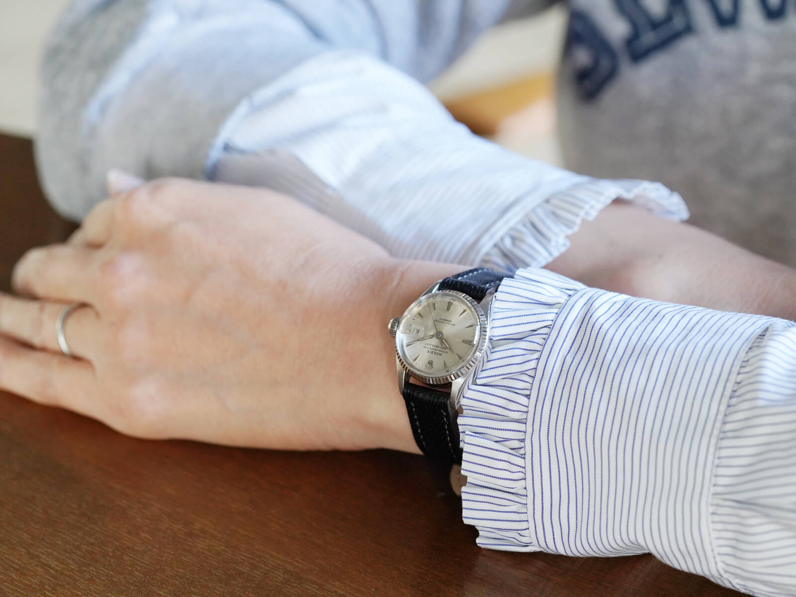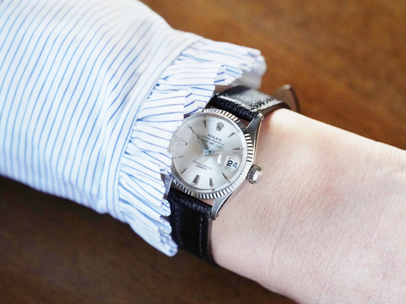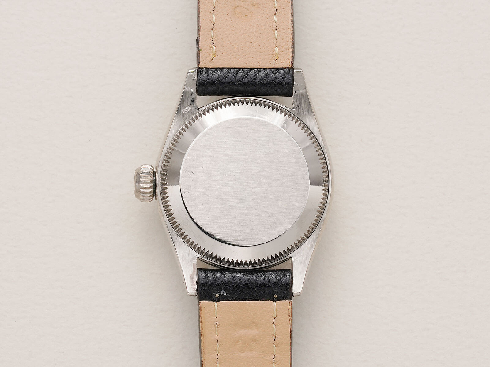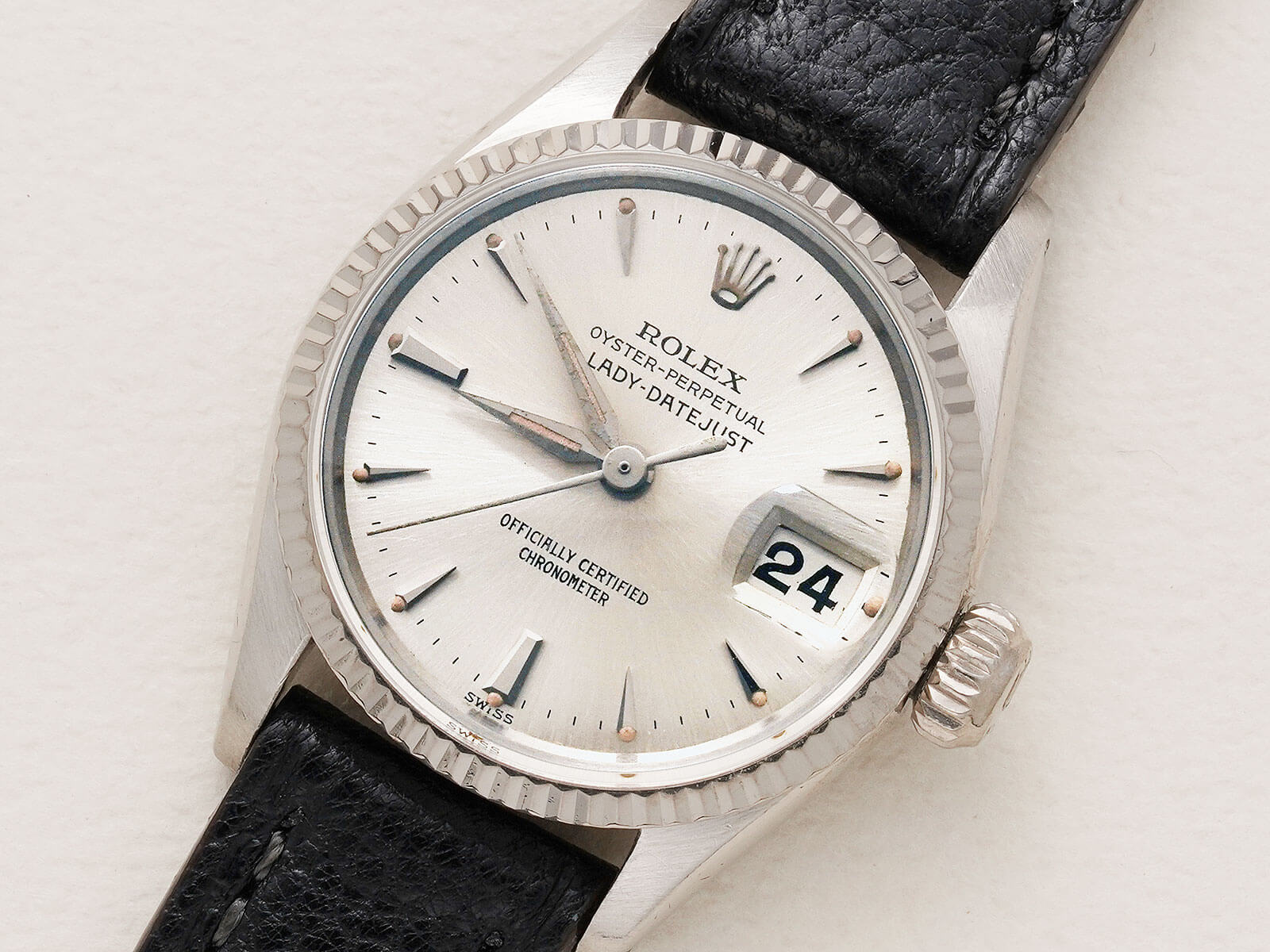 | レディースモデル 「Oyster perpetual Datejust / オイスターパーペチュアルデイトジャスト」。オイスターケース、パーペチュアル機能、デイトジャスト機能の3大発明が全て詰まったロレックスを語る上で欠かせないモデル。世界的に普通性とラグジュアリーを提供する代名詞でもあります。 今回は、女性のために製作された「Lady-Datejust / レディーデイトジャスト 」Ref.6517のご紹介です。通常はステンレスケースのモデルですが今回の個体は大変貴重なホワイトゴールドケース。少し黄色味掛かったホワイトゴールドはこの時代の特徴的なディティールです。往年のディテールであるフルーテッドベゼルと、サンバースト加工の施されたシルバーダイヤルに、特徴的で形の良い立体クサビインデックスとアルファハンドが、現在のロレックスとは一線を画す素晴らしいデザインです。 ムーブメントには、6時側に記載された「Officially Certified Chronometer」の文字が表す通り、スイス公認のクロノメーター規格を通過した、キャリバー1130を搭載。通称ユニコーンローターと呼ばれる、当時の特徴的なパーツがセッティングされ、ボーイズやレディースモデルに多く搭載された名機です。シンプルな構造でメンテナンス性も高く、安心してお使い頂けます。 レザーブレスには、当店オリジナルのアニリンゴートスキンのブラックをセレクトしております。凛々しい顔立ちで、大人の雰囲気を格上げしてくれる素晴らしい時計です。是非店頭にてご覧ください。 |
