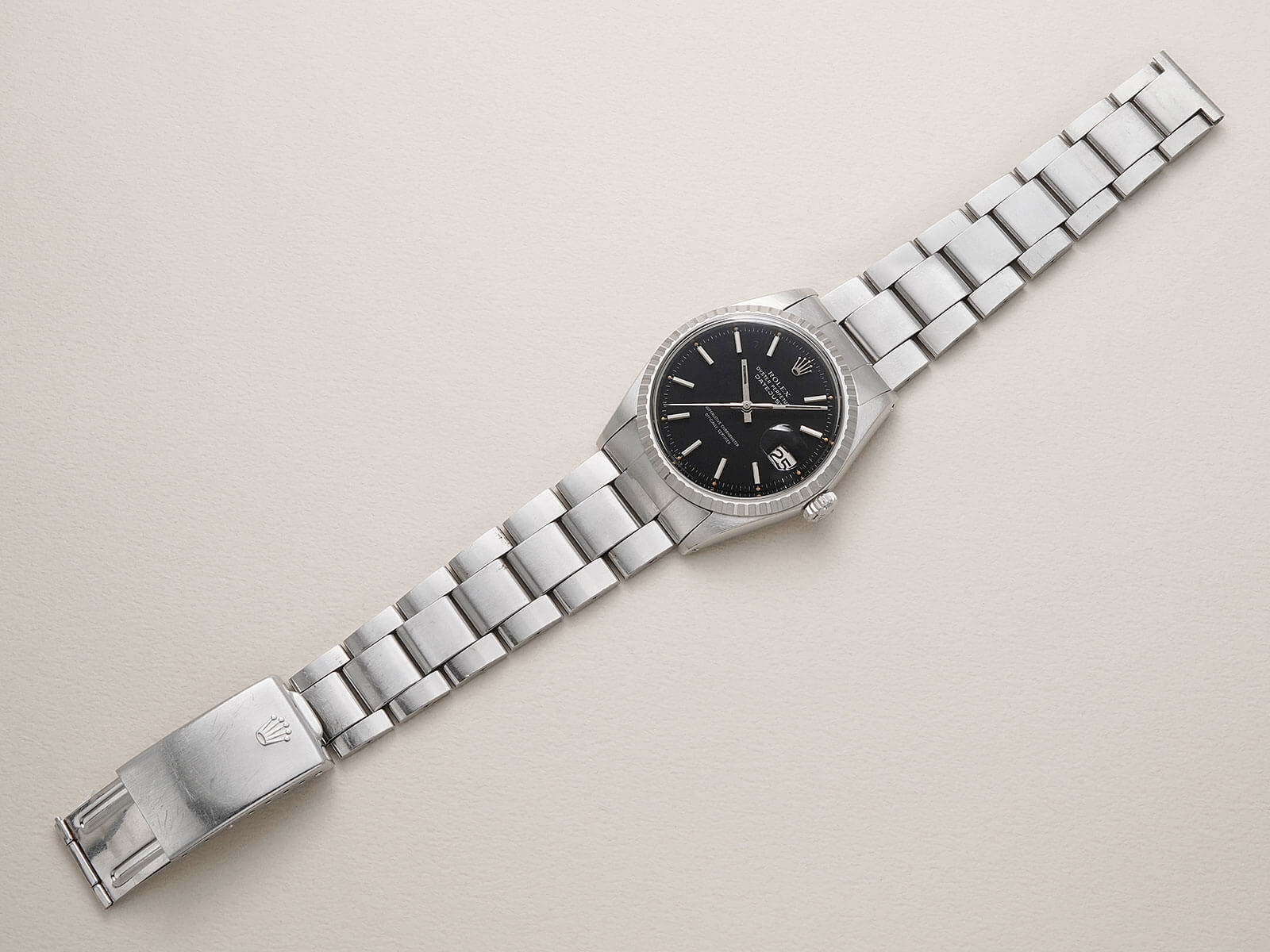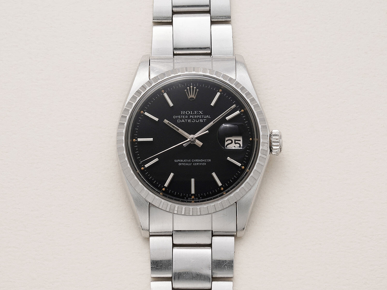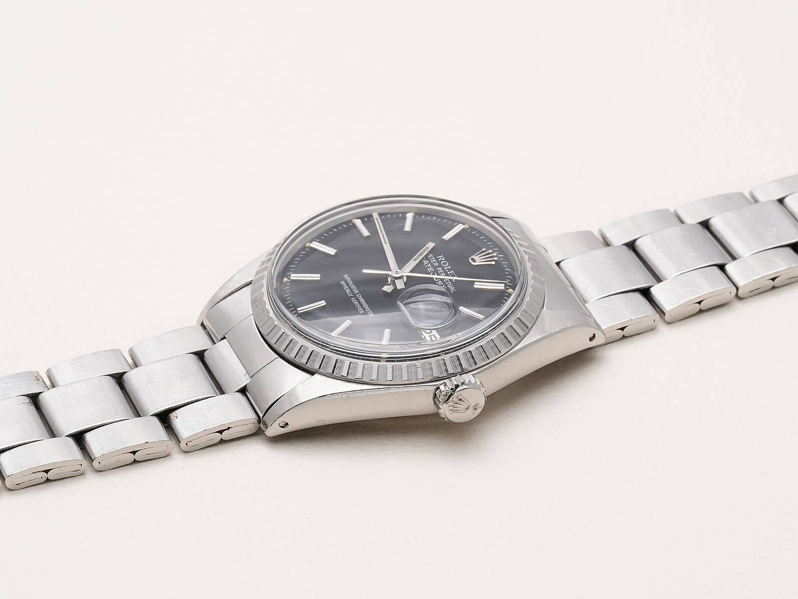 | メンズモデル ヴィンテージロレックスを語る上で欠かせない「Oyster Perpetual Datejust / オイスターパーペチュアルデイトジャスト」。オイスターケース、パーペチュアル機能、デイトジャスト機能の3大発明と、ロレックスを語る上で欠かせないモデルです。 今回ご紹介のRef.1603は、1600系の中でも人気の高いステンレス製エングレーブドベゼルのモデルです。注目すべき点は、諸説ありますが文字盤の黒を引き立たせる為に、赤の染料を散布したとされる短い期間のみ使われたレッドドットブラックダイヤルで、ミラーダイヤル同様の希少なディテールを持ち、世界規模となったロレックスの技術を語る傑作と言えます。トリチウム夜光や針のコンディションも良く、60年代の個体とは思えない程の綺麗なモデルです。 ムーブメントは、キャリバー1570を搭載。6時側に記載され「Superlative Chronometer Officially Certified」の文字が表す通り、スイス公認の高度な精度認定機関で知られるクロノメーター規格を通過した、高い精度と耐久性を持ち、メンテナンス性にも優れているので末永くお使い頂けます。 ブレスレットは、リベッドブレスから改良が施された3連巻き込みブレス7836・フラッシュフィット258を付属し、年代整合性の取れたディテールは、コレクターズアイテムとしてもお勧め出来ます。洗練さを追求したタイムレスなデザインで、ロレックスと一目でわかる魅力的な時計です。是非店頭にてご覧ください。 |