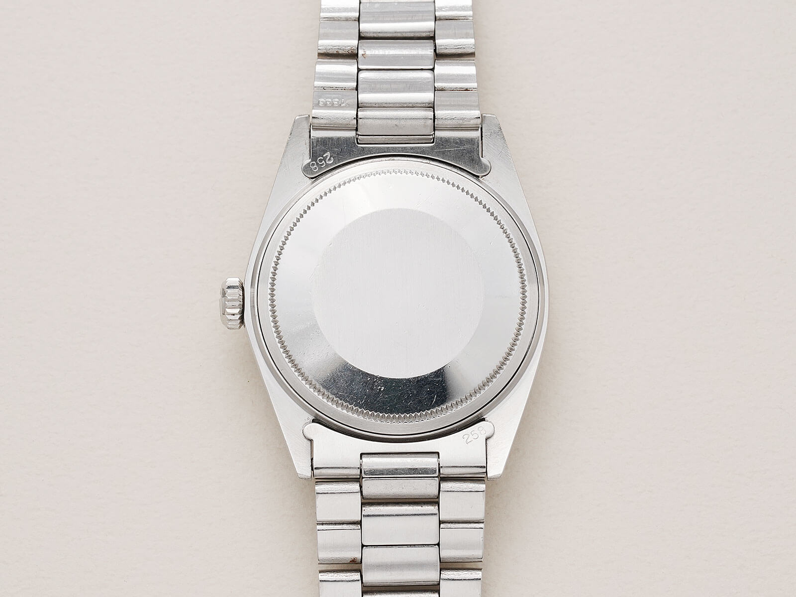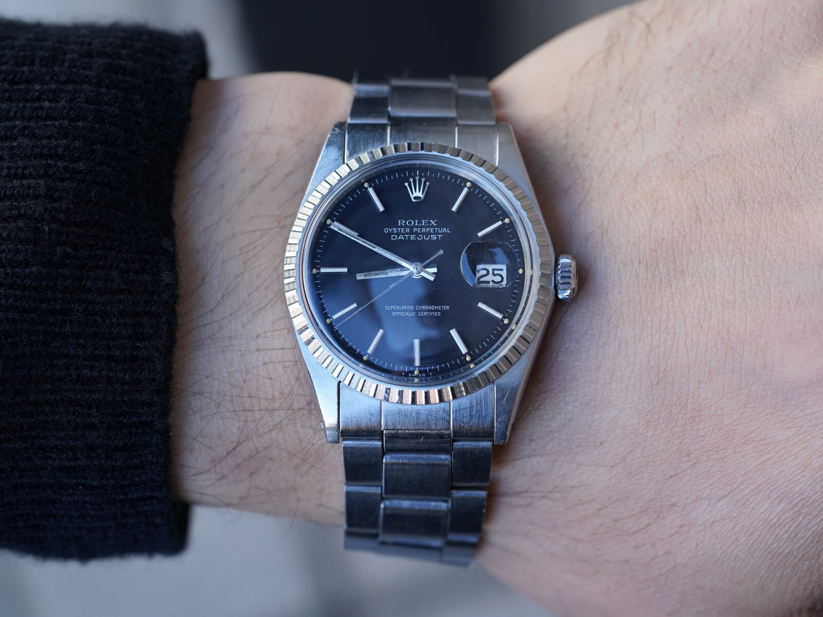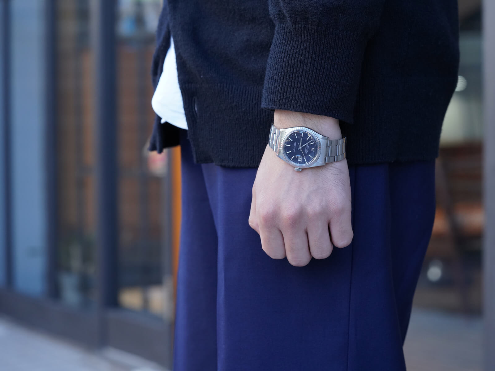 | メンズモデル ヴィンテージロレックスを語る上で欠かせない「Oyster Perpetual Datejust / オイスターパーペチュアルデイトジャスト」。オイスターケース、パーペチュアル機能、デイトジャスト機能の3大発明と、ロレックスを語る上で欠かせないモデルです。 今回ご紹介のRef.1603は、1600系の中でも人気の高いステンレス製エングレーブドベゼルのモデルです。注目すべき点は、諸説ありますが文字盤の黒を引き立たせる為に、赤の染料を散布したとされる短い期間のみ使われたレッドドットブラックダイヤルで、ミラーダイヤル同様の希少なディテールを持ち、世界規模となったロレックスの技術を語る傑作と言えます。トリチウム夜光や針のコンディションも良く、60年代の個体とは思えない程の綺麗なモデルです。 ムーブメントは、キャリバー1570を搭載。6時側に記載され「Superlative Chronometer Officially Certified」の文字が表す通り、スイス公認の高度な精度認定機関で知られるクロノメーター規格を通過した、高い精度と耐久性を持ち、メンテナンス性にも優れているので末永くお使い頂けます。 ブレスレットは、リベッドブレスから改良が施された3連巻き込みブレス7836・フラッシュフィット258を付属し、年代整合性の取れたディテールは、コレクターズアイテムとしてもお勧め出来ます。洗練さを追求したタイムレスなデザインで、ロレックスと一目でわかる魅力的な時計です。是非店頭にてご覧ください。 |