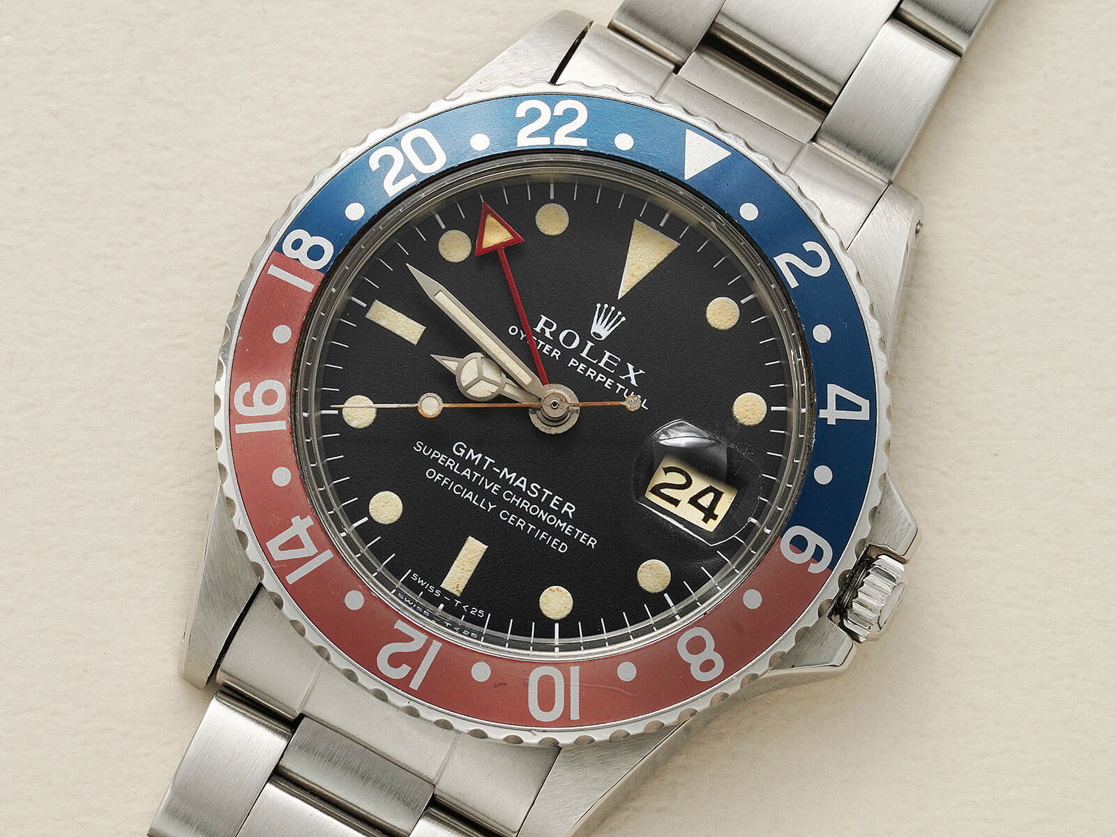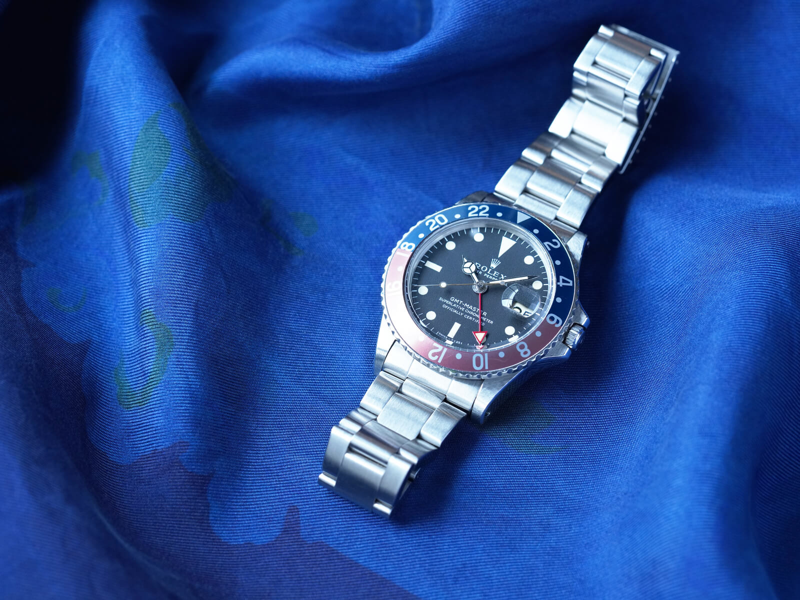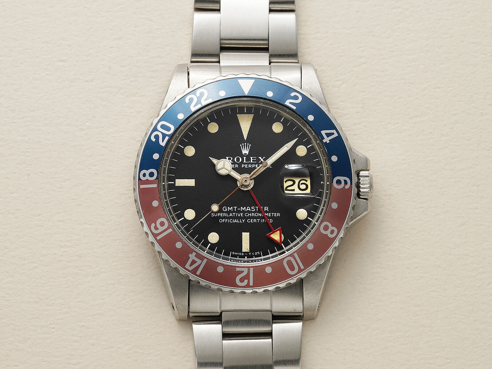 | 廃盤メンズモデル 第二次大戦時の軍事利用と開発を土台に、進化の進んだ航空機。世界中の一般の人々でも利用する機会が広がり、時代が劇的に変わっていきます。その中で1953年パン・アメリカン航空が、ロレックスに国際線パイロット用の時計開発を要請し、回転ベゼルで時差を示す初めての航空時計を製作。現在時刻の昼夜を判別し易く24時間ベゼルがツートンとなり、そのデザインが現在に至るまで象徴するアイコンとなります。 今回は、2018年にGMTマスターIIで同じカラーが復刻されたことにより、再び注目されているオリジナルモデルRef1675[GMT Master/GMTマスター]のご紹介です。通称”ペプシカラー”と言われる、印象的なアルミベゼルの艶感と色合いが秀逸の存在感を放ったモデル。その中でも、60年代後半のマットダイヤル初期型のみに見られる、ROLEXロゴの”E”の文字の真ん中が長く表記された”ロングE”と、24時間針の三角形まで赤い”オールレッド針”と言われる、インパクトの強い希少な個体です。ヴィンテージモデル特有のフチなしドットインデックス等、味わい深く経年褐色したことで格別なオーラを放ち、ロレックスの代表的モデルとして今でも人気を博しています。 ムーブメントは、キャリバー1570/1575を搭載。当時、最も優秀であった自動巻きキャリバー1570をベースに、GMT機能付きのムーブメントとしてキャリバー1575を製造し、洞窟の中で昼夜を把握することを想定した、名作エクスプローラー2・Ref.1655にも搭載された、80年代まで長きに渡り製造された名機です。6時側に記載され「SUPERLATIVE CHRONOMETER OFFICIALLY CERTIFIED」の文字が表す通り、自動巻[クロノメーター / Chronometer ]規格を通過し、卓越した精度と耐久性、メンテナンス性にも優れているので末永くお使い頂けます。 ブレスレットには、純正ステンレス製オイスターハードブレスレットをセッティング。ブレスレットの仕様整合性は合っておりますが、1980年代後半の純正ブレスに交換がされております。今回の個体は、純正ボックスやメーカーギャランティとクロノメーター証明書等のフルセットで揃った逸品。全てのパーツが秀逸な存在感を漂わせた、機能を追及し創られた”機能美”も備えた素晴らしいモデルです。是非店頭にてご覧ください。 |