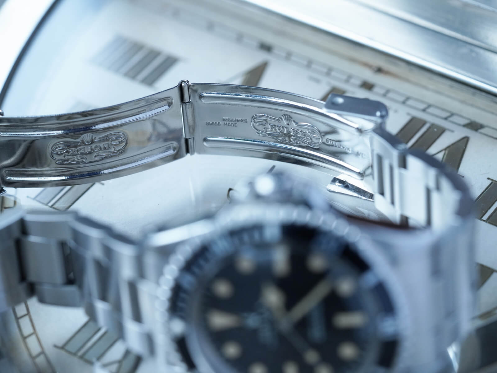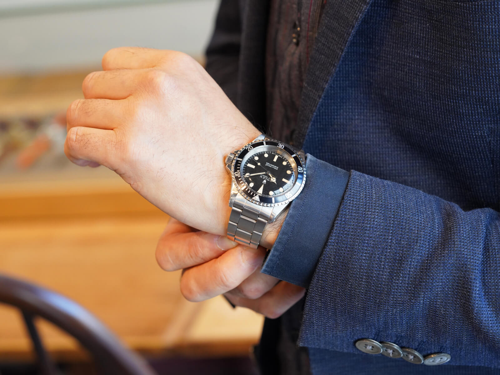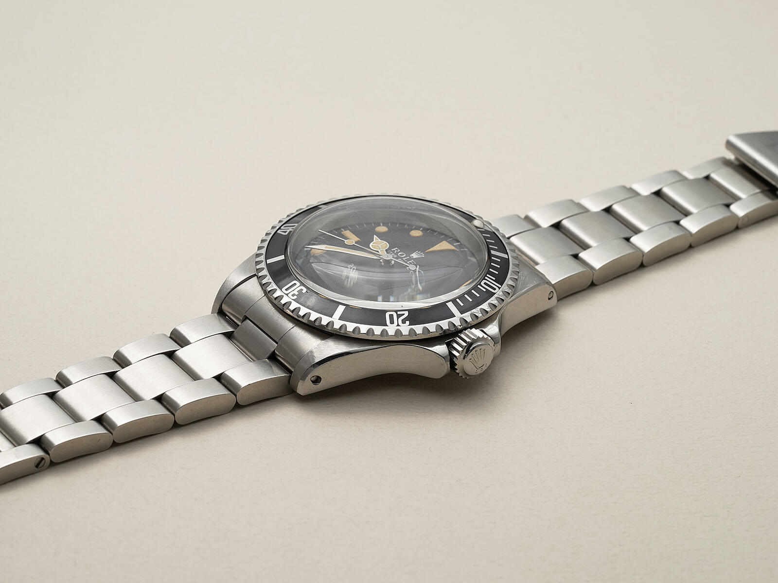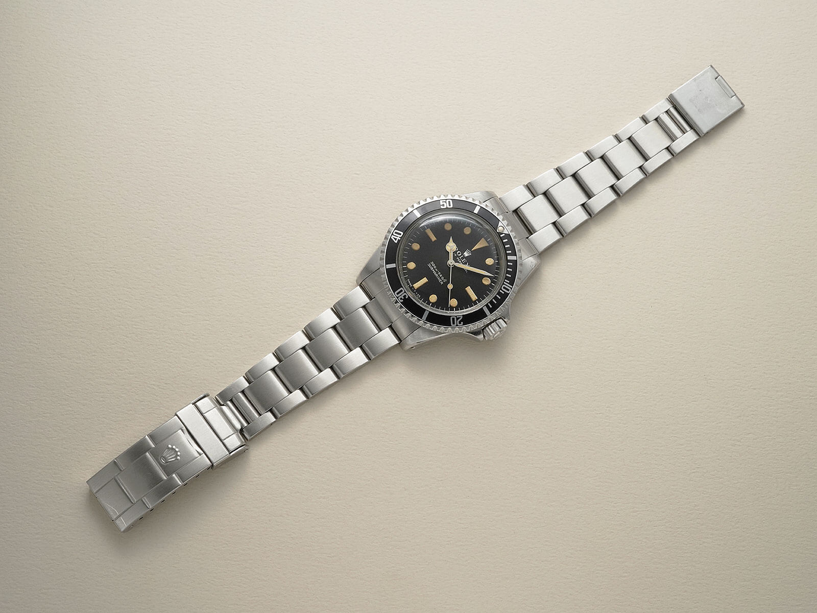 | メンズモデル 世界初防水腕時計オイスターの発明し、実力と人気を兼ね備え、誰もが知る時計ブランド・ロレックス。その中で、ダイバーズウォッチの王者として君臨する大人気モデルの「Submariner / サブマリーナ」は、ダイバーズウォッチの基準を定めた象徴となりました。時を経て、機能的な美しさから活躍の場が広がり、探検家からアーティスト等の様々な人々に愛用されるオールラウンドの象徴的なモデルです。 今回は、ヴィンテージロレックスを語る上で欠かせないモデルRef.5513Mのご紹介です。1962年から約27年と言う長い間製造された中でも、希少な初期モデルです。味わい深く経年褐色したフチ無トリチウム夜光のドットインデックス等、際立つ存在感に”経年美化”を感じさせてくれる一本。6時位置の[200m=660ft]と表記された”メーターファースト”の、200mが先に表記されるヴィンテージらしいディティールのマットダイヤルの最初期に当たる仕様です。ベゼルもロング5がセッティングされた人気のモデルで、オーラのある格別な存在感を感じさせてくれます。 ムーブメントは、キャリバー1530を搭載。両回転式自動巻き機構のパイオニアと言われる名機キャリバー1030を、ダイバーズ用に改良を施した前身モデルRef.5508にも搭載されたムーブメントです。1962年にデビューとなったRef.5513は、数年でキャリバー1520へと換り、傑作モデルの初期型であることを証明した、とても貴重な存在です。 ブレスレットは、純正のステンレス製オイスターハードブレス93150・フラッシュフィット580がセッティング。Ref.1680等に使用された純正ブレスレットで、スリードットの王冠リューズと共に1978年頃にメーカーにて交換がされており、とても状態の良い物がセッティングされております。後のシードゥエラーとなる、[Comex/コメックス]社の潜水士向けのダイバーズウォッチのベースモデルともなった、時計の歴史上にも欠かすことのできない貴重なモデル。多くの人々を魅了したヴィンテージロレックスのシンボルモデルの様な存在で、抜群の存在感を感じさせてくれる至高の一本。是非店頭にてご覧ください。 |