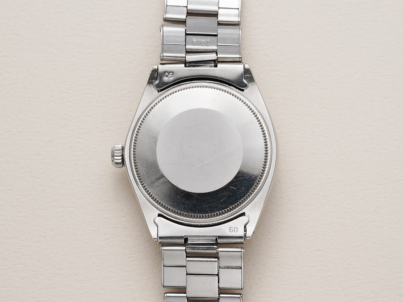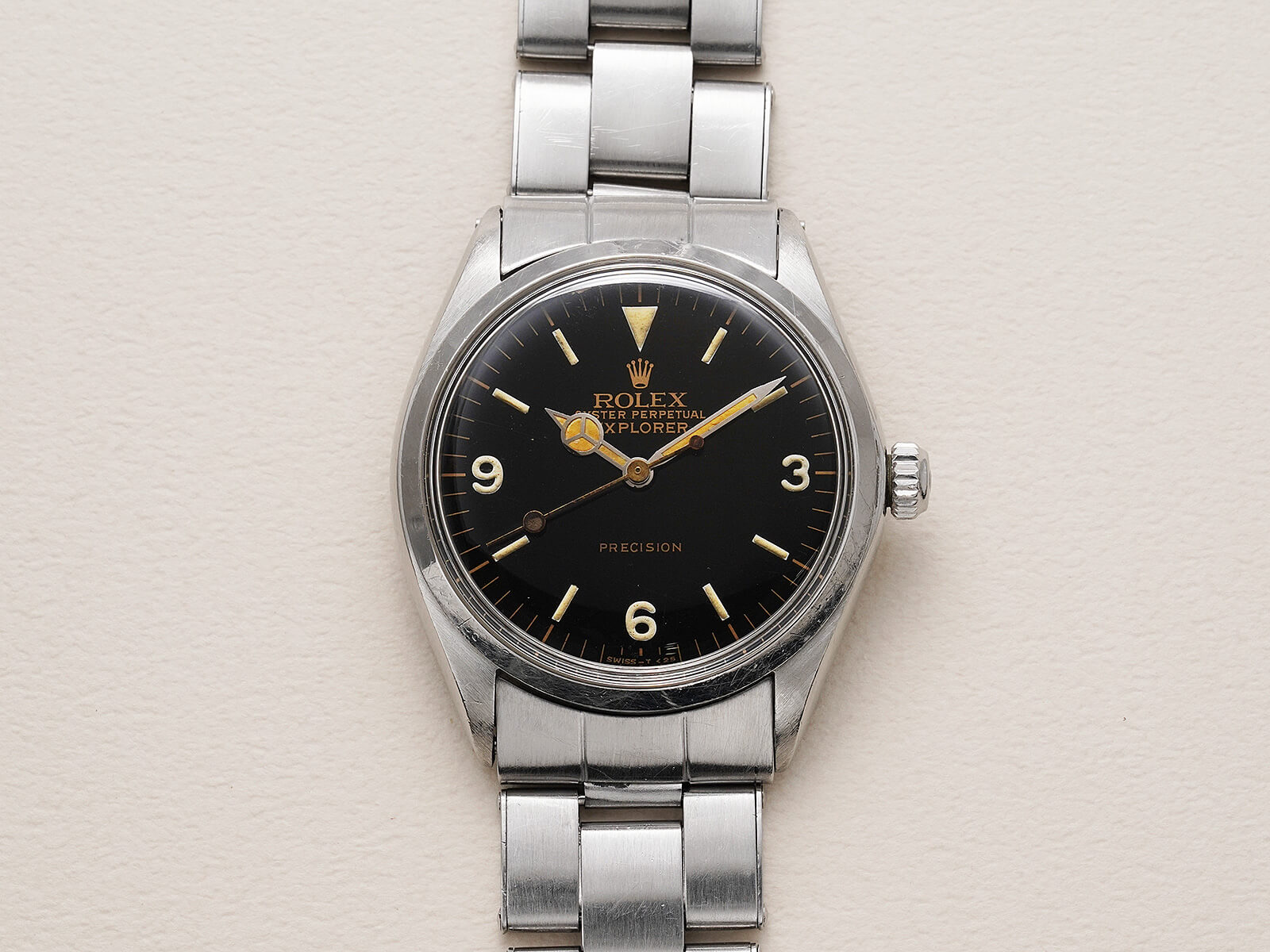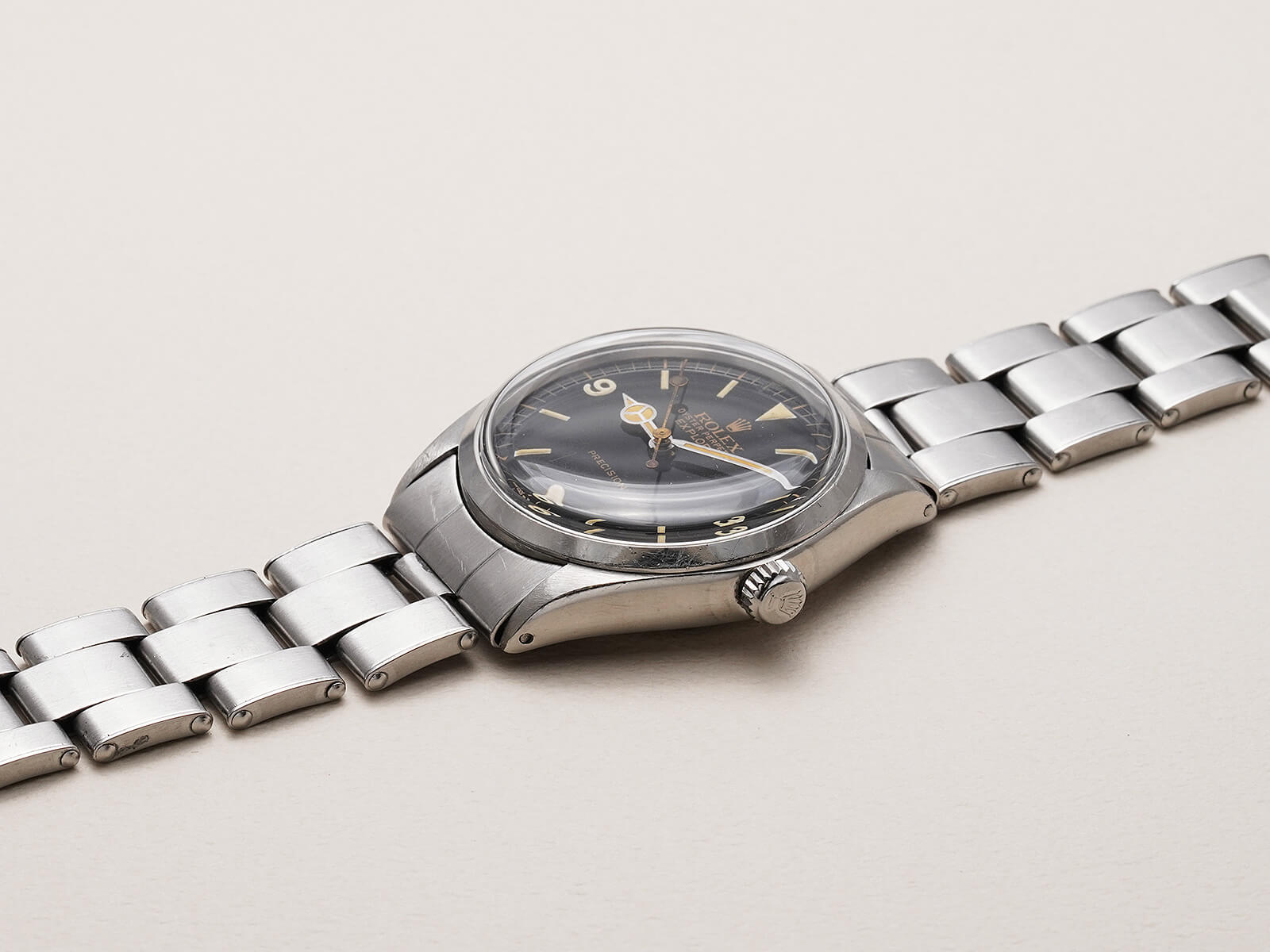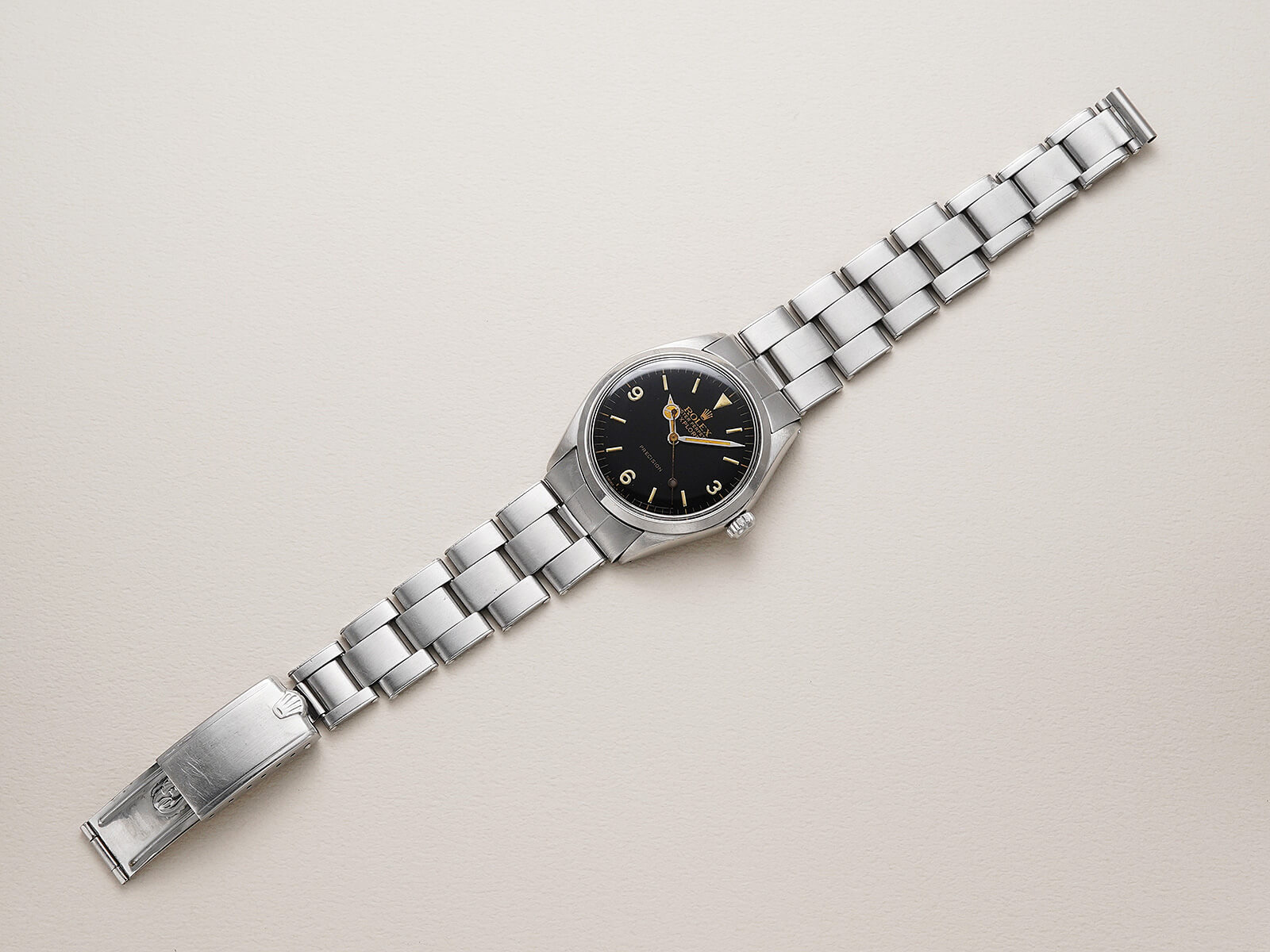 | ボーイズモデル ロレックスの代表的名作[Explorer 1 / エクスプローラー1]。その中のノンクロノメーターで、ダイヤル6時位置に「正確、精密」の意味を持つプレシジョンの表記が印字された「エアキング/Air king」Ref5500をベースとした、通称「エクスプローラーボーイズ」と呼ばれる希少性の高いモデルです。 今回ご紹介は、メンズサイズのRef.1016より1回り小さいボーイズサイズRef.5500です。特にこのモデルは、60年代~70年代初期だけに存在する、貴重なオリジナルで鏡のような輝きを放つ「Gilt Dial / ミラーダイヤル(ギルトダイヤル)」を使ったモデルです。ロレックスの代表的スポーツモデルに使われるメルセデスハンドに、トリチウム夜光のフチなしのアラビアインデックスが程良くアイボリー色に変色し、ダイヤルに浮かび上がるような強いコントラストを演出。視認性の高さは勿論のこと、風格さえも感じさせる完璧な配色で、現代には無い魅力は勿論のこと、オーラのある格別な存在感を感じさせてくれます。 ムーブメントは、自動巻きキャリバー1530を搭載。ロレックスの代表的モデルであるサブマリーナ等にも搭載され、卓越した精度と耐久性を持ち、長年パーペチュアルシリーズを支えた名機ですので、安心してお使い頂けます。 ブレスレットには、ヴィンテージロレックスのスポーツモデルに欠かせない「Stainless steel Riveted Bracelet / 純正SS3連リベッドブレスレット」が付属。主に70年代以前のみに使われた大変貴重なディテールの、大冠マークの飛び出した様な通称”デベソバックル”が存在することで、ヴィンテージらしい独特な雰囲気と魅力を堪能することができる逸品。裏蓋の刻印は、Ref.1002となっております。美しさの際立つシンプルなデザインで、多くの人々を魅了したヴィンテージロレックスのシンボルモデルの様な存在の、持っていて間違いのない一つです。ぜひ店頭にて御覧ください。 |