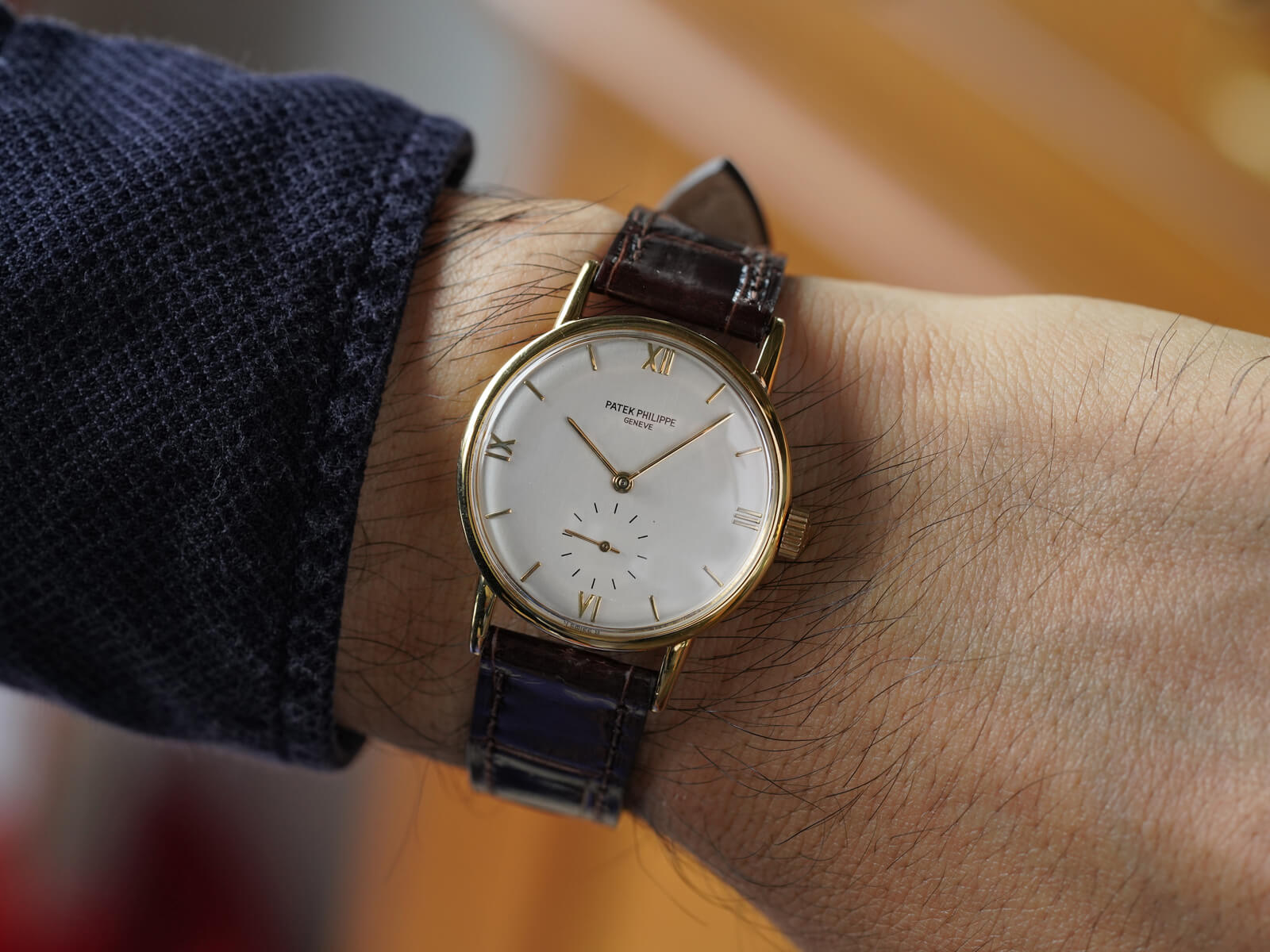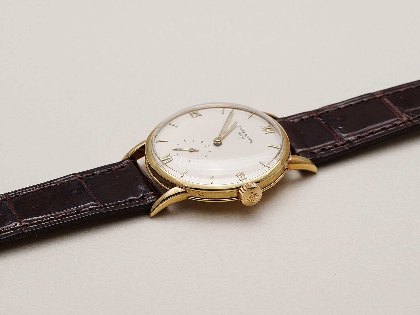 | 廃盤メンズモデル 「パテックフィリップ/Patek Philippe」ドレスウォッチの最高峰であり、ラウンドケースのお手本として現在でも特筆した存在感を持ち続けている「Calatrava / カラトラバ」を生み出したその功績。マニファクチュールであり続けるブランドの姿勢が、多くの時計ファンの憧れの存在です。 今回は、気品と趣のある雰囲気を感じさせるドレスウォッチRef.1471のご紹介です。ミドルケースが綺麗に段付きのデザインになっている美しいケースデザインに、しなやかな曲線を描きながら伸びるクロウラグが、エレガントなシルエットを演出。綺麗なヘアライン加工の施されたアイボリーダイヤルに、珍しい4点のローマ文字とアンティーク時計において大きなポイントであるスモールセコンド仕様の、伝統的でお手元に上品な雰囲気を纏わせる素晴らしい時計です。ダイヤルに金製の素材が使われている事を示す、シグママークが表記され、パテックフィリップの拘りもさりげなく感じさせてくれます。 ムーブメントは、1946年から1965年まで長きに渡り生産された、キャリバー10-200を搭載。30㎜以下の小さいサイズの通称”ベビーカラトラバ”にも搭載され、パテックのドレスウォッチの多くを飾ってきた名機と言える存在です。 今回の販売に当たり、メーカーアーカイブを2021年8月に取得しておりますので、お買い上げの際にお渡し致します。 レザーブレスには、当店オリジナルのクロコダイルレザーのシャイニーブラウンをセレクトし、イエローゴールド製純正尾錠が付属されております。コンパクトでありながら美しい存在感があり、古びることのない完成度の高いデザインです。是非店頭にて御覧ください。 |