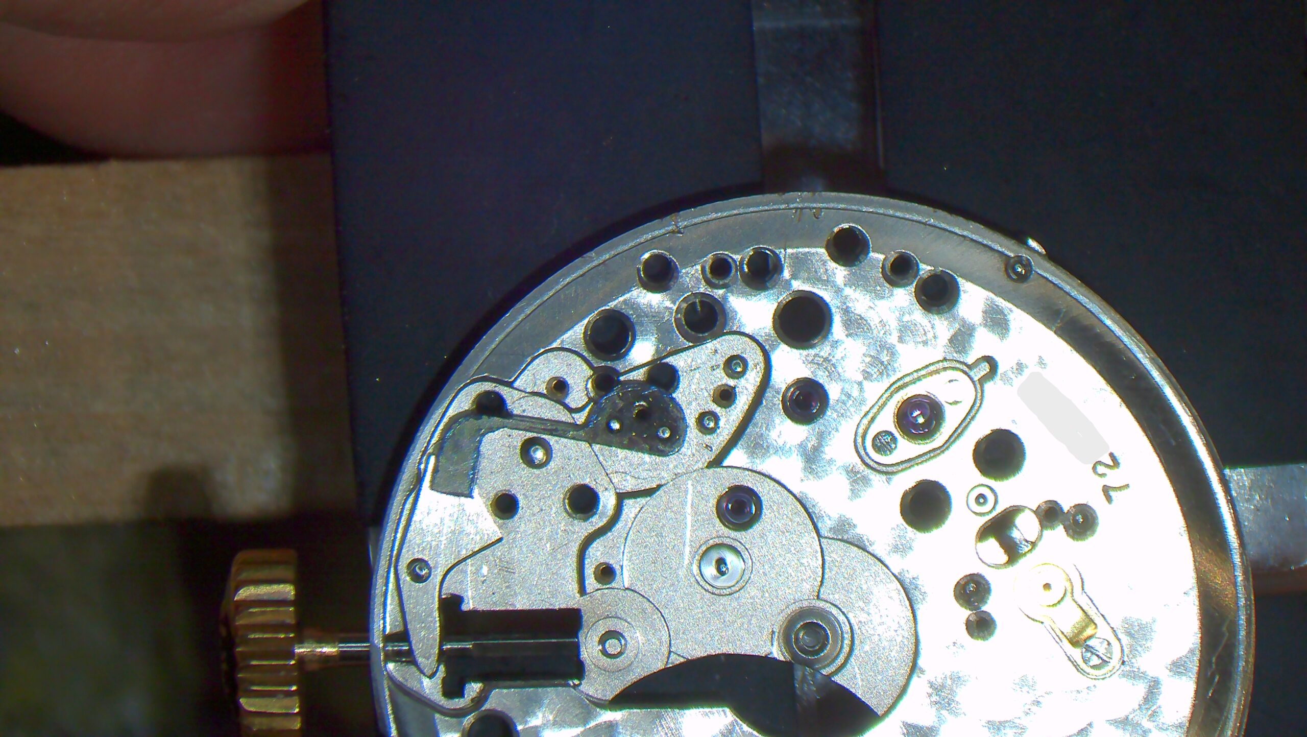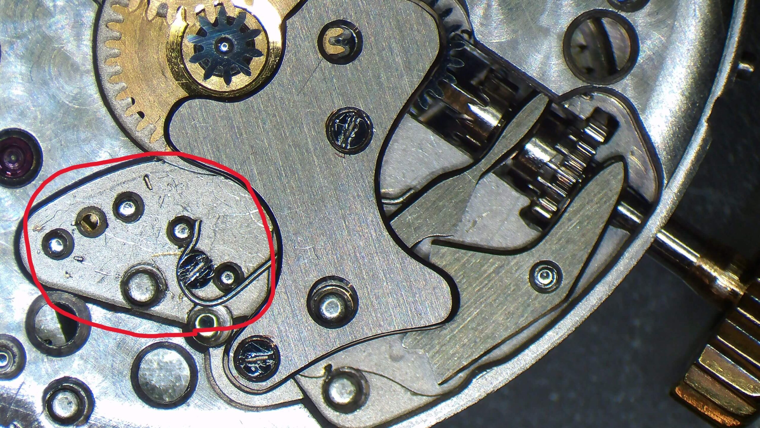 本来は赤い丸で囲った部分にバネパーツが2種類入りますが、案の定パーツが破損・紛失してました、、、、こちらは違うバネを入れてありますね。よく破損しやすい箇所なので仕方ない気持ちもありますが、このままではダメなので後ほど製作します。このままでも使えない事はないのですが、リューズを引いた操作の際にすぐに元の位置に戻ってしまいます。パテックフィリップに限らずお持ちの時計で同じ様な症状がある場合は一度ご相談下さい。