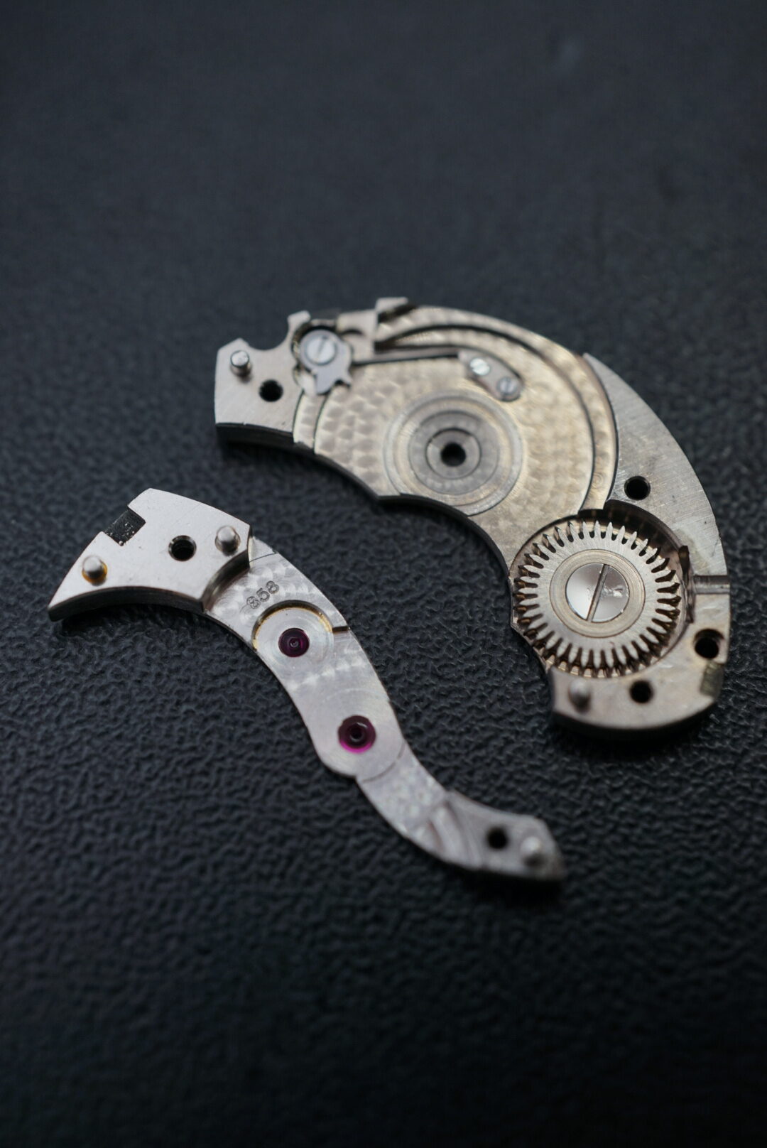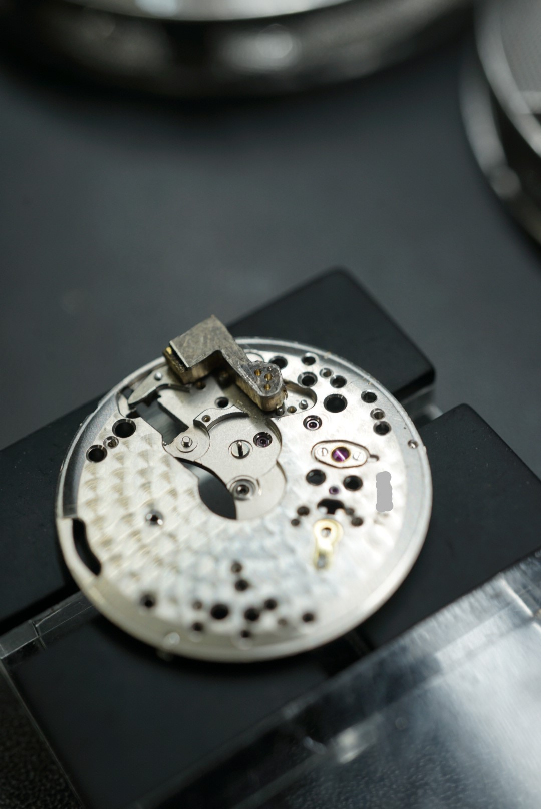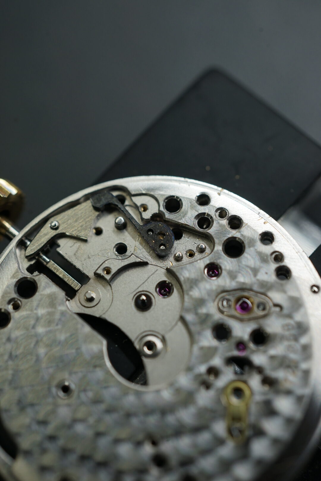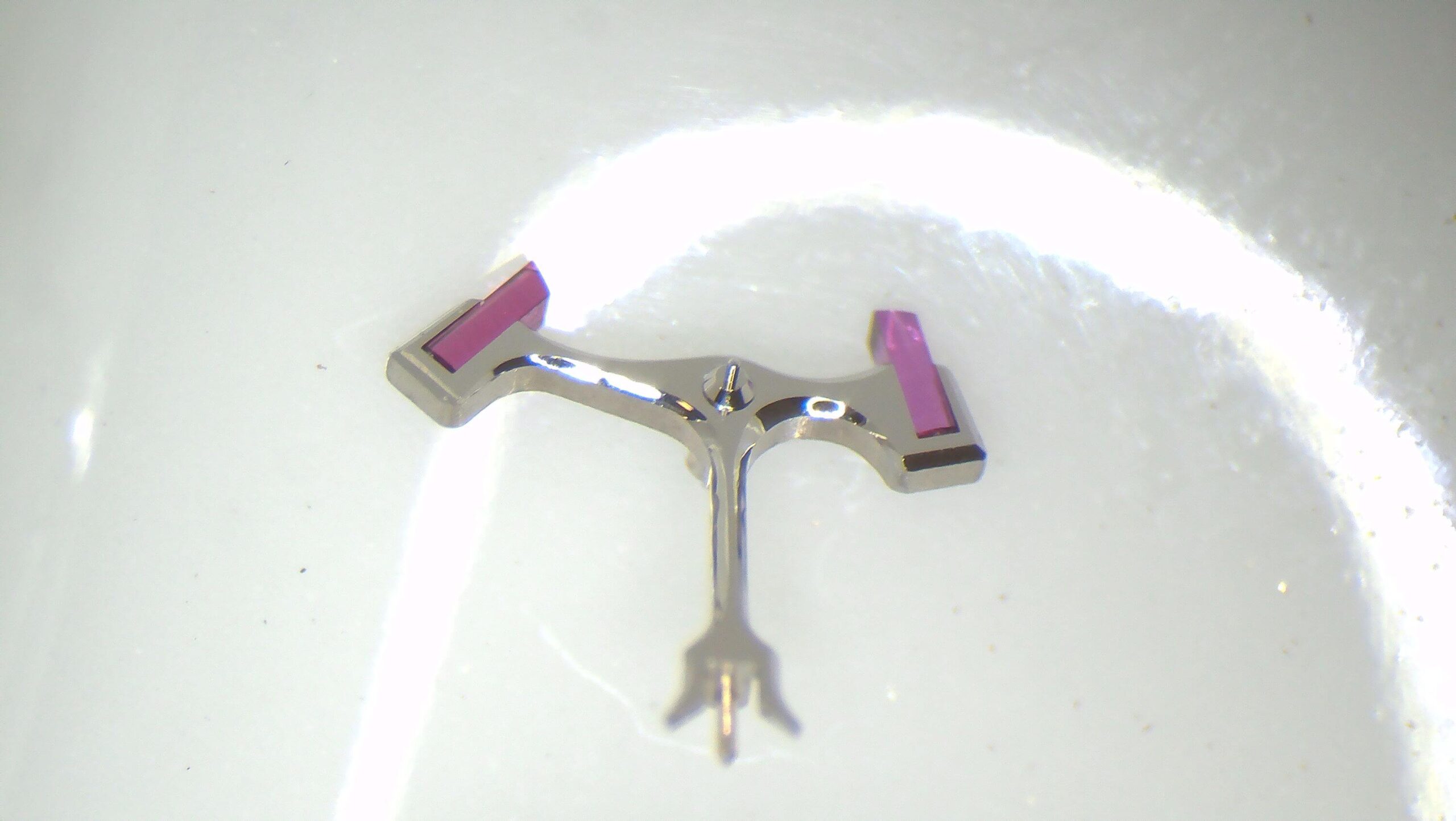 顕微鏡の画像です。受けの角は勿論の事、ルビーが入る穴の周りやアンクルと呼ばれる小さいパーツにも仕上げが施されています。コート・ド・ジュネーブも綺麗です。