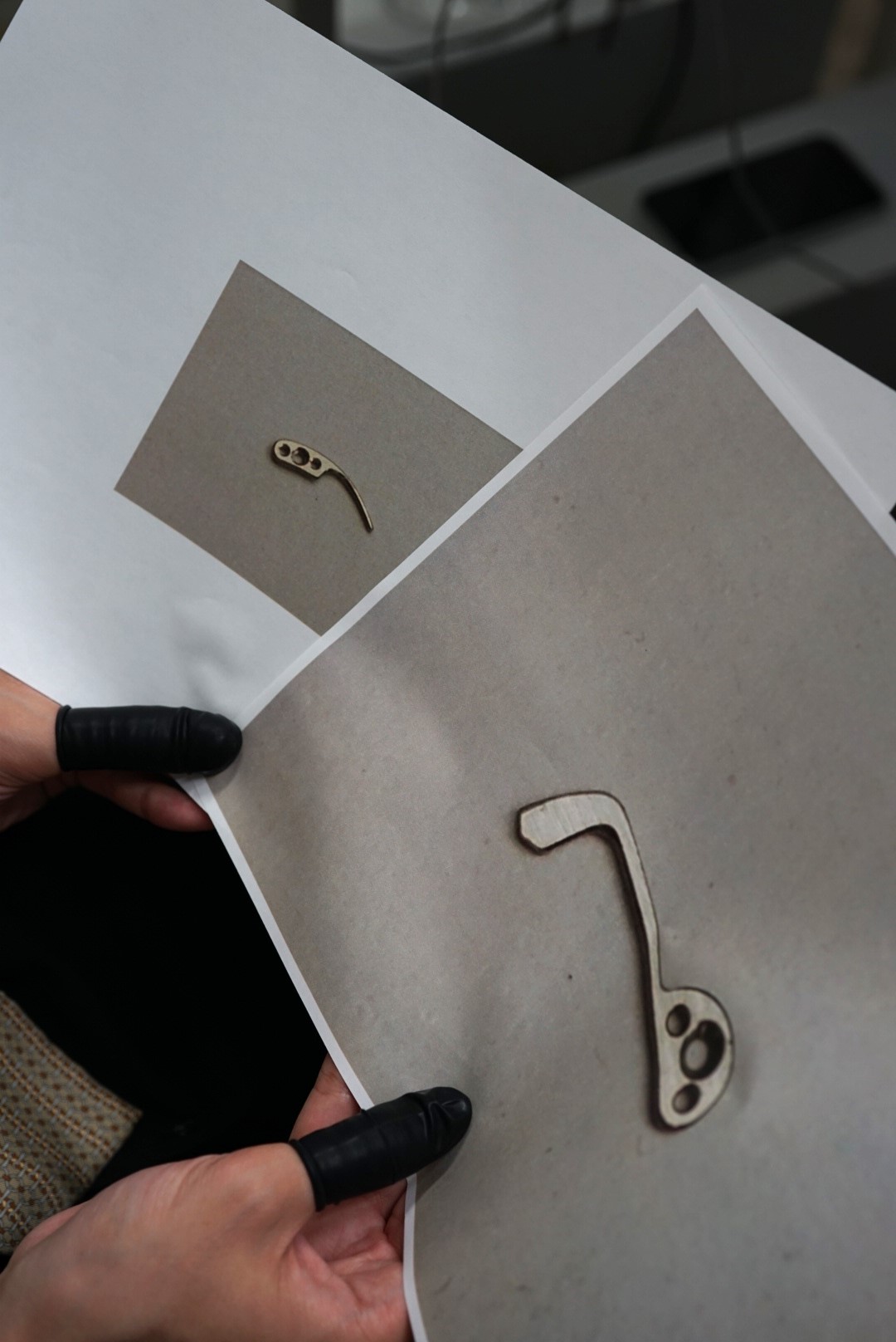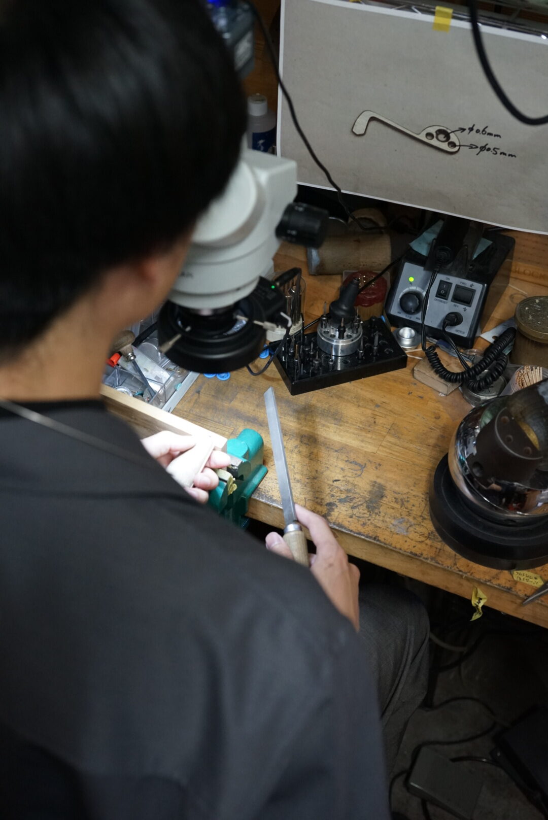 鉄の板から製作します。まずは使う分だけ切り落とし、残っていたパーツをもとにピンの入る穴・ネジの入る穴を開けていきます。