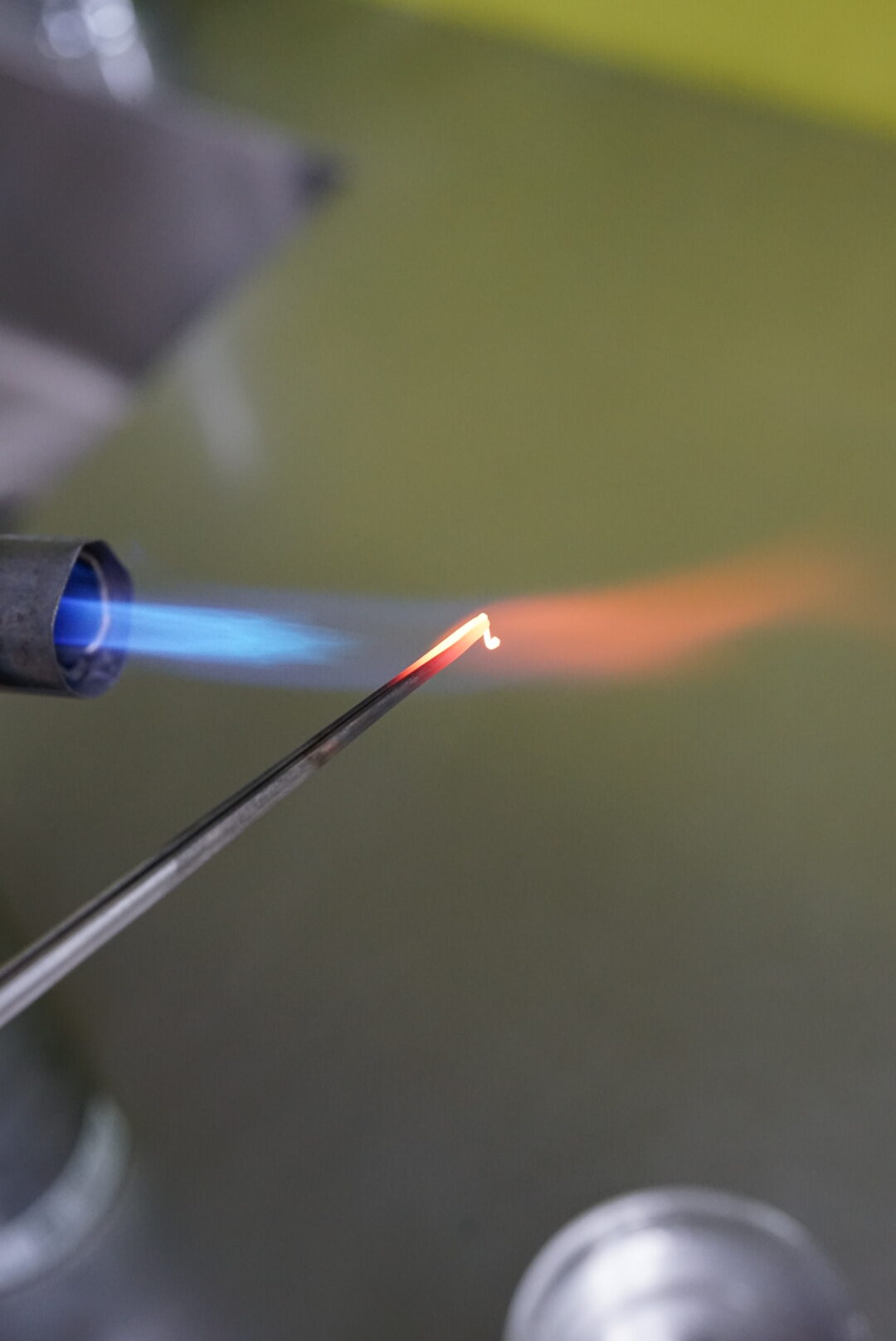 形を整えた後、パーツに適度な強度を持たせるために、焼き入れと焼き戻しを行います。まずは焼き入れです。赤くなるまで火で熱して水に入れると素材が硬くなります。