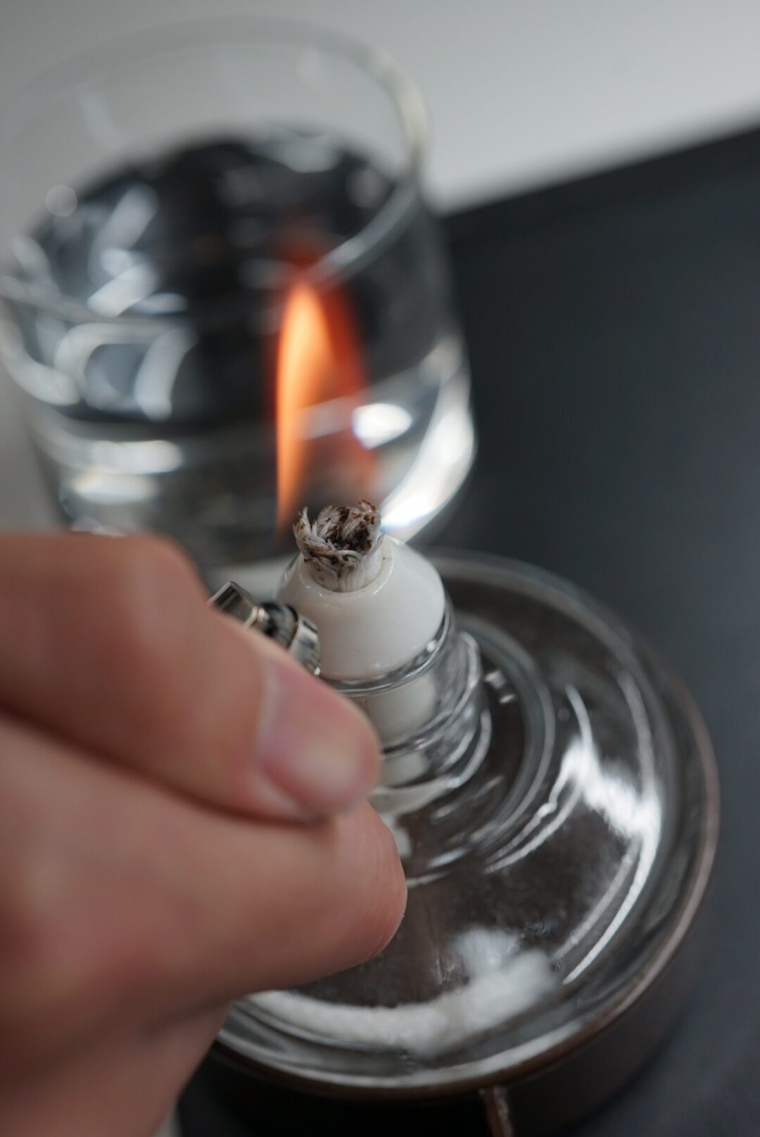 次は焼き戻しです。硬いままだと折れやすいので、温めて適度な柔らかさに戻します。深い青色が良い状態なのでそれを目指します。理科の実験みたいでなかなか楽しい作業です(・∀・)
