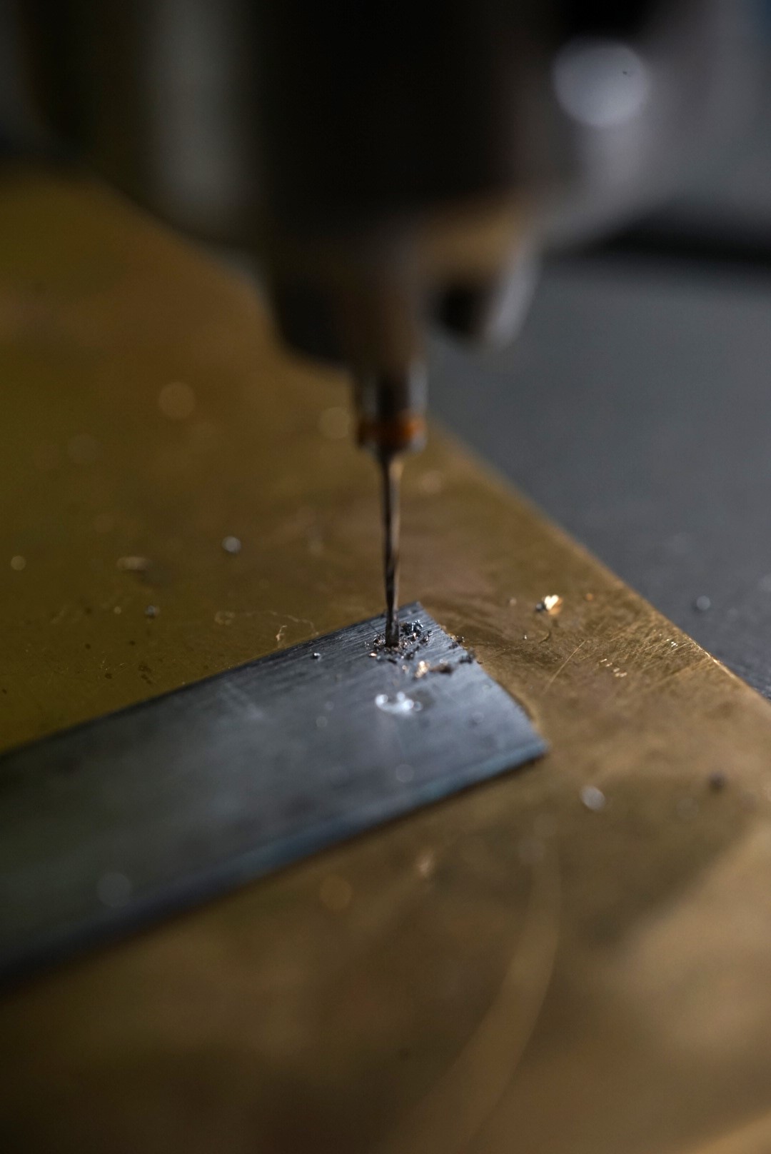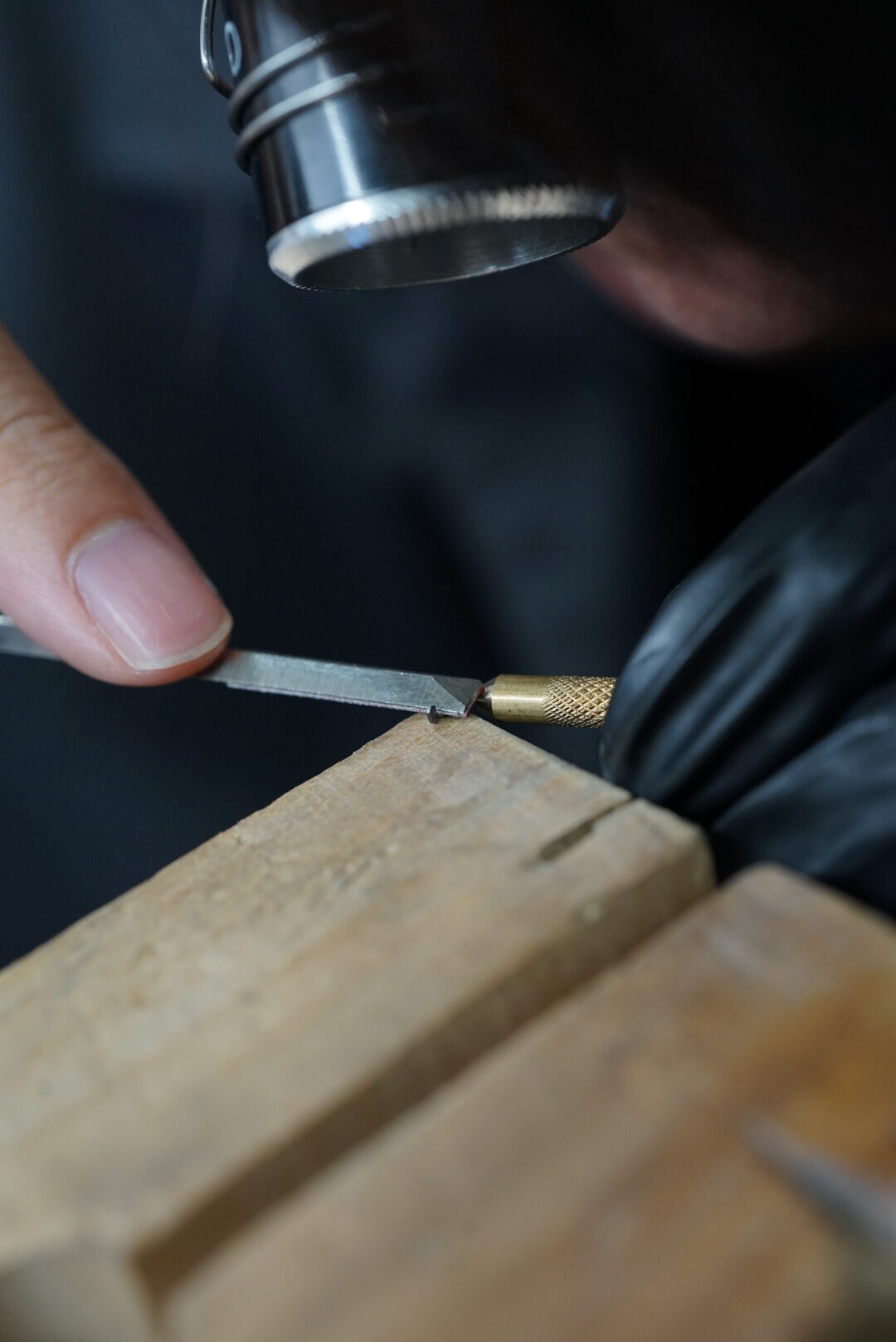 元々のパーツは角も面取りされていて、側面もヘアラインが入っているので同じように仕上げます。小さいパーツで保持がしづらいので、治具も製作してます。