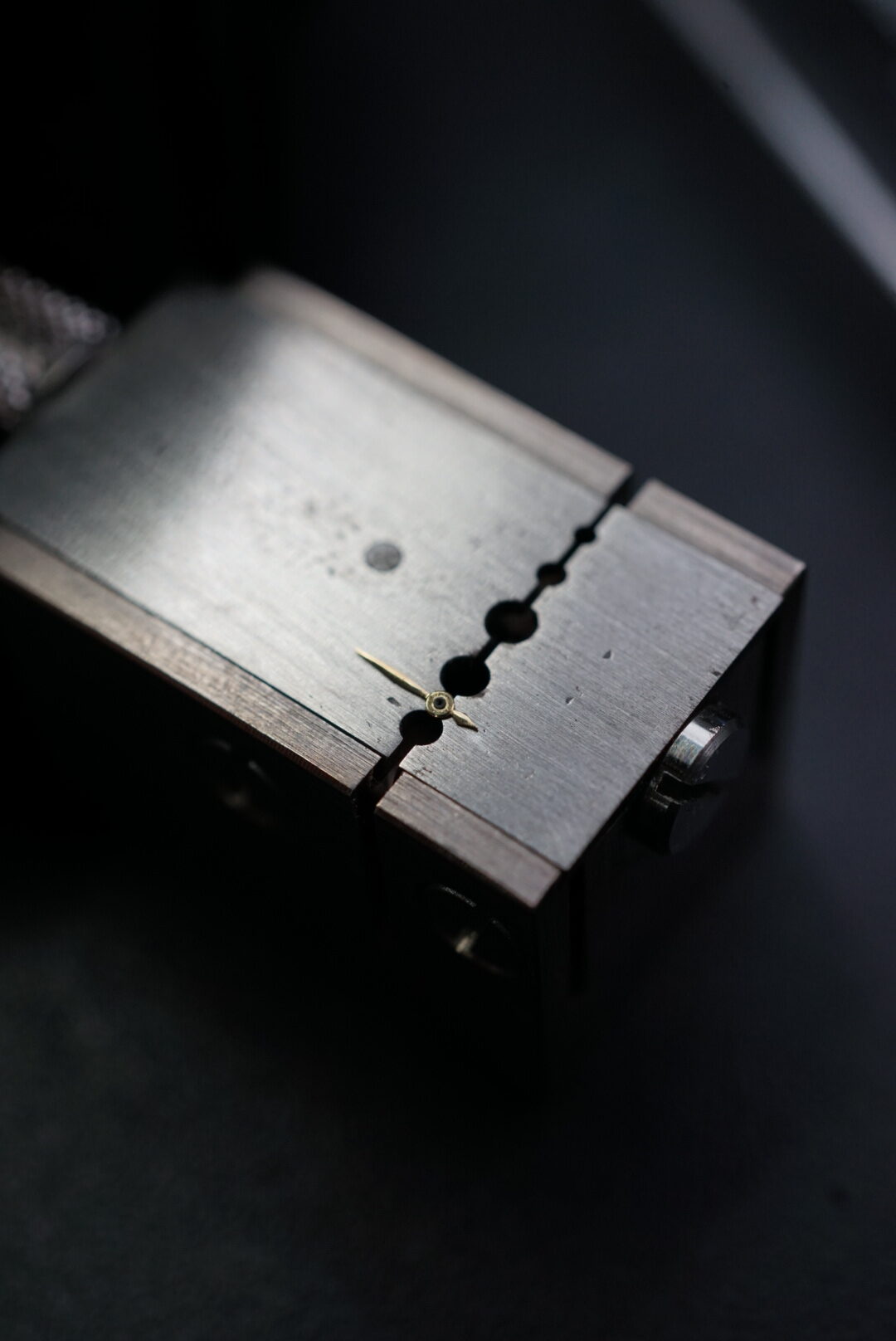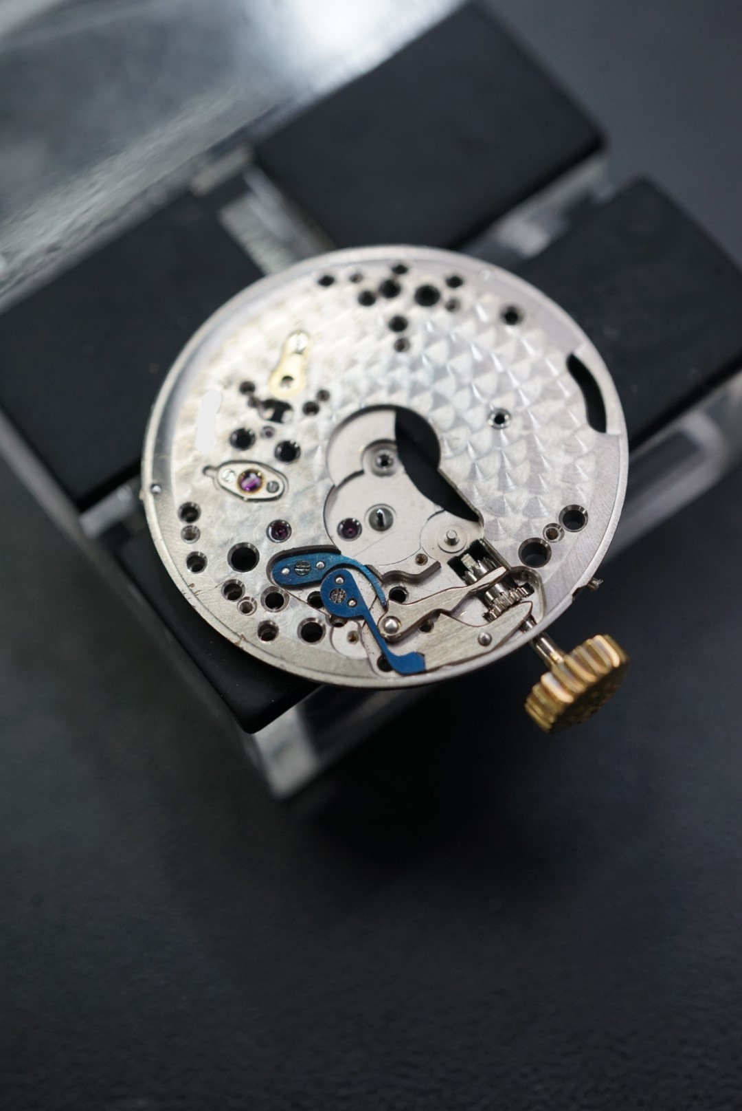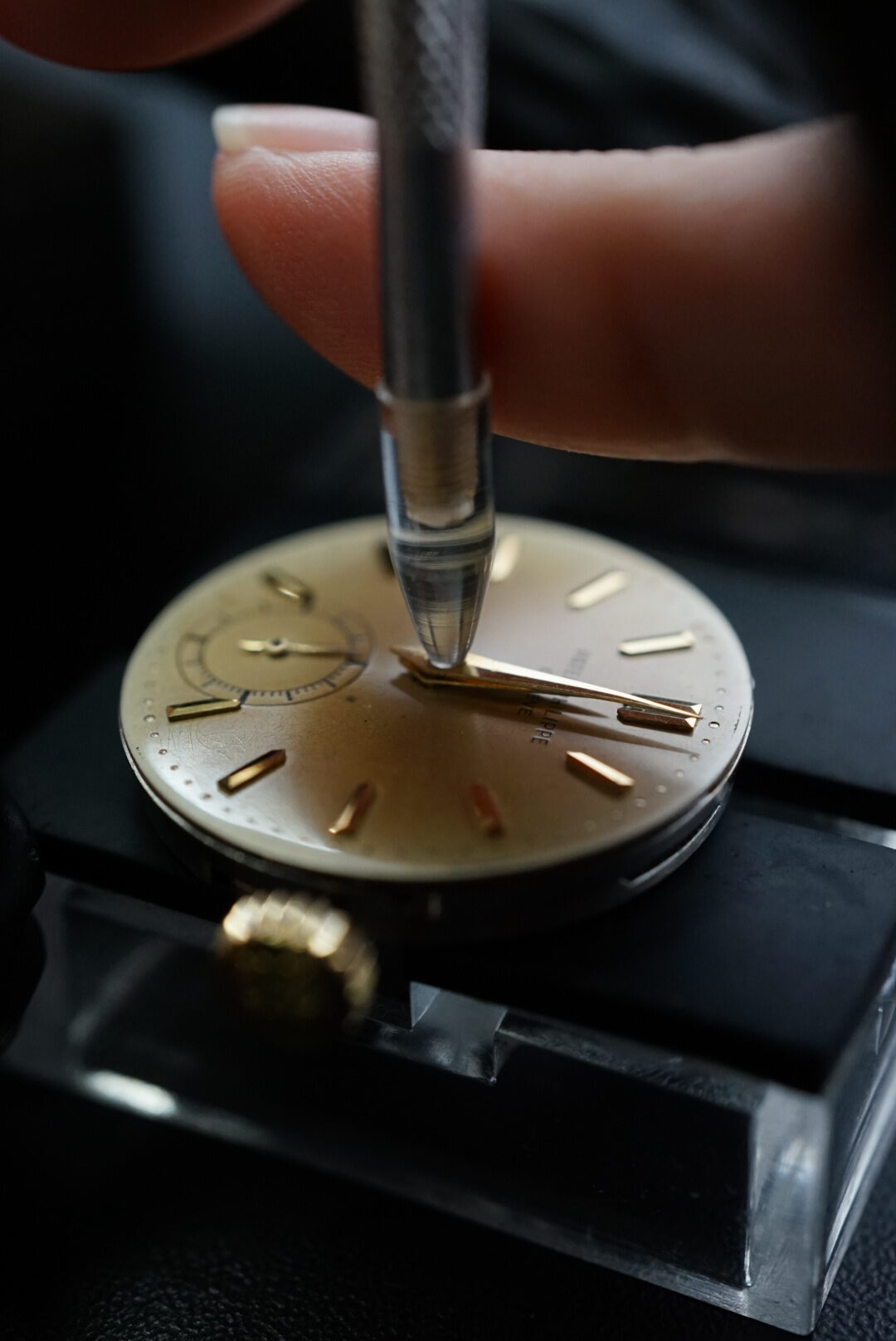 文字盤・針を取り付けて、ケーシングします。その前に秒針が緩かったので締め直します。何回も取り外しされていると、どうしても緩くなってしまいます。