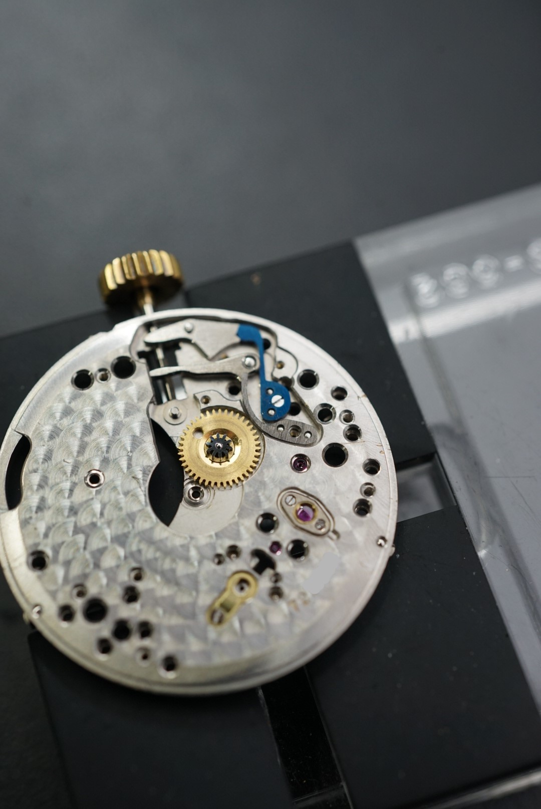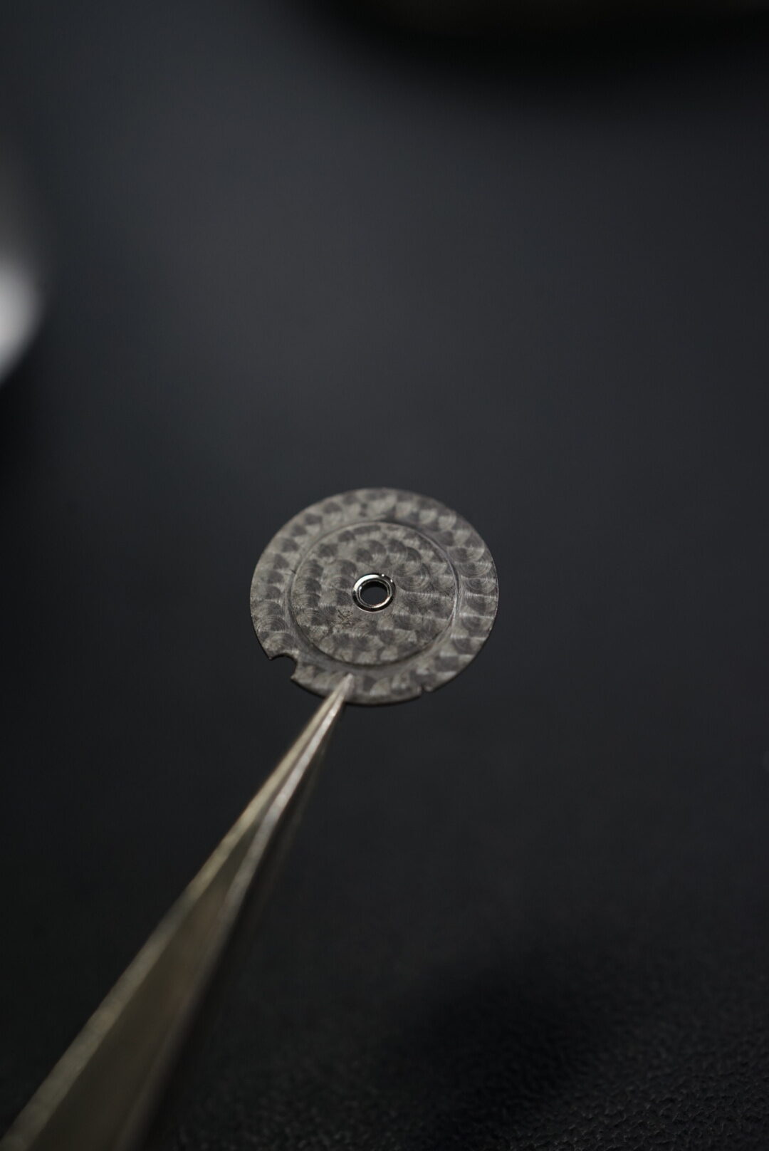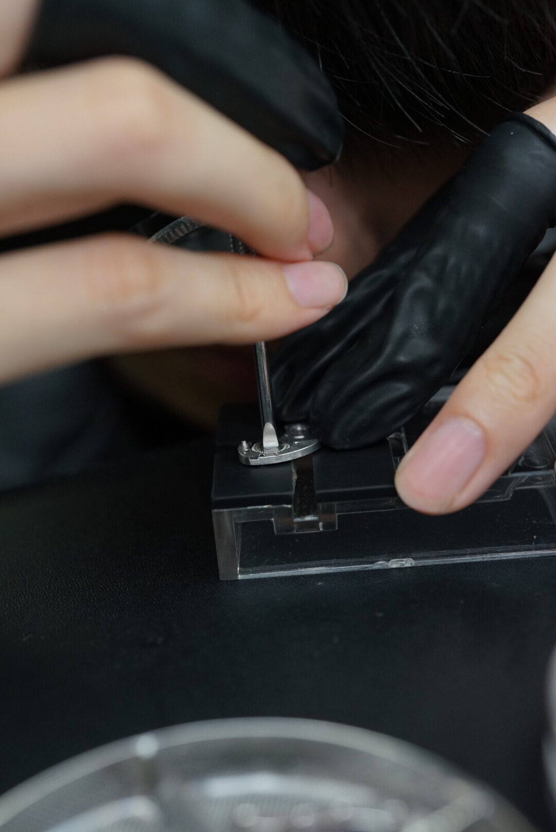 文字盤・針を取り付けて、ケーシングします。その前に秒針が緩かったので締め直します。何回も取り外しされていると、どうしても緩くなってしまいます。
