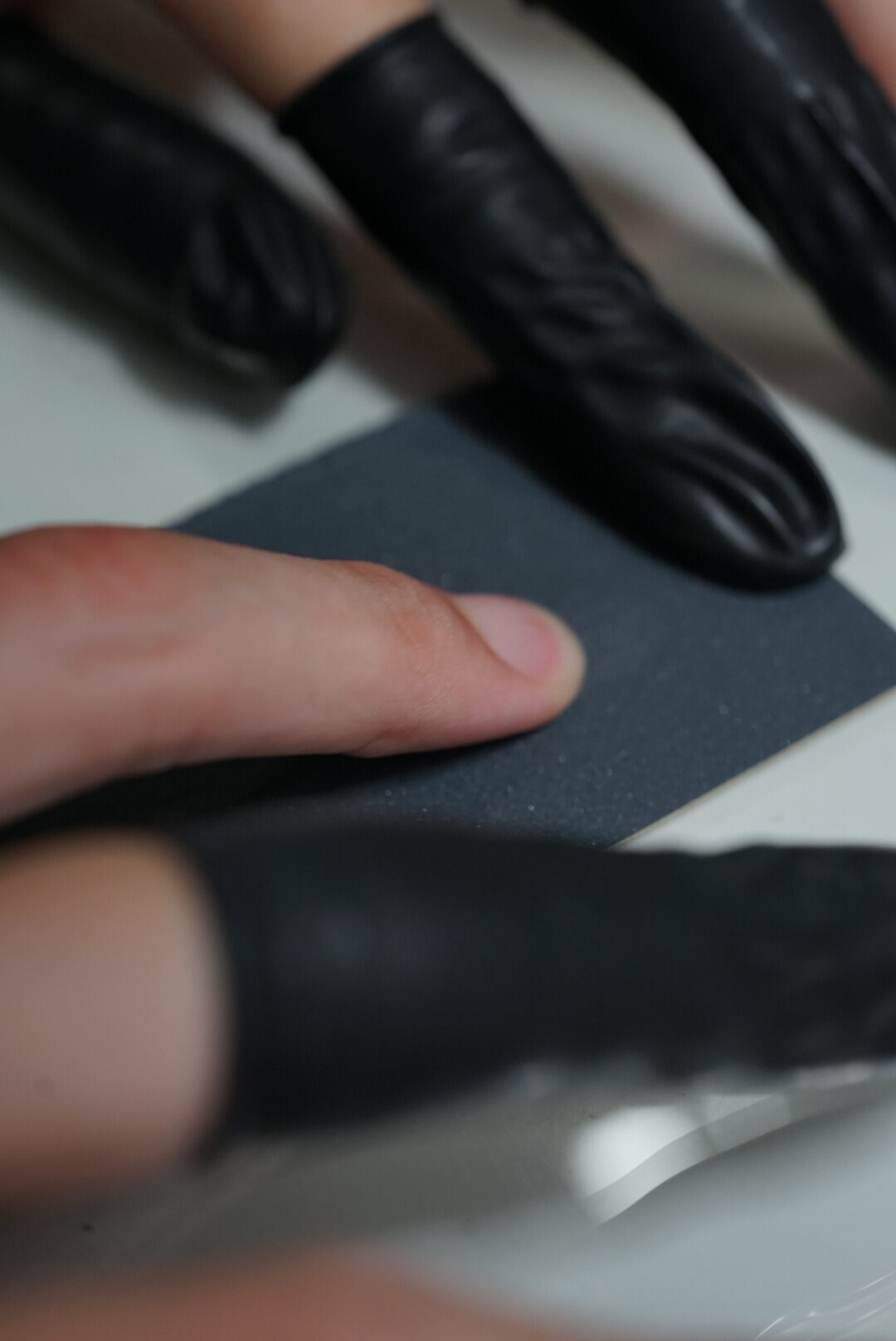 青い状態も新鮮でいい感じですが、仕上げを施していきます。まずは表面にヘアラインを入れます。