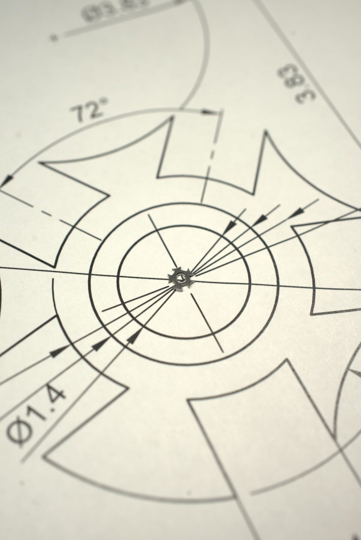 まずは設計図を作成しました。ネジなどはあまり複雑な形状ではないので、手書きで大体の寸法を書いて製作しますがゼネバストップは形状が複雑な為、正確な寸法が必要でした。