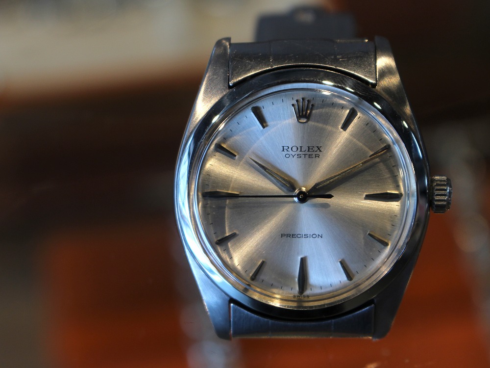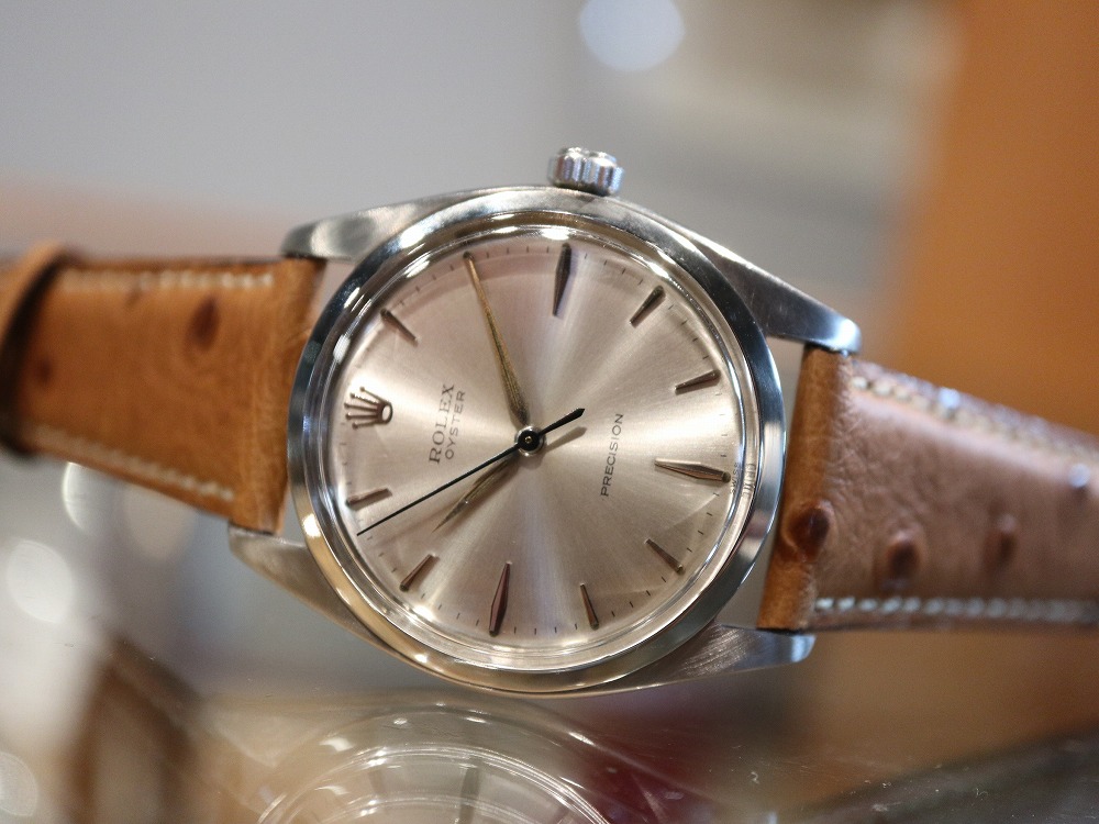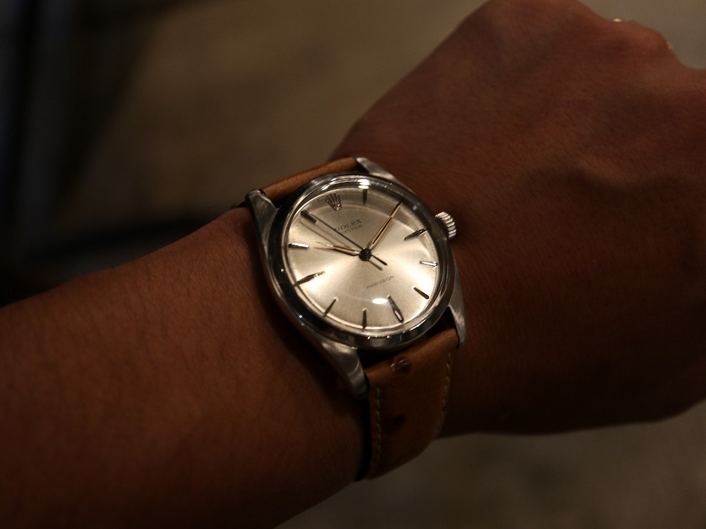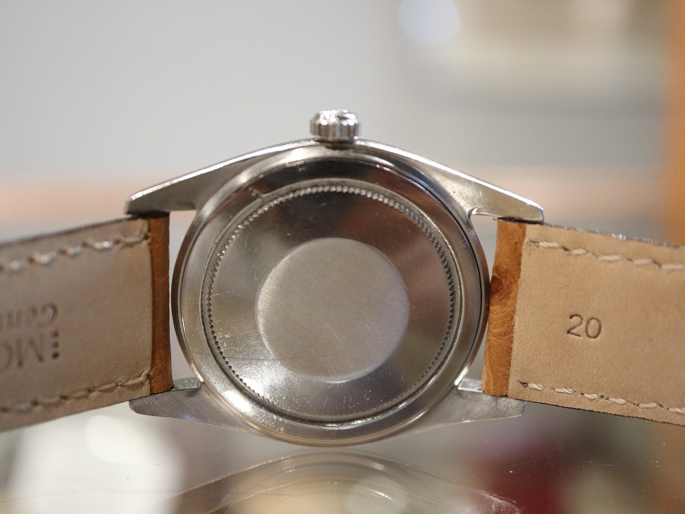 50年代のヴィンテージロレックスの中で、36mmと言うビッグケースが特徴的なRef6424通称『ビッグオイスター』のご紹介です。ラグ幅20mmと言うのもとても珍しく、今となっては同サイズのケースが多数存在しますが、当時としては異例の大きさだったはず。信頼性の高いcal1210、良い退色感を見せているアルファハンド針、特徴的なインデックスマーカー、少しでもヴィンテージロレックスに興味のある方ならその特別感をご堪能頂けるはずです。写真ではリベットブレスが付属している写真もありますが、レザーバンドに交換済みです。