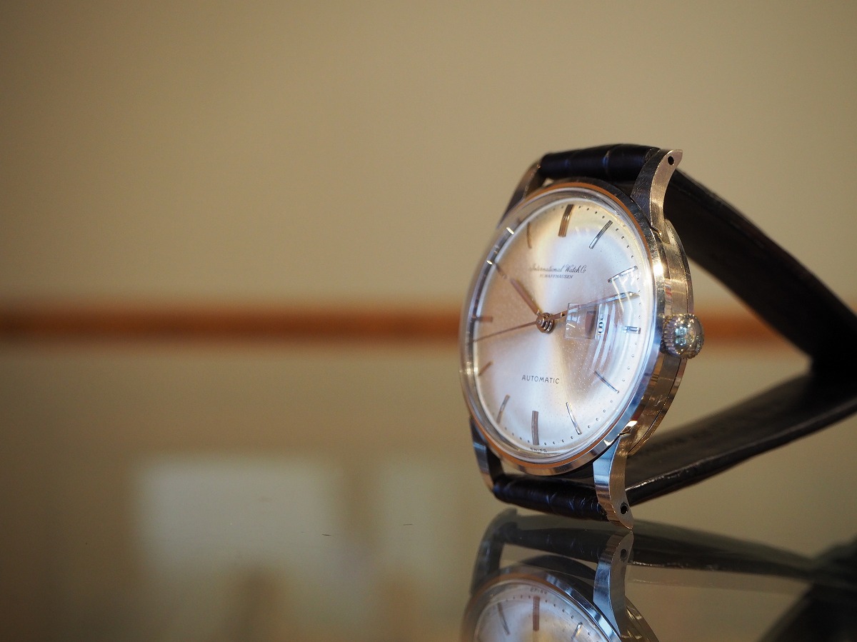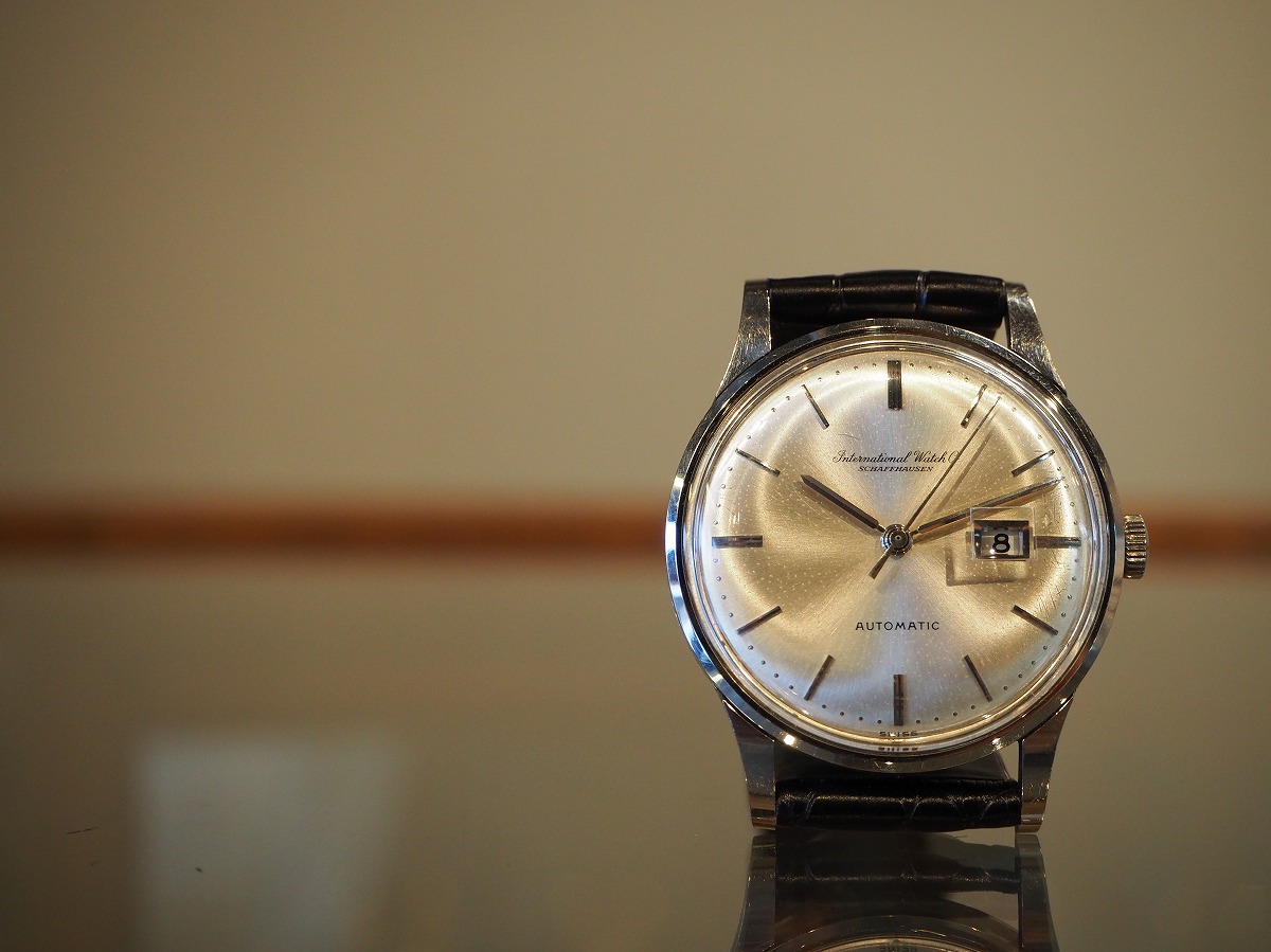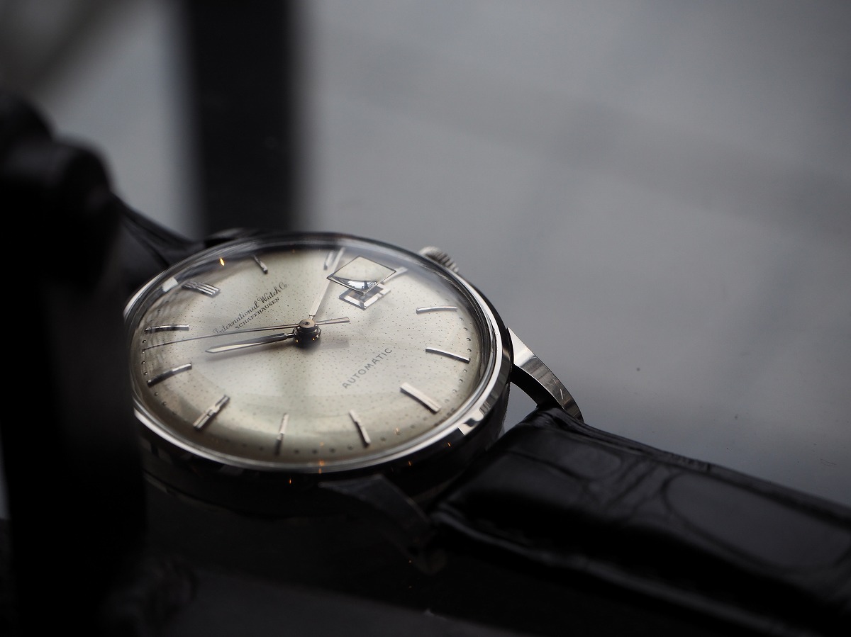もっと瞬間に違いを感じるホワイトゴールドのシンプルなスナップバックラウンドケース。「IWC/Internationalwatchcompany」の素晴らしいディテールが詰め込まれたバーインデックスにペンシルハンド針の組み合わせが、オールドインターを象徴するシンプルなデザイン。外周のミニッツマーカーのドットポイントはプリントではなく、ダイヤルに金属のボールを埋め込んだ”パール・ドロップ”手法によるもの。手の込んだオリジナルダイヤルに職人気質が宿る素晴らしい一本です。綺麗に退色したシルバーダイヤルはアイボリーに輝き、魚リューズもオールドインターを語る上で欠かせないポイントです。ムーブメントは、ペラトン式自動巻きCal8531(1959年~)で、デイトがダイヤルの内側に寄った「寄り目デイト」を有しており、Cal853(1958年~)にデイト機能を載せた機械であり、IWCの技術者『アルバート・ペラトン/Albert Peraton』の開発した素晴らしいディテールを味わう事が出来る正真正銘のヴィンテージムーブメントです。純正尾錠も付属する素晴らしい状態ですので、レザーブレスには最高級の竹斑クロコダイルレザーベルトをセレクトしております。