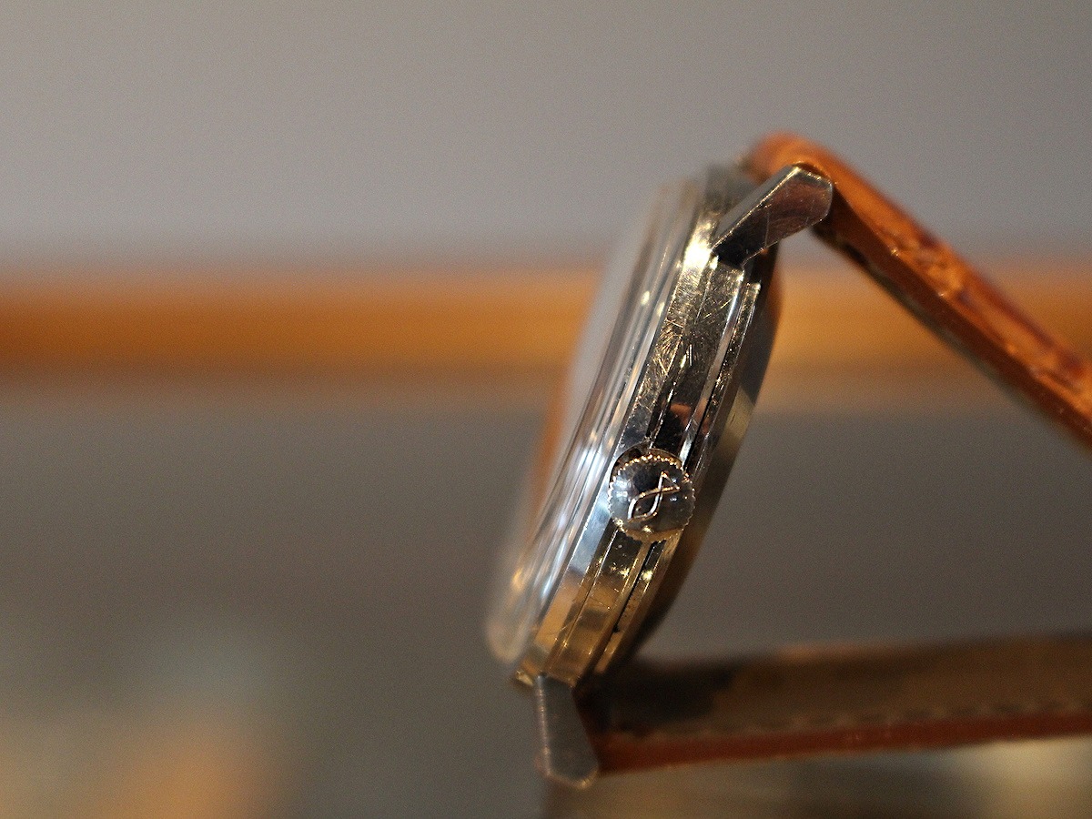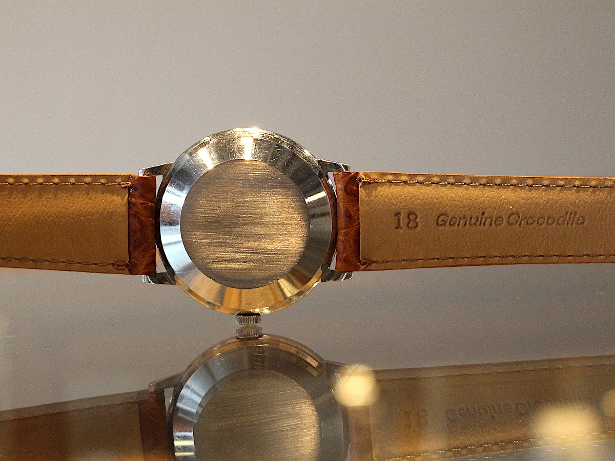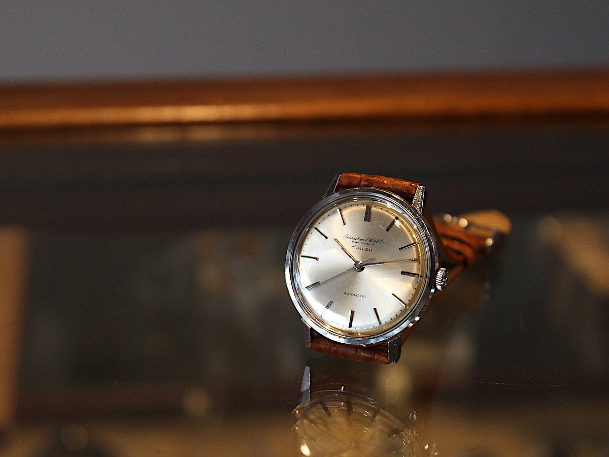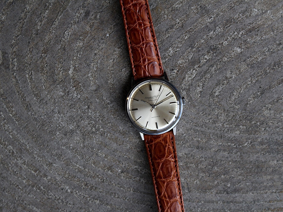「IWC/Internationalwatchcompany」の歴史の中でドレスウォッチの位置づけとなる、ステンレスケースのノンデイトオールドインターです。Turlerとのダブルネームが魅力である事は勿論の事、外周のミニッツマーカーのドットポイントはプリントではなく、ダイヤルに金属のボールを埋め込んだ”パール・ドロップ”手法によるもの。様々なダイヤルデザインが存在するRef.803Aの中でもシンプルなバーアワーマーカーとペンシルハンド針、魚リューズなど、究極にシンプルな中に拘りの詰まった一本です。ムーブメントは、Cal854、IWCの技術者「アルバート・ペラトン/Albert Peraton」の開発した素晴らしいディテールを味わう事が出来る、ロービート5.5振動のヴィンテージムーブメントです。レザーブレスには当店オリジナルの国内ハンドメイド仕上のクロコダイルレザーベルトのブラウンをセレクトしております。お色は他の色もご選択頂けますので是非お申し出下さい。
