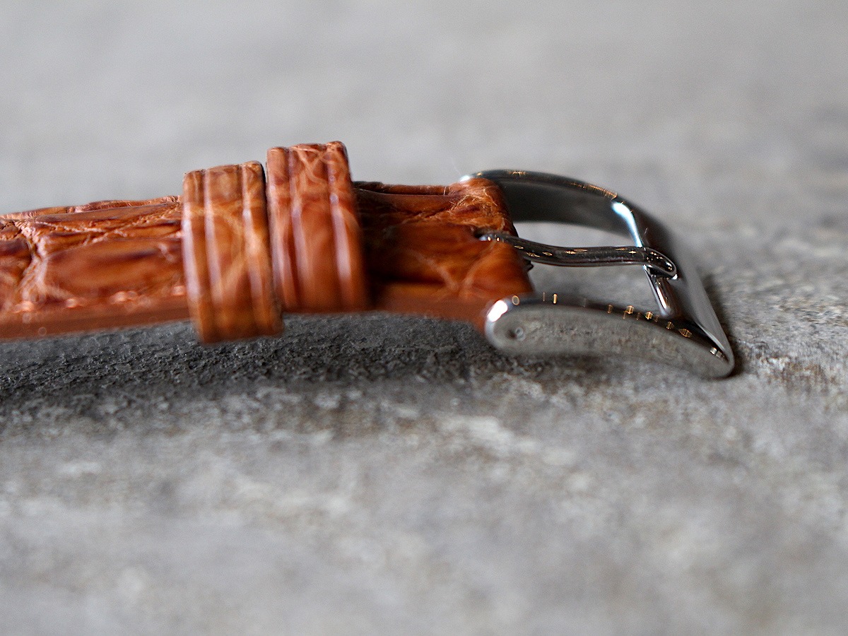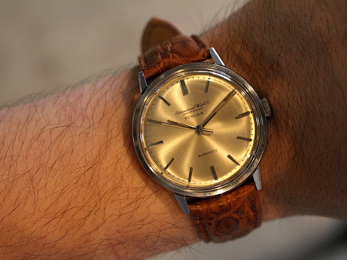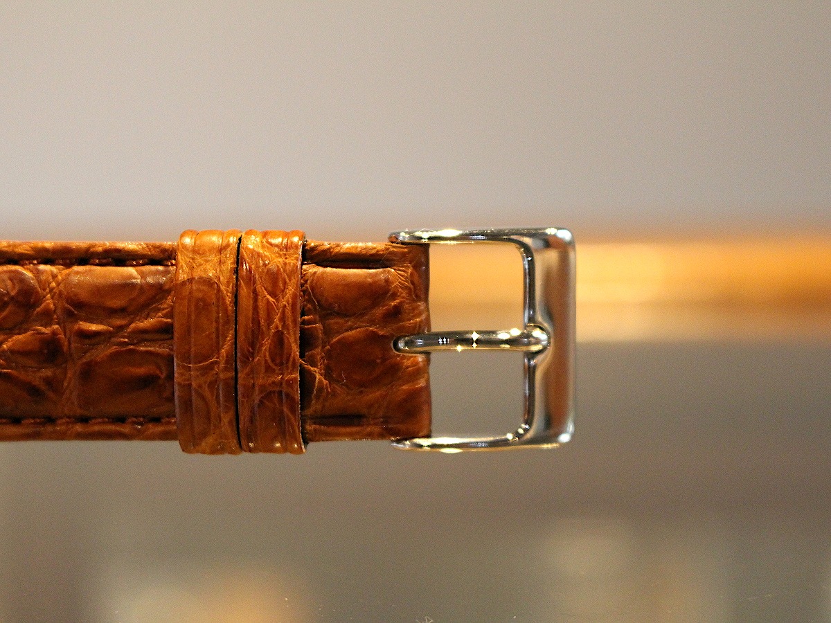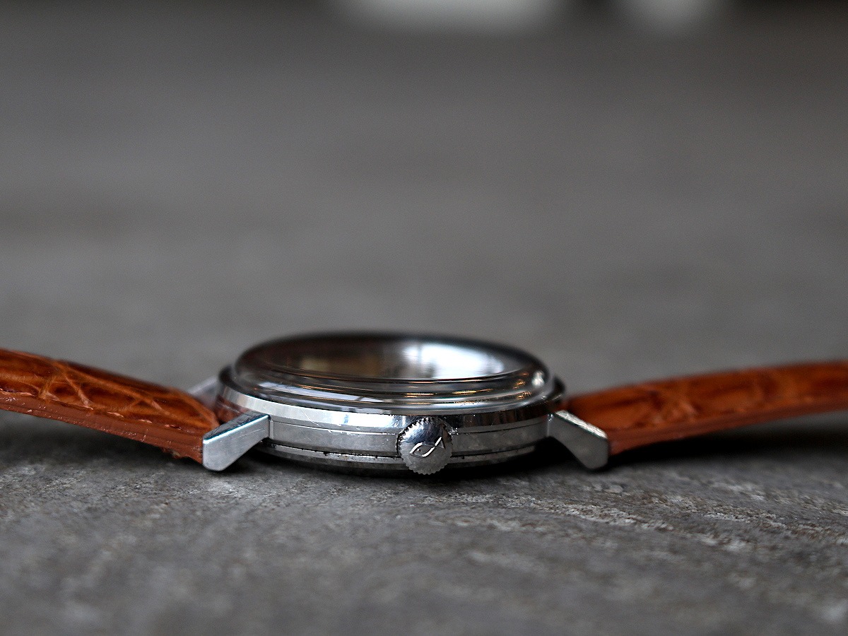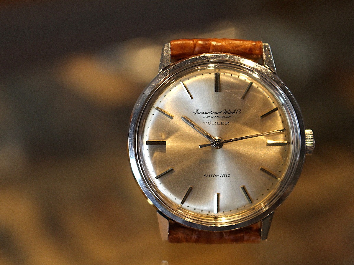 「IWC/Internationalwatchcompany」の歴史の中でドレスウォッチの位置づけとなる、ステンレスケースのノンデイトオールドインターです。Turlerとのダブルネームが魅力である事は勿論の事、外周のミニッツマーカーのドットポイントはプリントではなく、ダイヤルに金属のボールを埋め込んだ”パール・ドロップ”手法によるもの。様々なダイヤルデザインが存在するRef.803Aの中でもシンプルなバーアワーマーカーとペンシルハンド針、魚リューズなど、究極にシンプルな中に拘りの詰まった一本です。ムーブメントは、Cal854、IWCの技術者「アルバート・ペラトン/Albert Peraton」の開発した素晴らしいディテールを味わう事が出来る、ロービート5.5振動のヴィンテージムーブメントです。レザーブレスには当店オリジナルの国内ハンドメイド仕上のクロコダイルレザーベルトのブラウンをセレクトしております。お色は他の色もご選択頂けますので是非お申し出下さい。