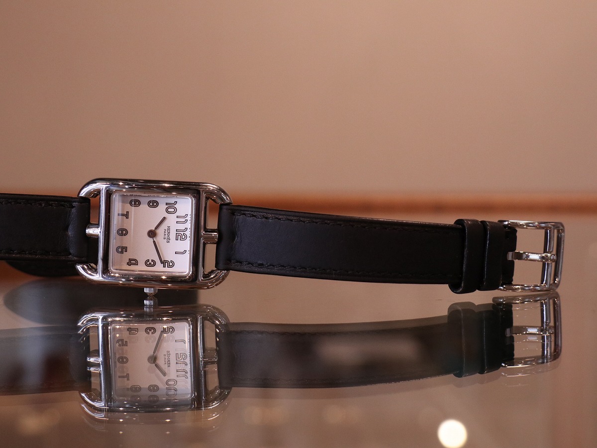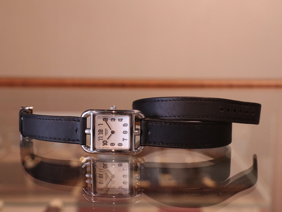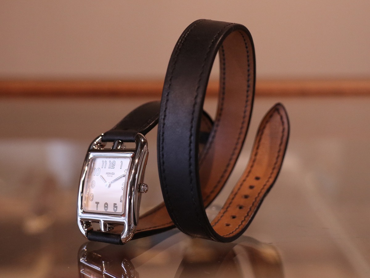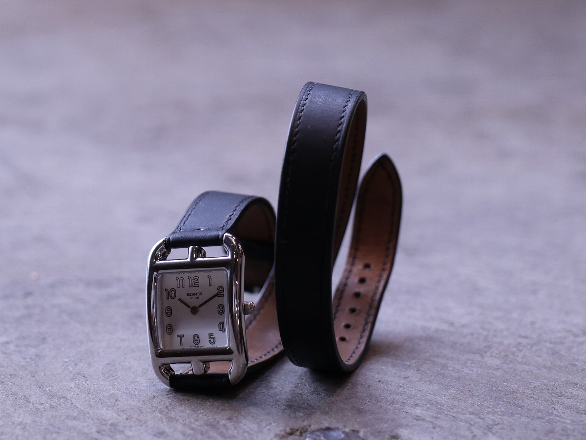 エルメスのコレクションを語る上で欠かせない存在である、マルタンマルジェラのデザインとして知られる「Cape Cod / ケープコッド」。レディースサイズでデザインされたアイテムであり23mmケースにはアラビアダイヤルがセッティングされ他に同一の物を見つける事の出来ない素晴らしいモデルです。2000年製のアイテムですが、発売当時のスウェードレザーブレスタイプと同等の人気を誇るブラックカーフレザーベルトは、二重巻きを表す「Double Tour / ドゥブルトゥール」。純正レザーブレスレットがとても良い風合いでお勧めです。