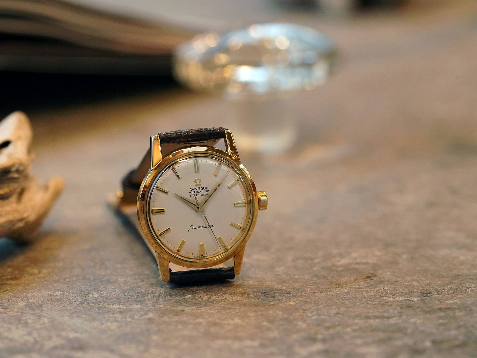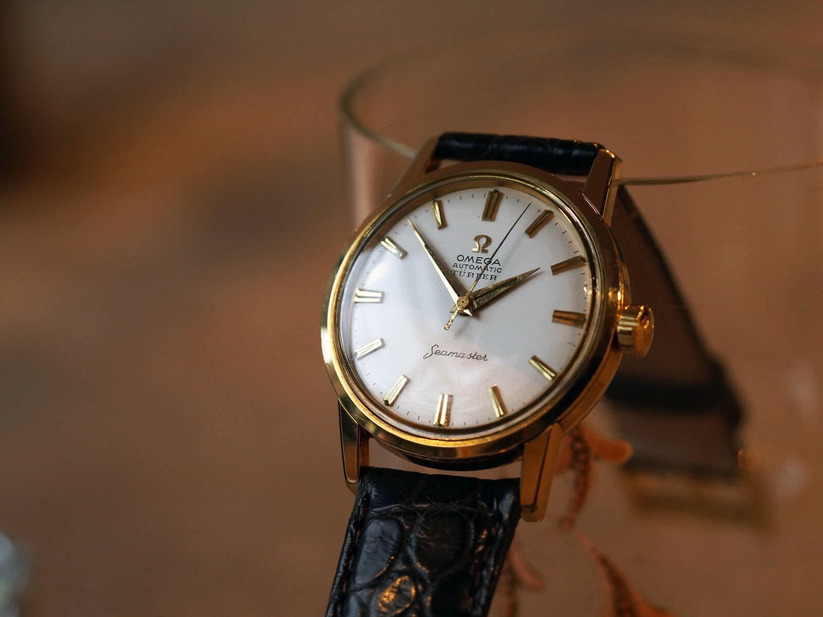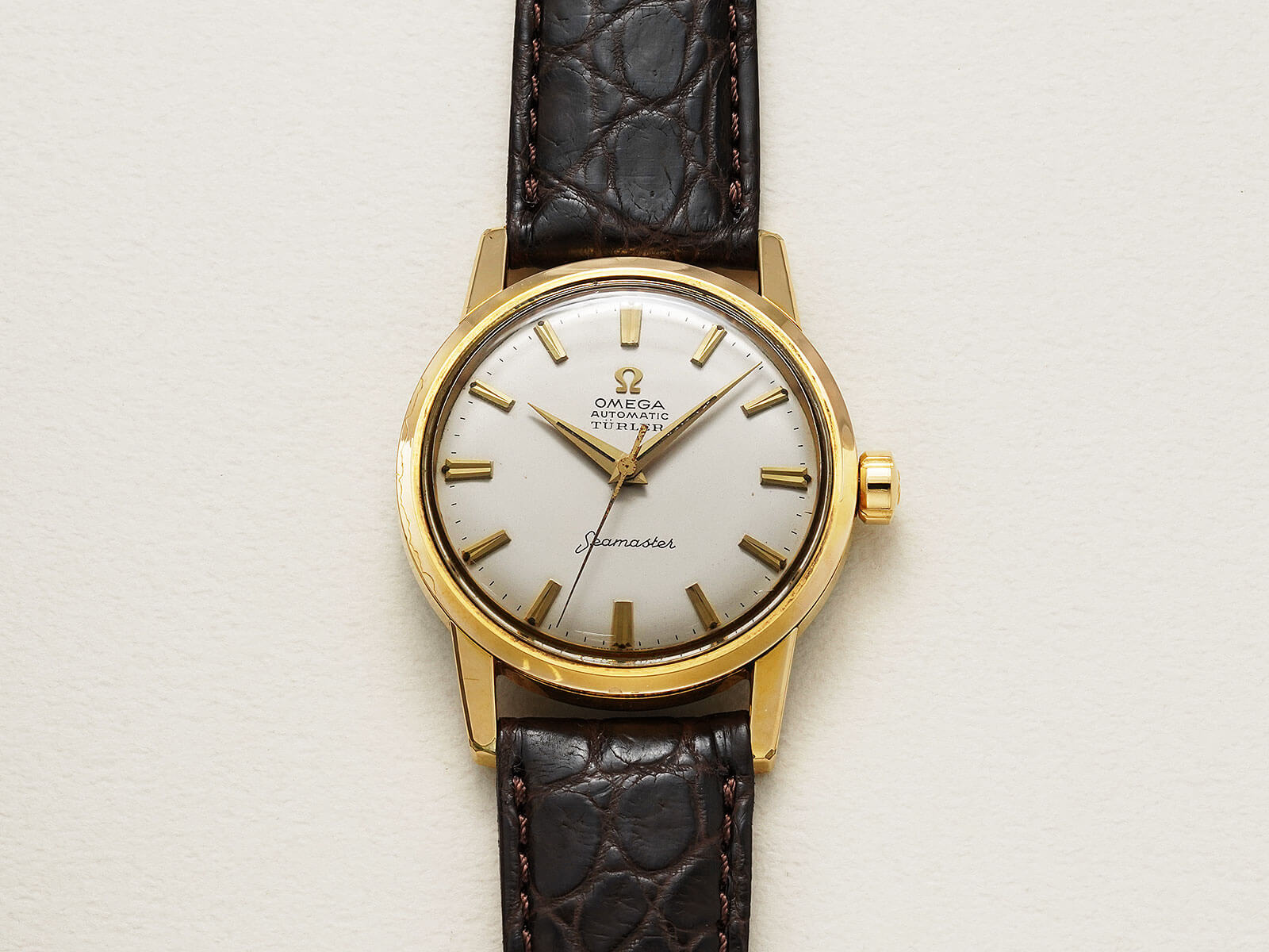 レザーブレスには、当店オリジナルのクロコダイルレザーベルトのブラウンをセレクトしております。オメガの一部モデルに見られるスイスのチューリッヒにある老舗高級宝飾店[Turler / チューラー]ネームが入っている事から、自社名入りとしてOMEGAにオーダーした特注モデルです。落ち着きのある美しさ、品格を感じさせてくれる素敵な時計です。是非店頭にてご覧ください。