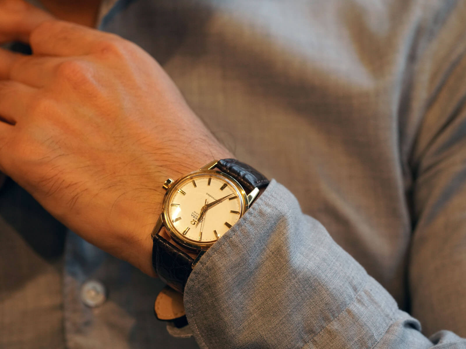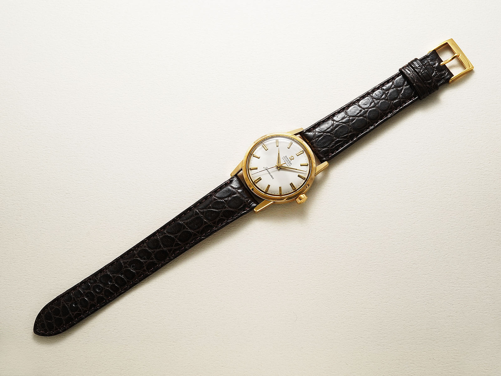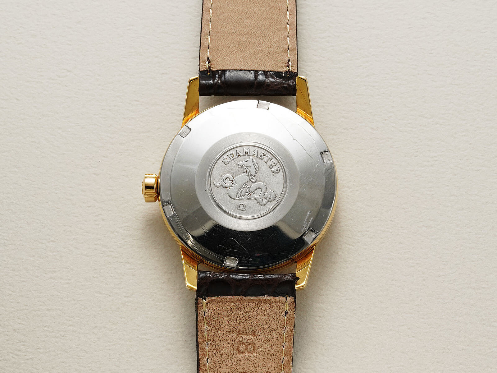 今回ご紹介するRef.14774SC-62は、落ち着きを感じさせてくれるシブいモデルです。シンプルなラウンドケースにサンドブラスト加工が施された綺麗なアイボリーダイヤルと、光の当たる角度によって輝きが変わる、細かなカッティングのされたアップライドインデックス。裏蓋にシーホースのメダリオンが刻印された、スクリューバック式キャップゴールドケースに竜頭のΩマーク、さらには「Seamaster」のロゴは初期モデルの証である「下がりS」と呼ばれるロゴも健在。それら全てがオメガの代表的モデルとして、スポーティーでありながらも伝統的で落ち着きのある、特別な存在感を堪能できます。