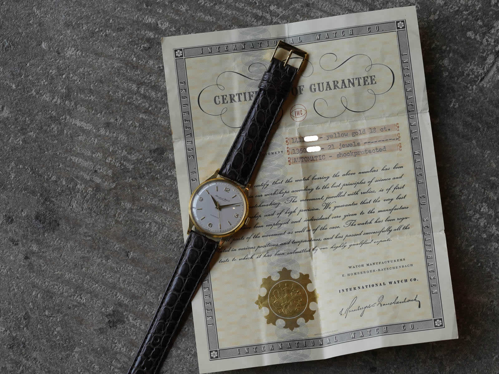 レザーブレスには当店オリジナルのクロコダイルレザーブレスのブラウンをセレクトしております。ヴィンテージですので使用感は御座いますが、ケース、ムーブメント、全ての状態の良さを感じさせる、60年以上前のものとは思えない素晴らしいコンディション。貴重なIWC純正ギャランティーも付属しており、品格のあるディティールだけで無く、大切にされて来た事も想像出来る、とても味わいのある素敵な時計です。ぜひお手に取って御覧ください。