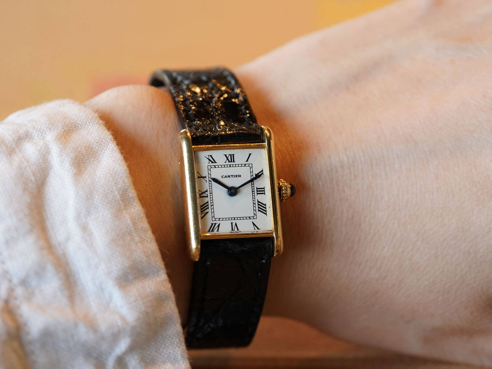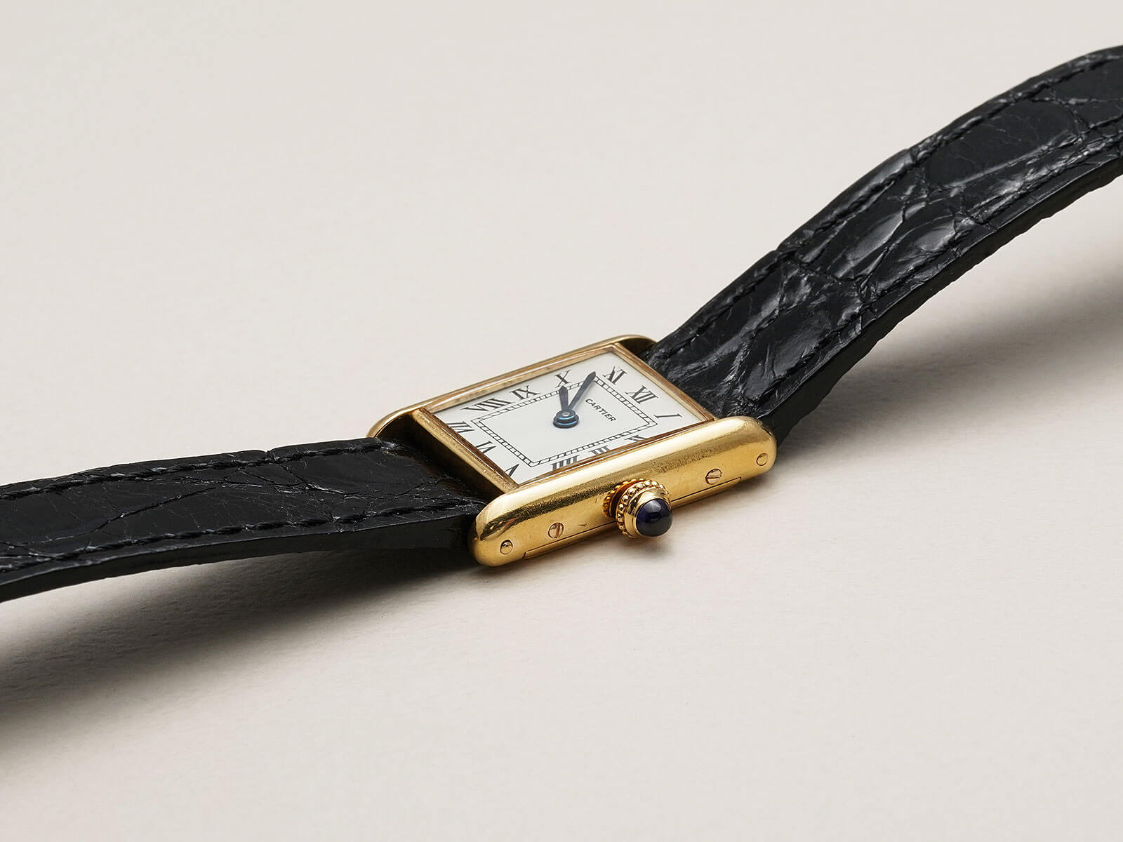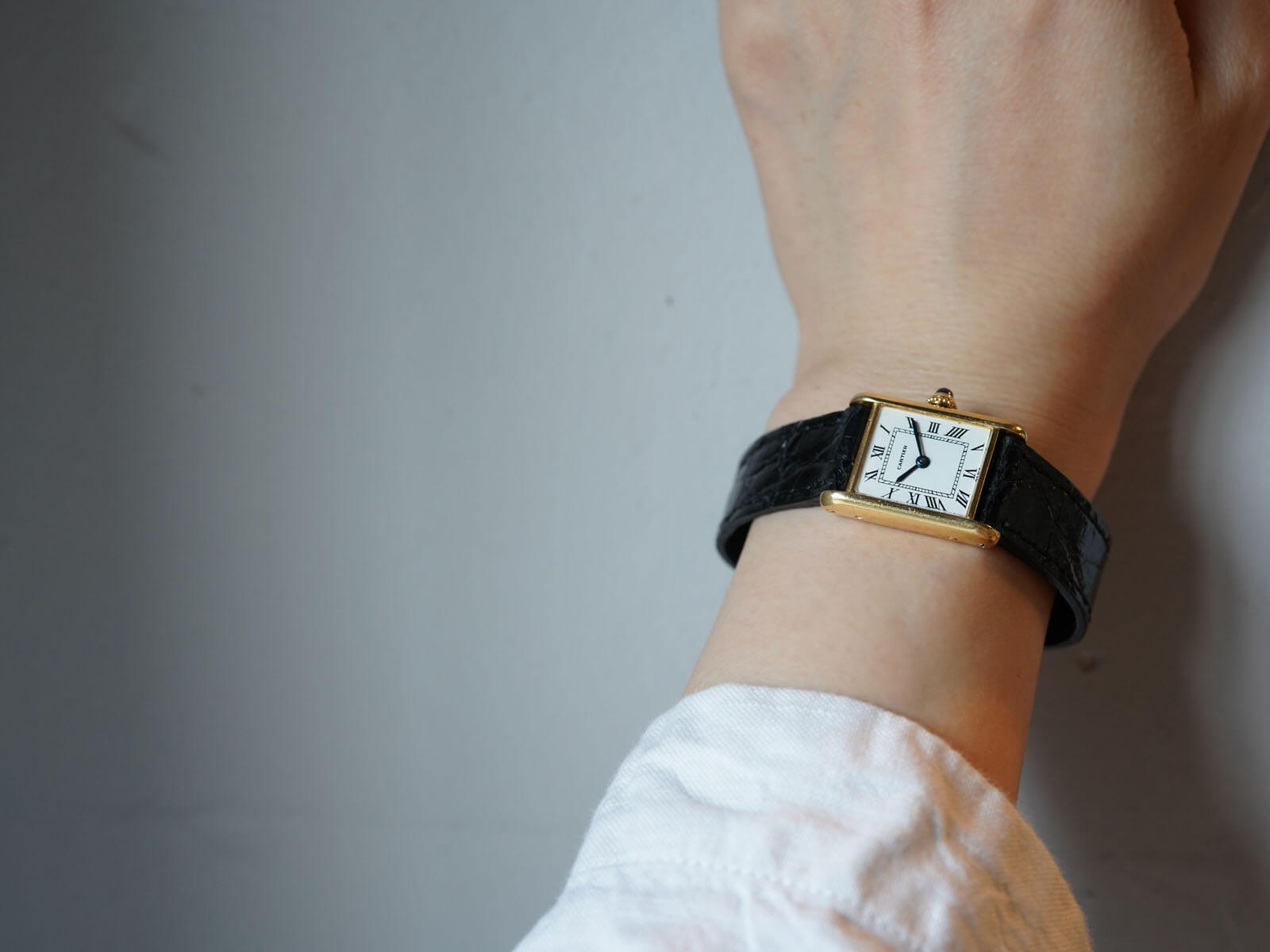 今回は、タンクルイカルティエの中でも小ぶりな19mmのケースサイズが大変人気の[Mini Tank Louis Cartier / ミニタンクルイカルティエ]Ref.03をご紹介です。美しい形状の丸みを帯びた当時のカボションリューズ、綺麗なブルースチール針と最初期から変わらない伝統的なホワイトローマンダイヤルに70年代を象徴するPARISレターが表記された、趣のあるクラシカルな雰囲気を漂わせてくれます。レクタンギュラーケース(長方形)とカルティエらしい貴重なディテールが、優美な魅力を放ち、気品高く、そしてお洒落にお手元を演出してくれます。