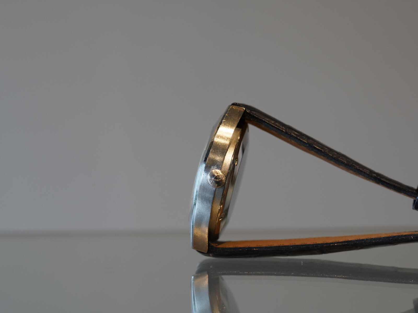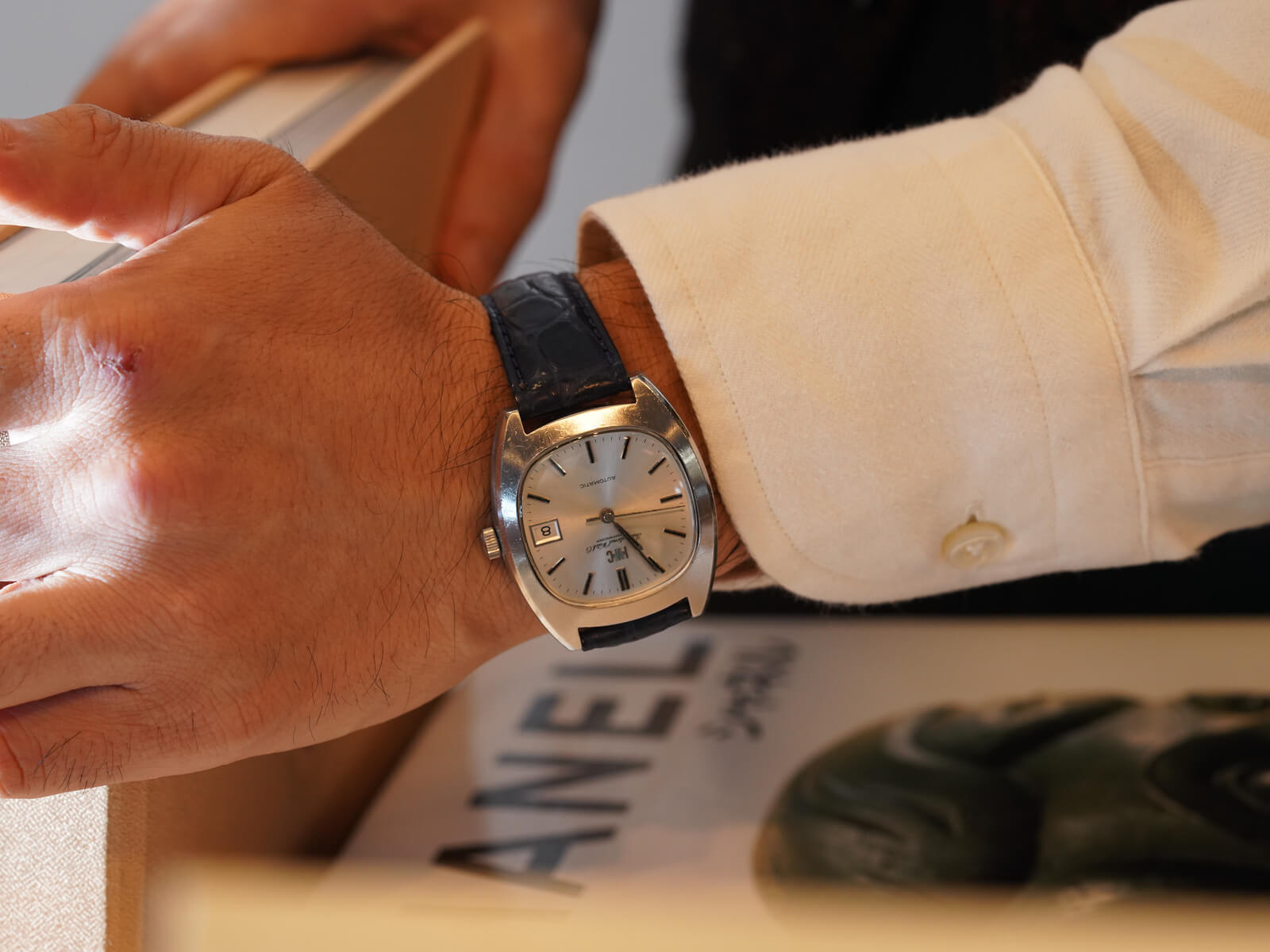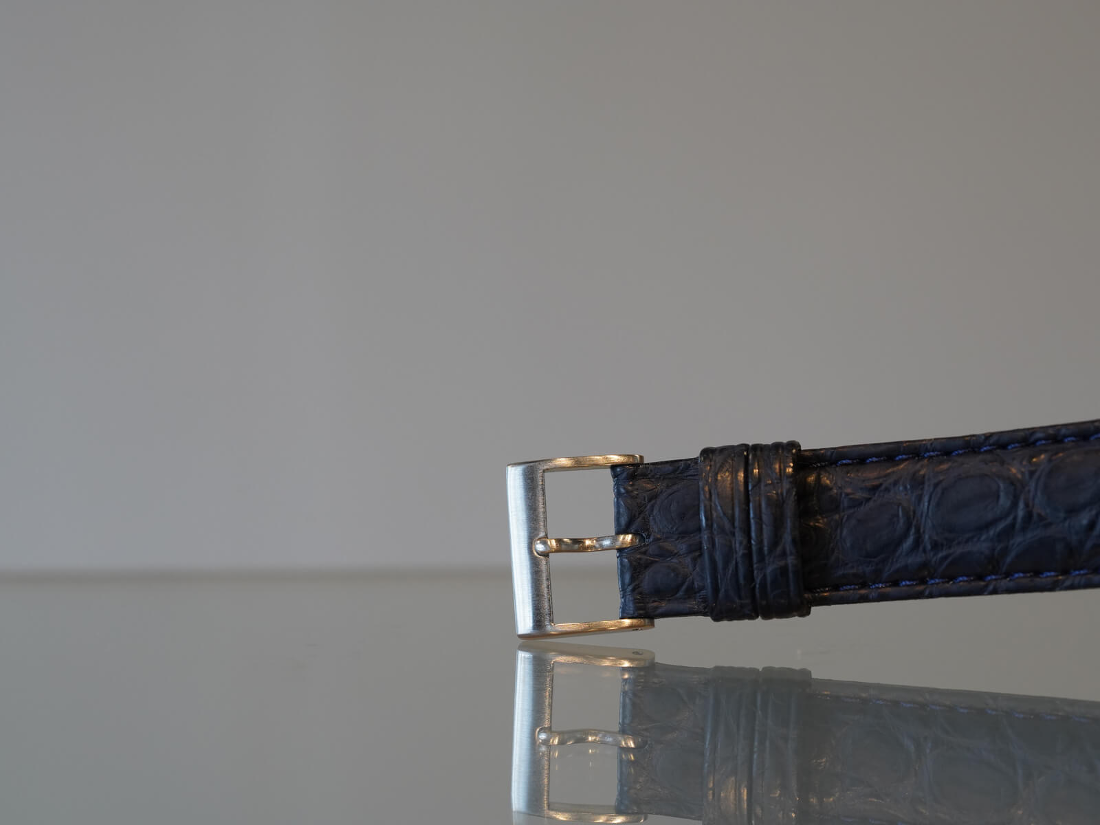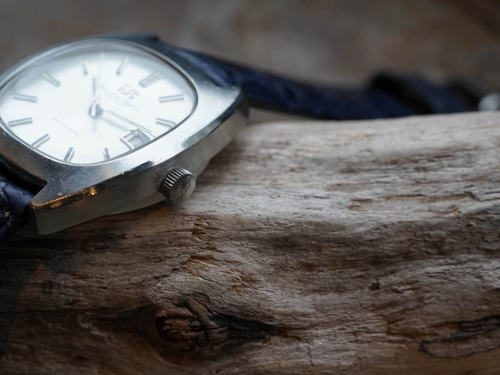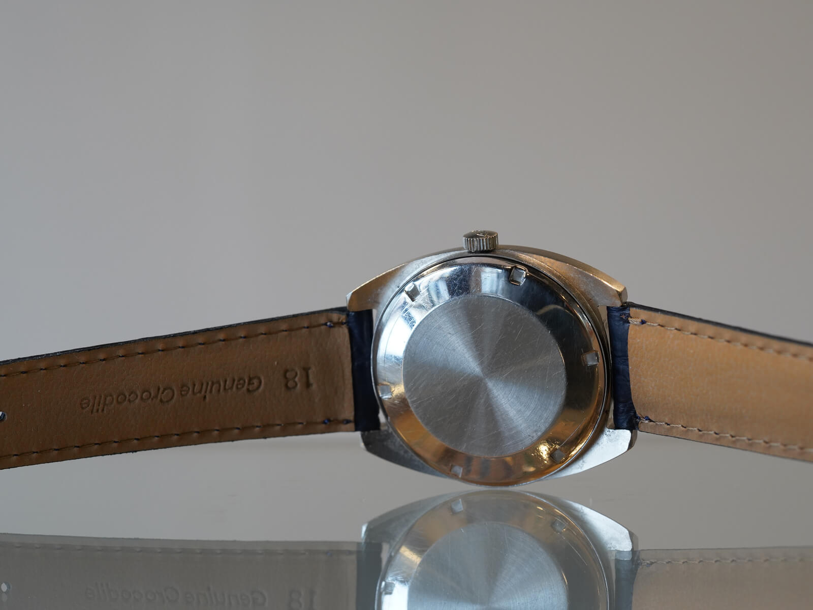 レザーブレスには当店オリジナルのクロコダイルレザーブレスのネイビーをセレクトしております。間違いなく現代には存在しないケースデザインに、シャープで精悍な顔立ち持った素晴らしい時計です。是非店頭にてお手に取ってご覧ください。