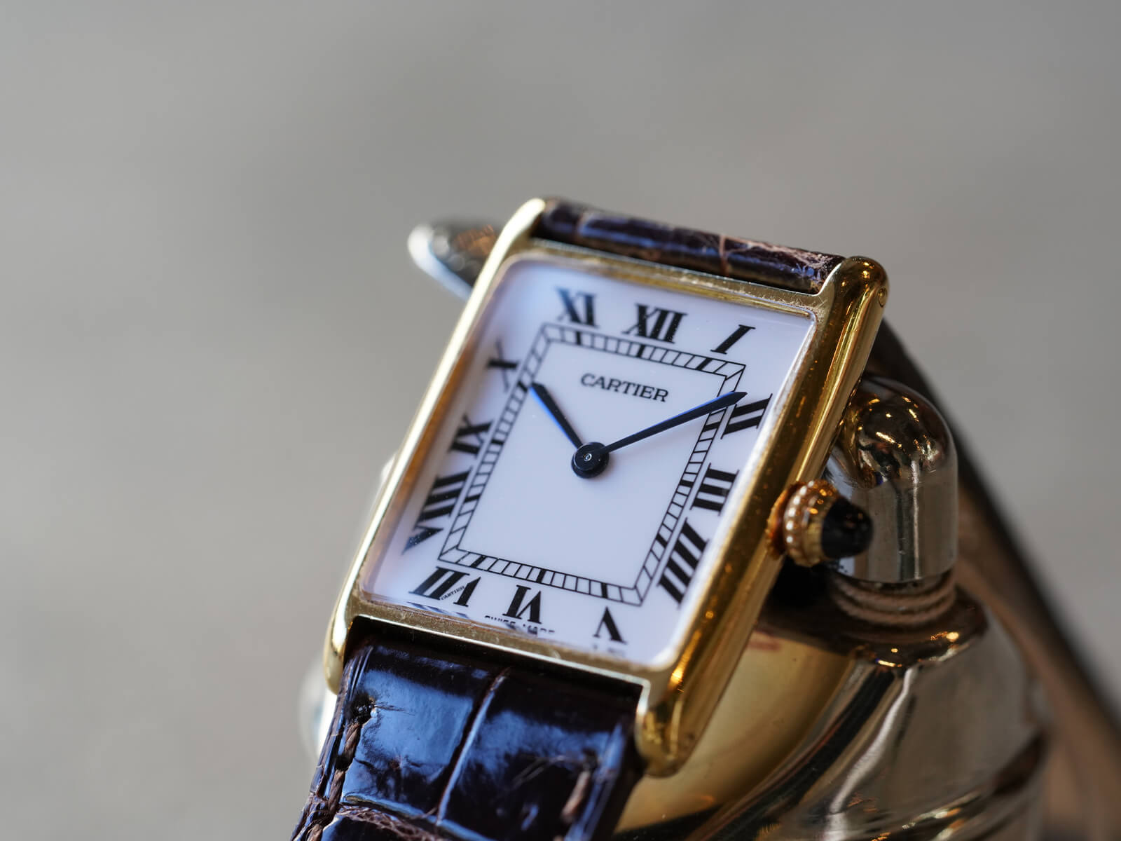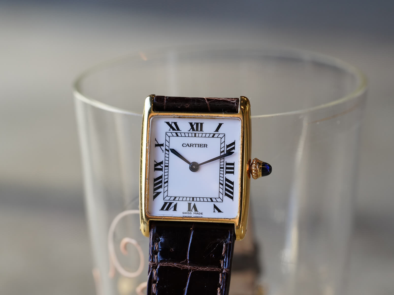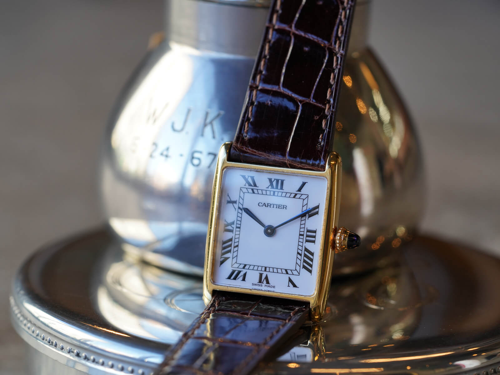 レザーブレスには、当店オリジナルのクロコダイルレザーベルトのシャイニーブラウンをセレクト。今回の個体は、メーカーにて近代的な純正ダイヤルに変更された為、6時下の表記はSWISS MADEとなっております。直線的なデザインの多いカルティエの中でも、緩やかな曲線が美しく、控えめなジュエリーとしても存在感を発揮してくれる素晴らしい時計です。是非お手に取ってご覧ください。