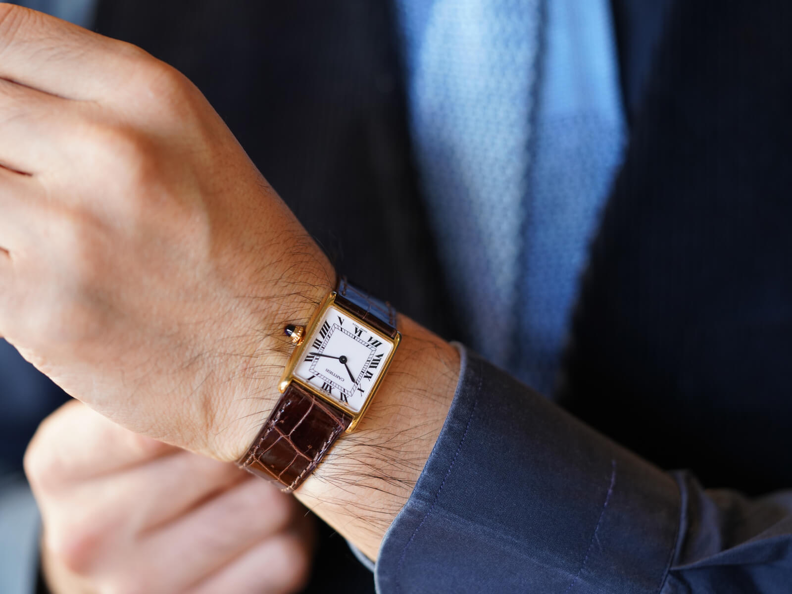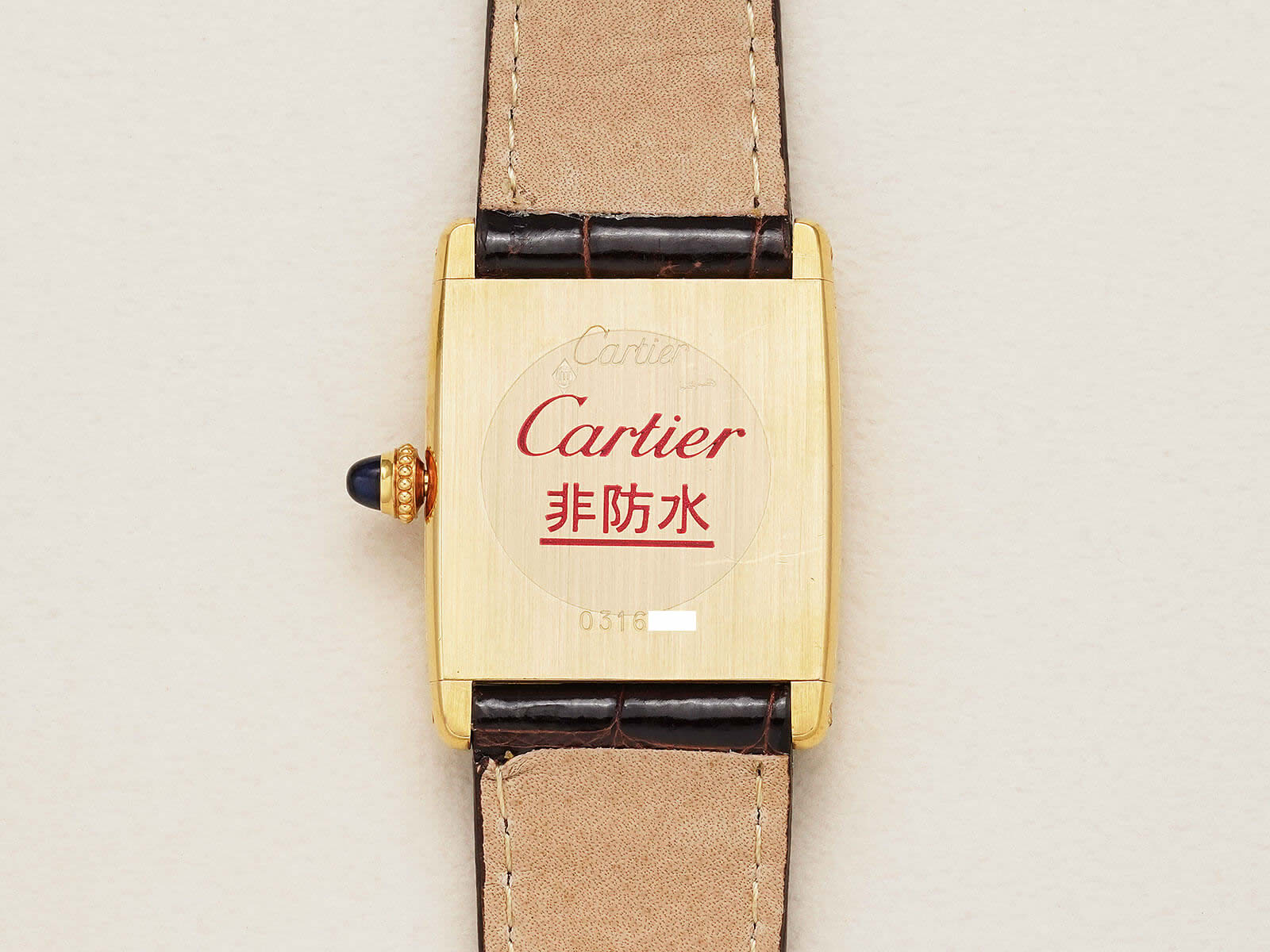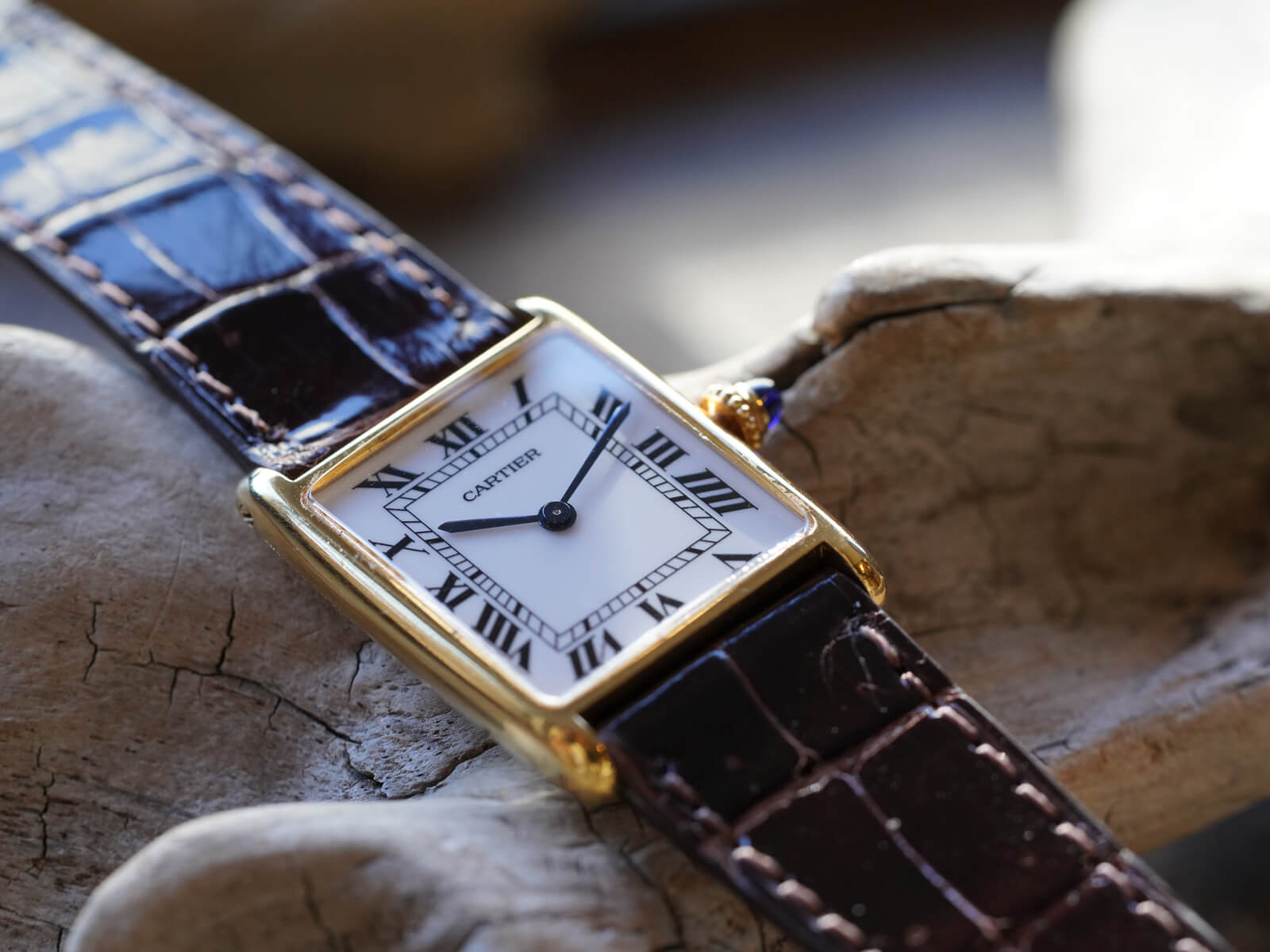 レザーブレスには、当店オリジナルのクロコダイルレザーベルトのシャイニーブラウンをセレクト。今回の個体は、メーカーにて近代的な純正ダイヤルに変更された為、6時下の表記はSWISS MADEとなっております。直線的なデザインの多いカルティエの中でも、緩やかな曲線が美しく、控えめなジュエリーとしても存在感を発揮してくれる素晴らしい時計です。是非お手に取ってご覧ください。