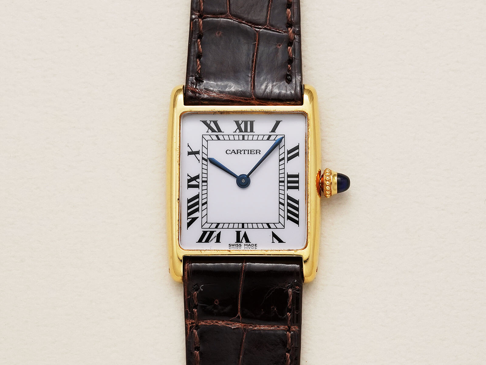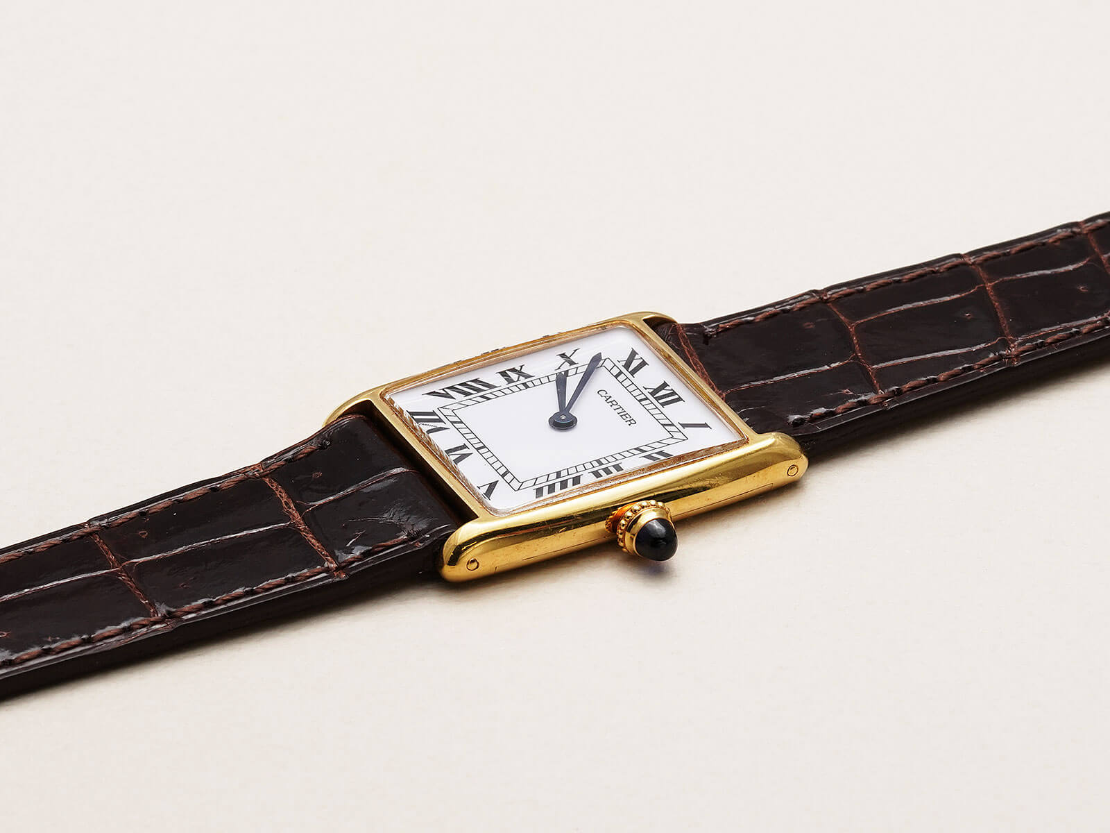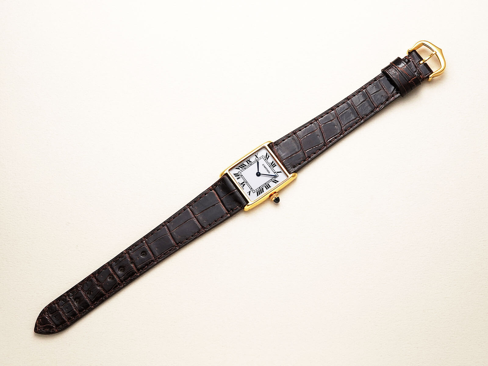 今回ご紹介の61705は、直線で構成されるタンクルイとは違う、柔らかい印象の曲線を描いた、独創的なフォルムが特徴的なモデルです。伝統のホワイトローマンダイヤルに、状態の良いブルースチール針と美しく理想的な形の砲弾型サファイアカボションリューズ等の貴重なディテールが揃い、カルティエらしさと卓越した美しさを感じさせてくれる逸品です。