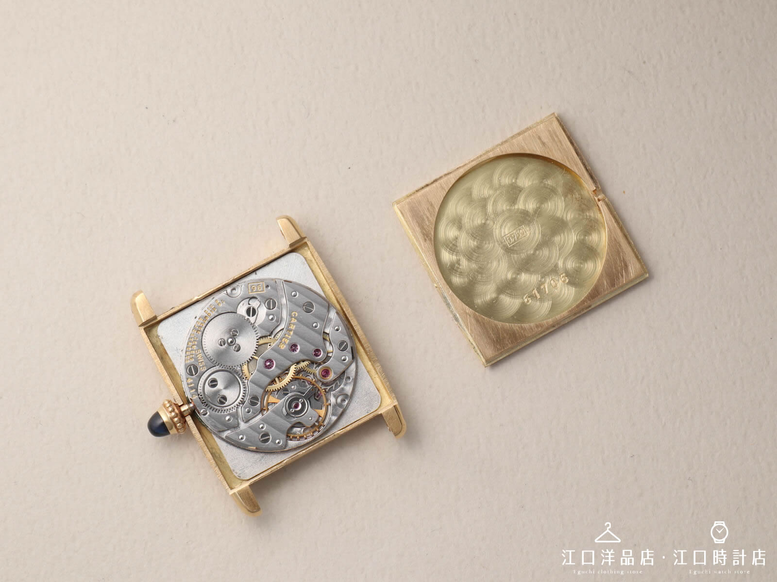 ムーブメントは、「フレデリックピゲ/Frederic Piguet」製の極薄キャリバー21同系のキャリバー96を搭載。4mmと言う薄型ケースに収められたマニファクチュールムーブメントは、カルティエウォッチの初期ディテールであり、EWC時代の素晴らしいディテールといえます。パテックフィリップがルクルト社以外のエボーシュとして選び、名機となるベースにもなった最高級のムーブメントです。