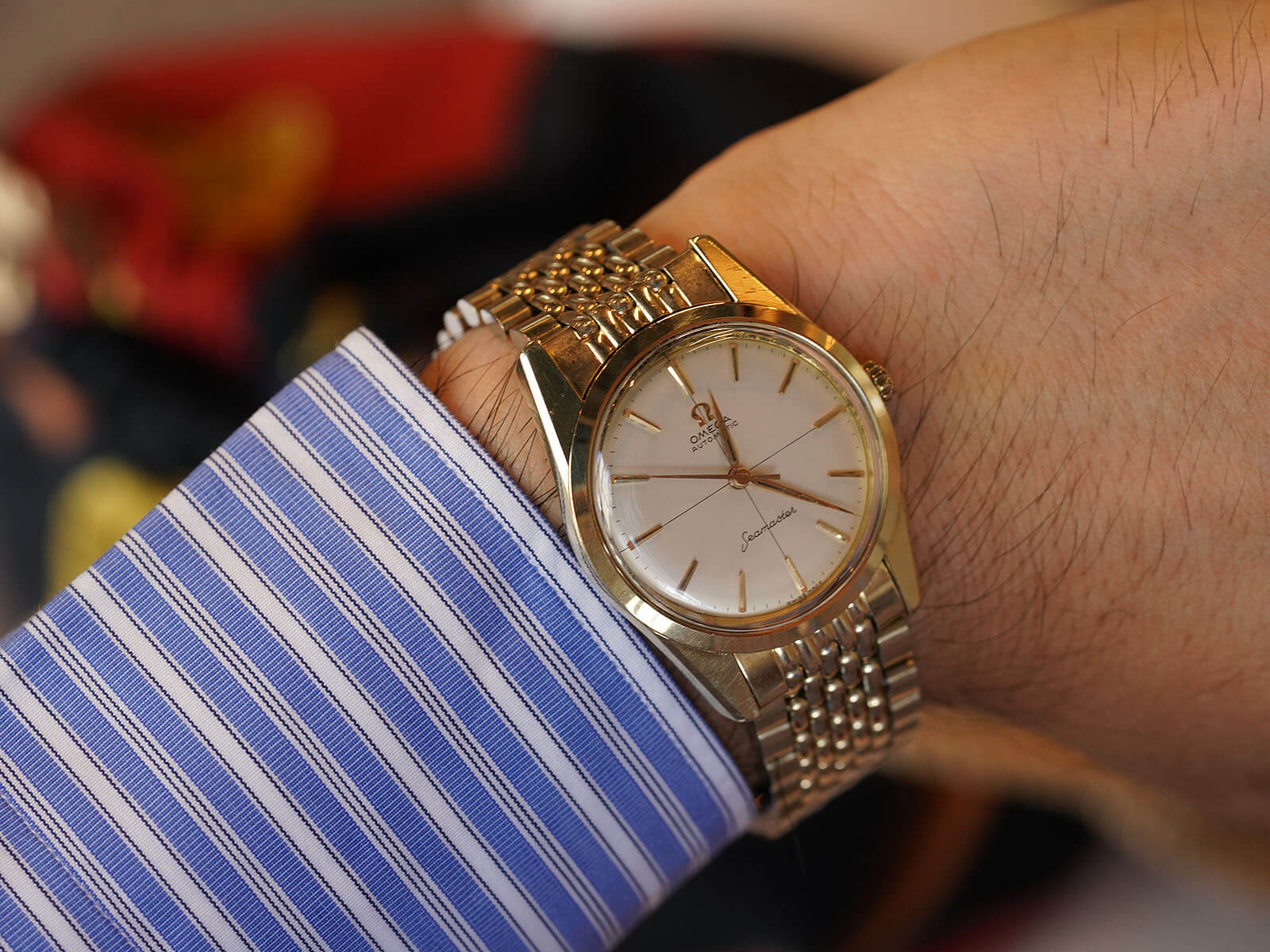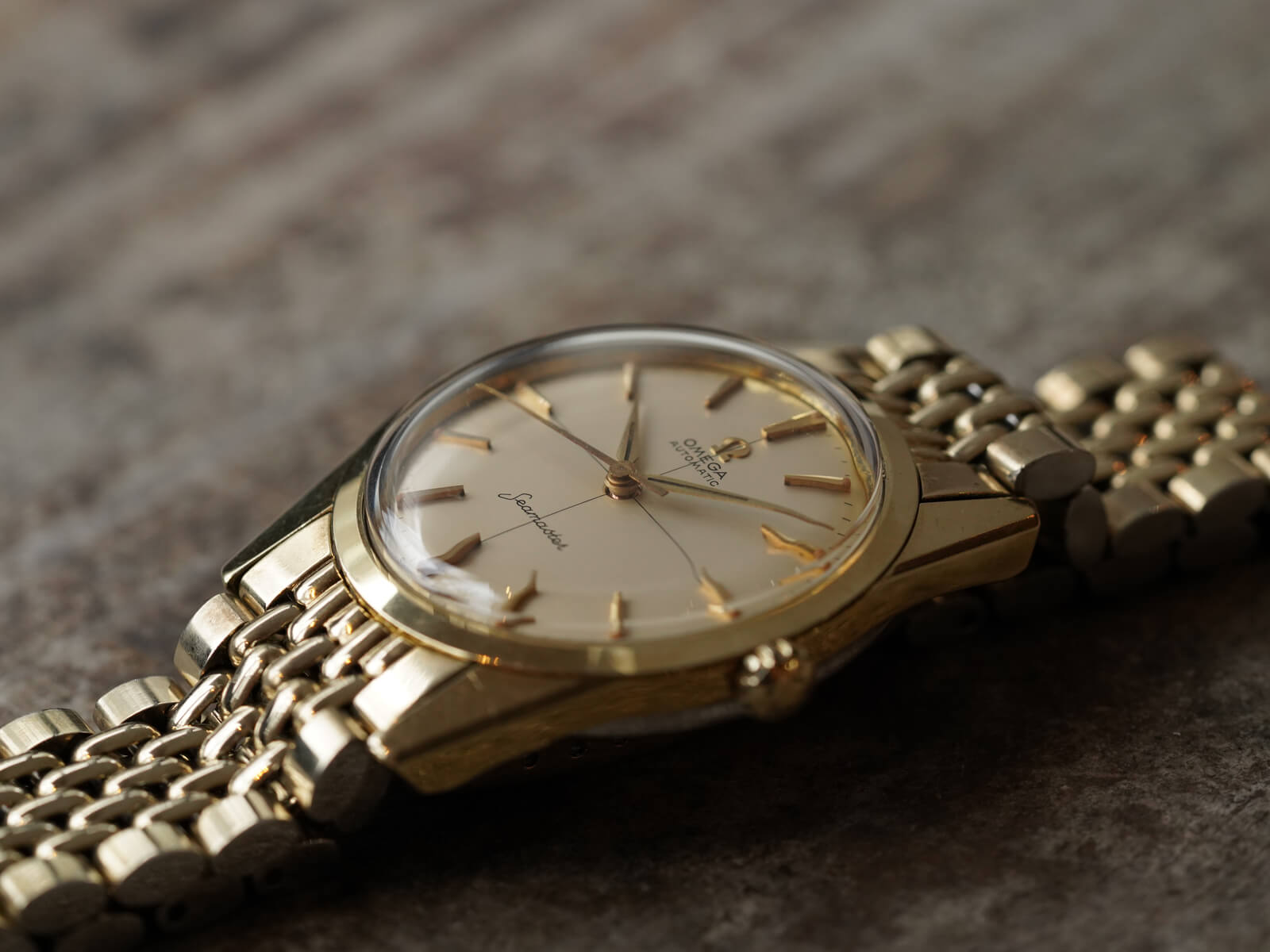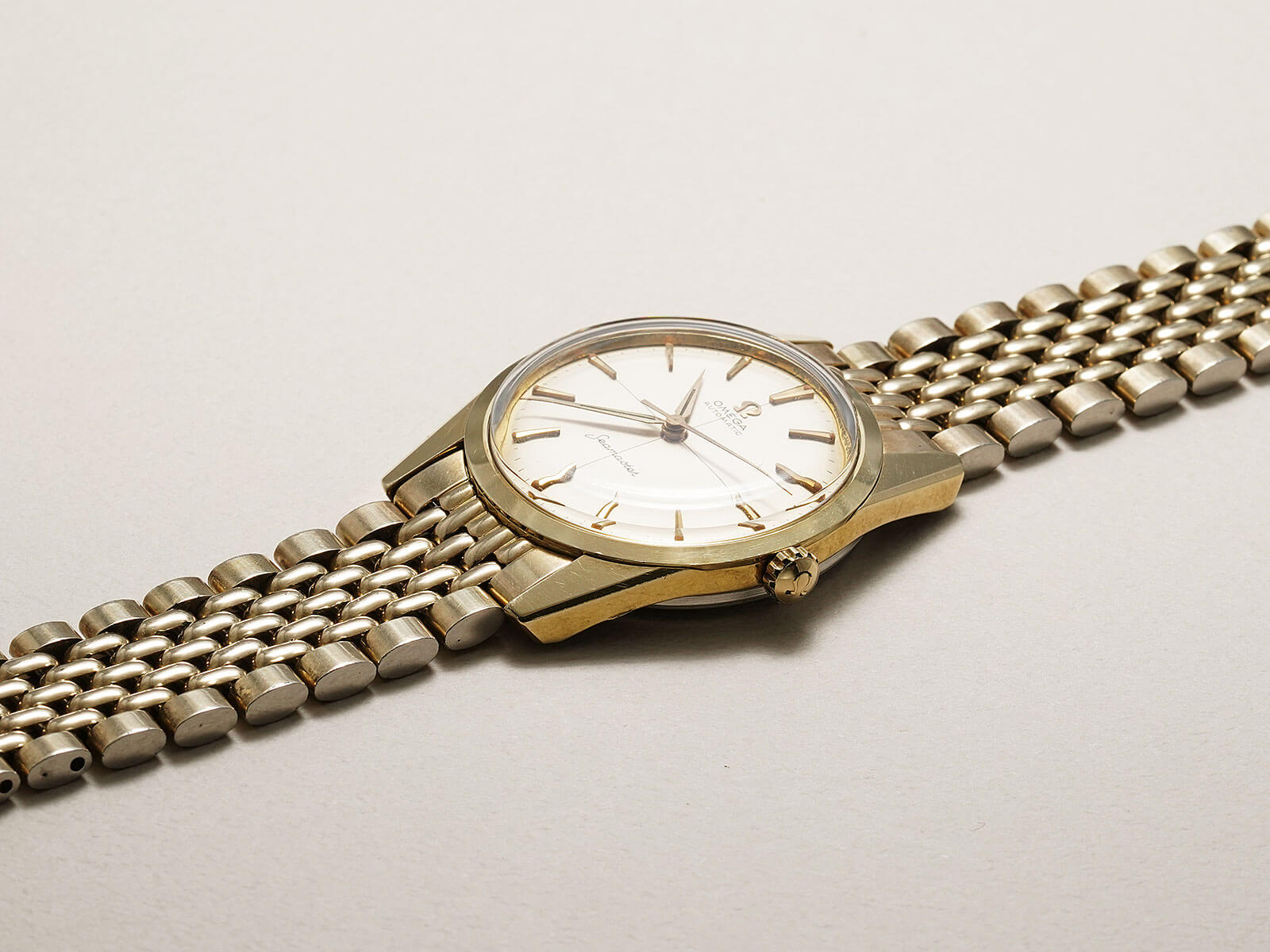 今回ご紹介のRef.14700-2-SCは、とても珍しいキャップゴールドされた純正ブレスが付属した個体です。60年代に入りスタンダードになりつつあるスクリューバックケースとすっきりとした印象の細いベゼル、サンドブラスト加工の綺麗なアイボリーダイアルにクロスラインとバーインデックスが、シンプルでいて洗練されたアンティークの雰囲気を感じさせてくれます。そしてオメガらしいスポーティーなアルファハンド、ロングSを持つ初期型のシブいロゴがマニア心を擽ります。
