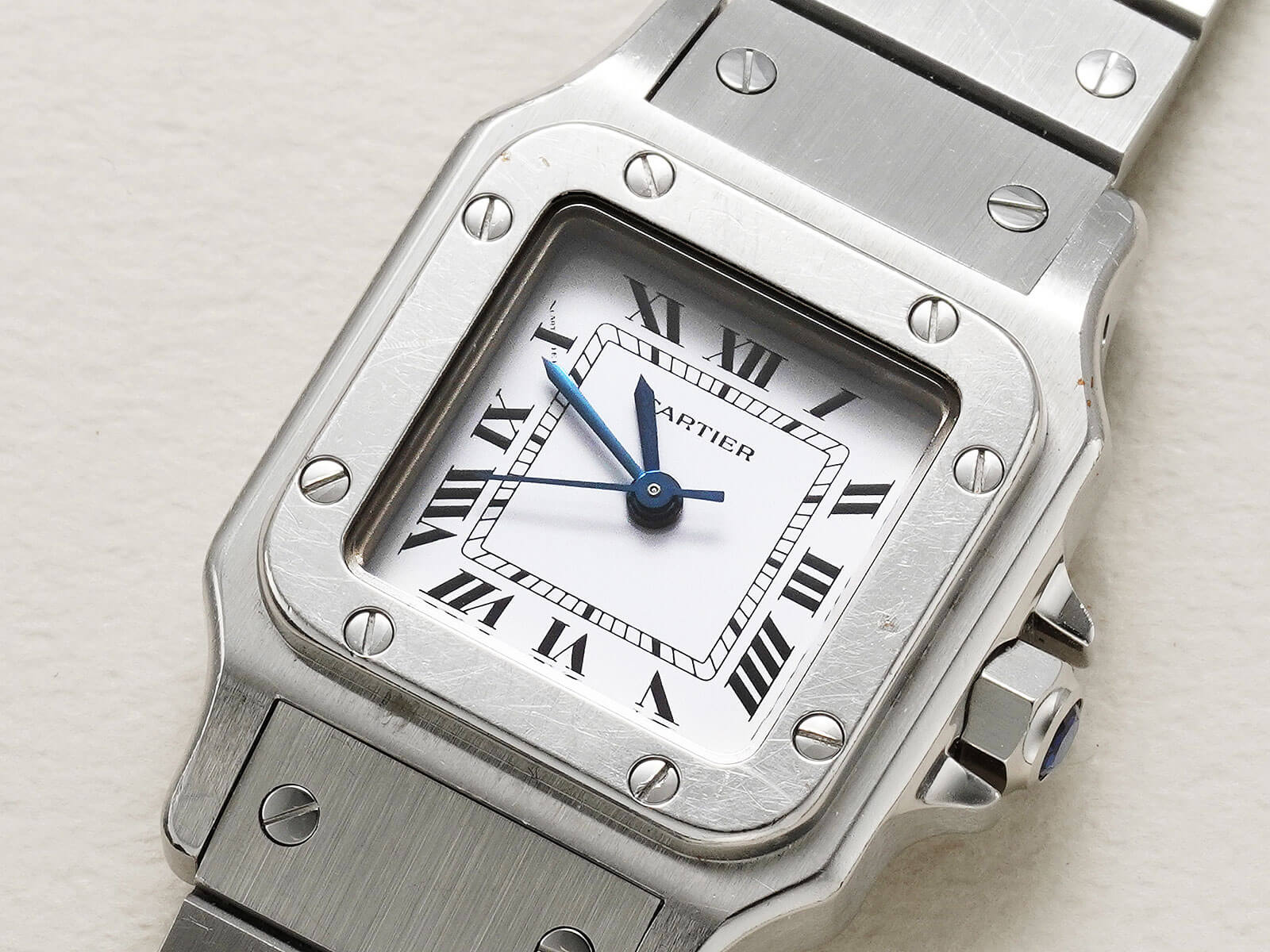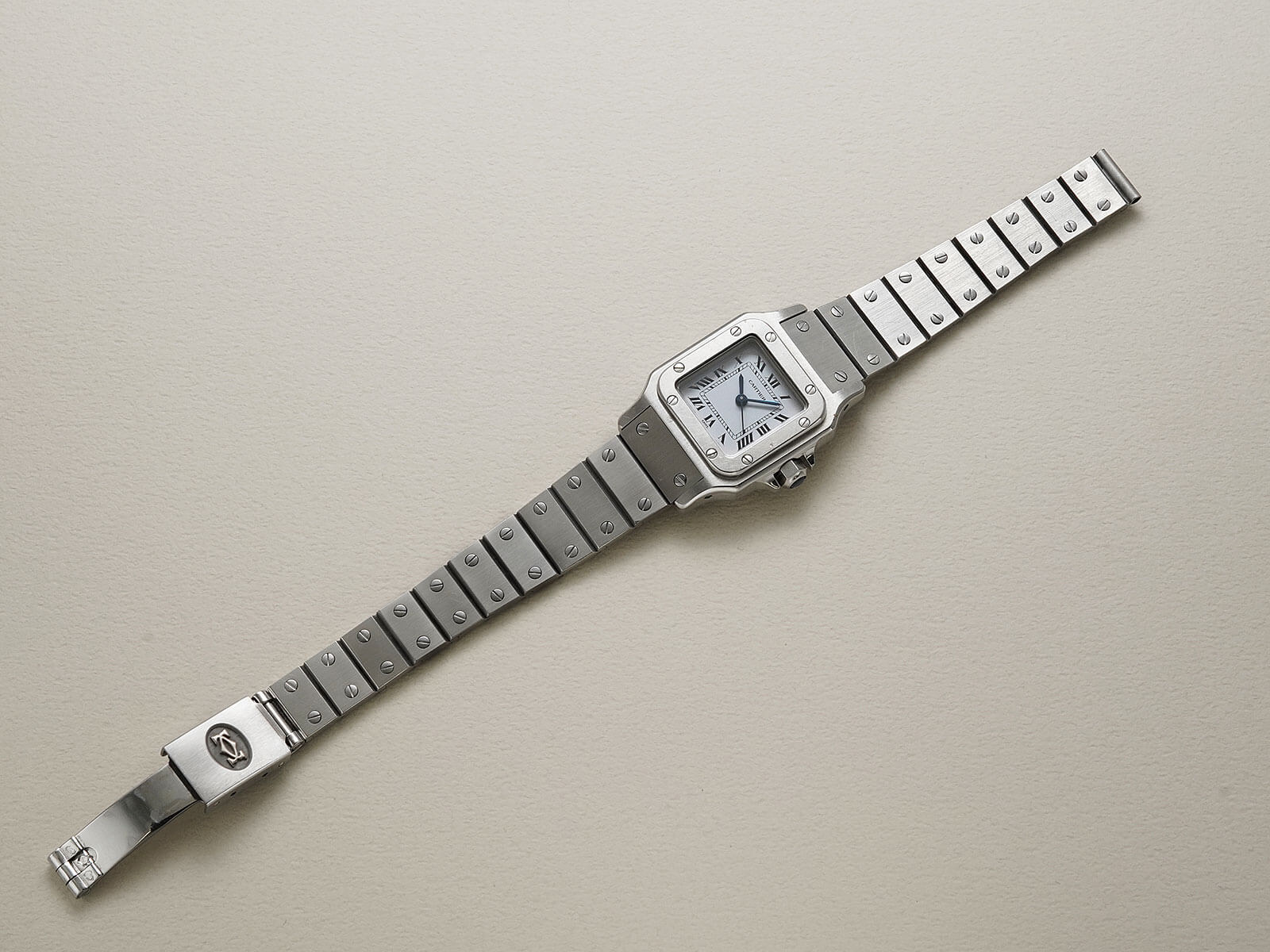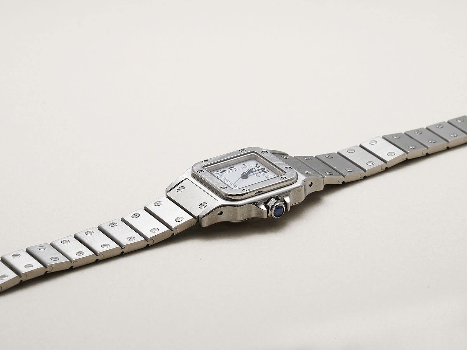 1904年、当時のスタイルアイコンとして知られる、カルティエの友人でもあった飛行士・アルベルト・サントス=デュモンより、「飛行中に時刻を知りたい」と相談を受け、世界初の腕時計「サントス / Santos」を制作。そういった重要な歴史的ルーツを持つ[Santos Galbee / サントスガルベ]は、1970年代に流行したサントスのスポーツモデルにあたり、ステンレスを使用したサントスは過去にも製造された事が無く、防水ケースとアイコニックなスタイルで、カルティエウォッチの名を一躍有名にしたモデルです。