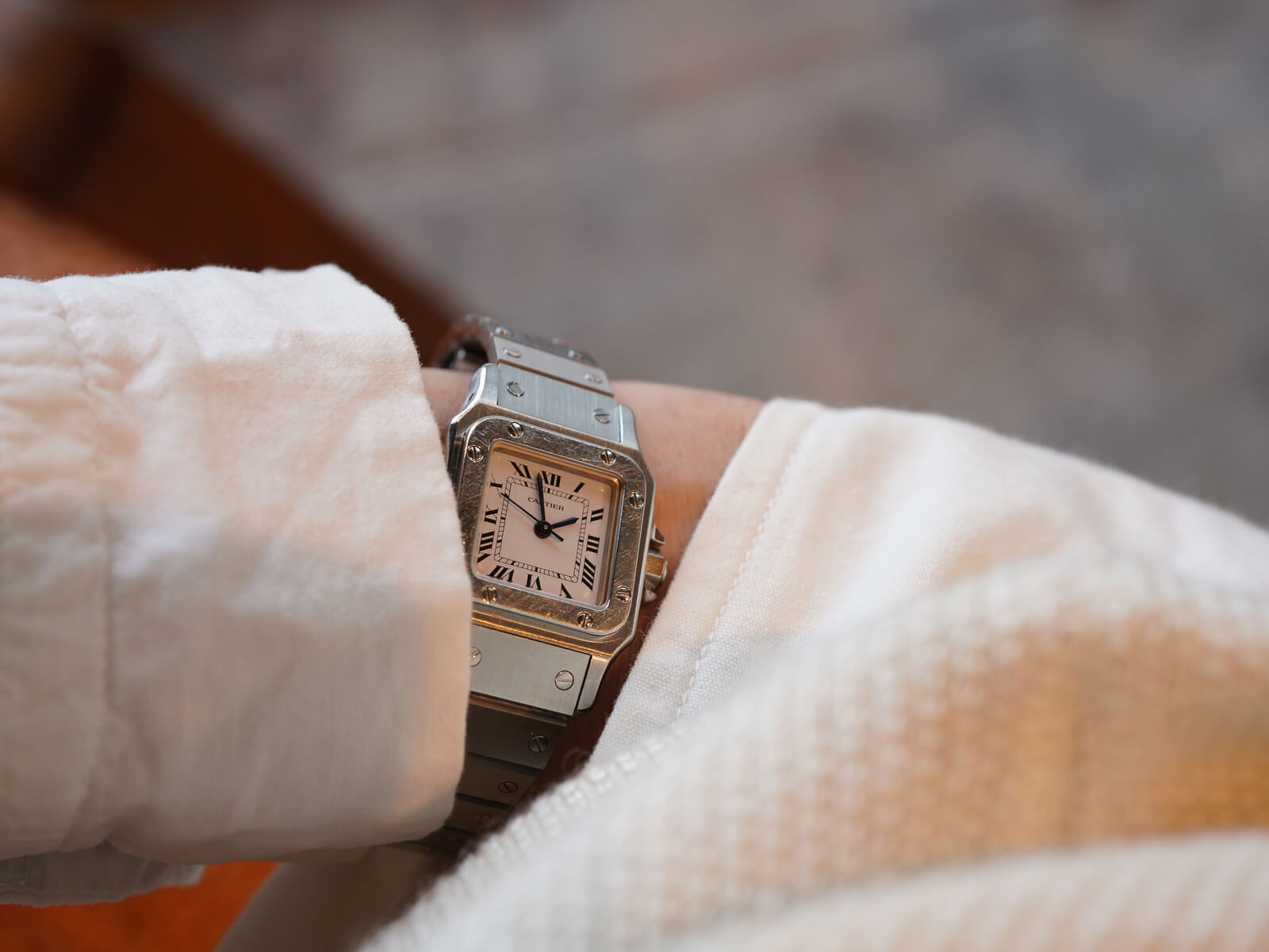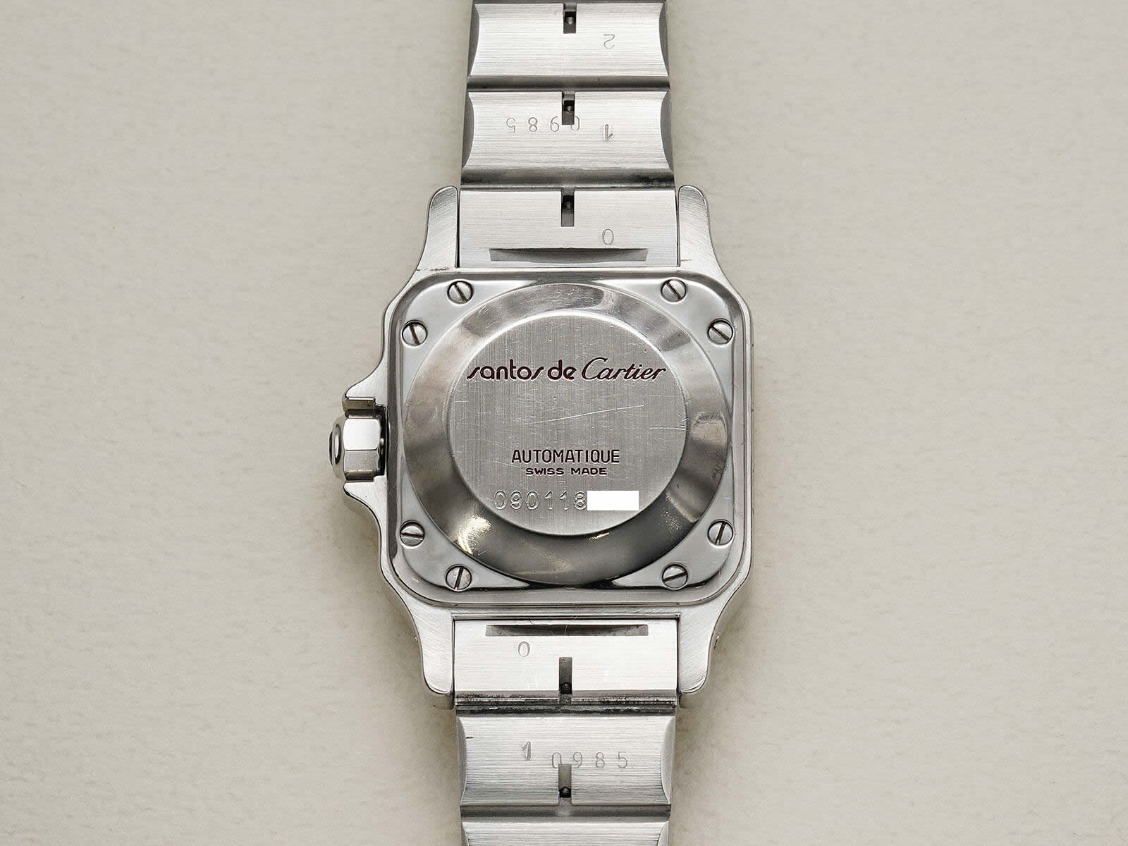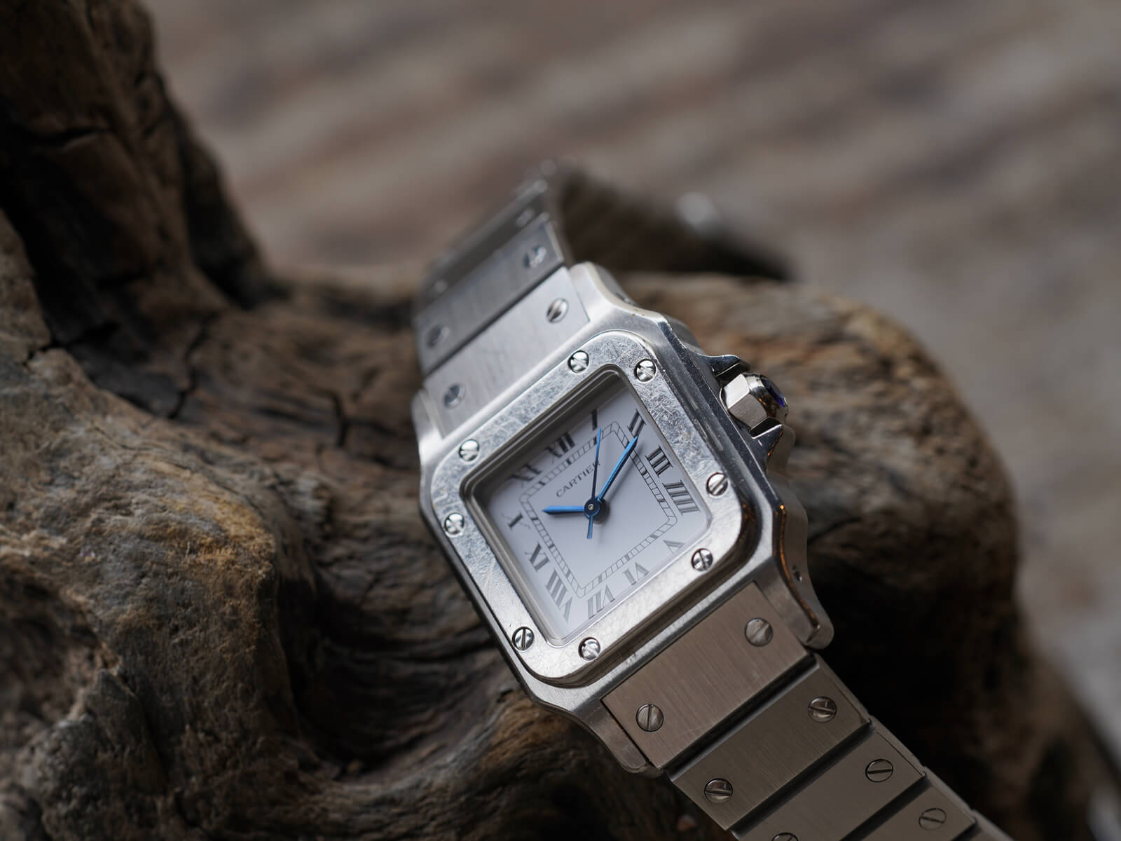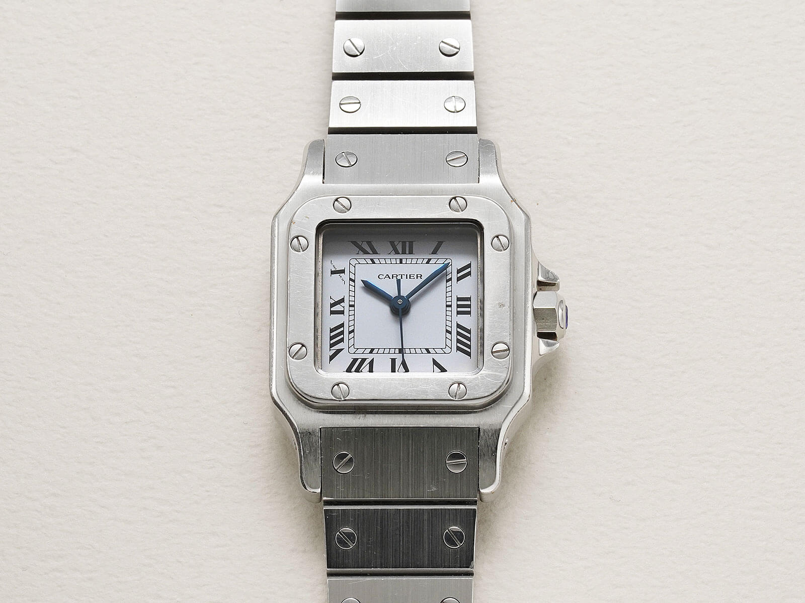 1904年、当時のスタイルアイコンとして知られる、カルティエの友人でもあった飛行士・アルベルト・サントス=デュモンより、「飛行中に時刻を知りたい」と相談を受け、世界初の腕時計「サントス / Santos」を制作。そういった重要な歴史的ルーツを持つ[Santos Galbee / サントスガルベ]は、1970年代に流行したサントスのスポーツモデルにあたり、ステンレスを使用したサントスは過去にも製造された事が無く、防水ケースとアイコニックなスタイルで、カルティエウォッチの名を一躍有名にしたモデルです。