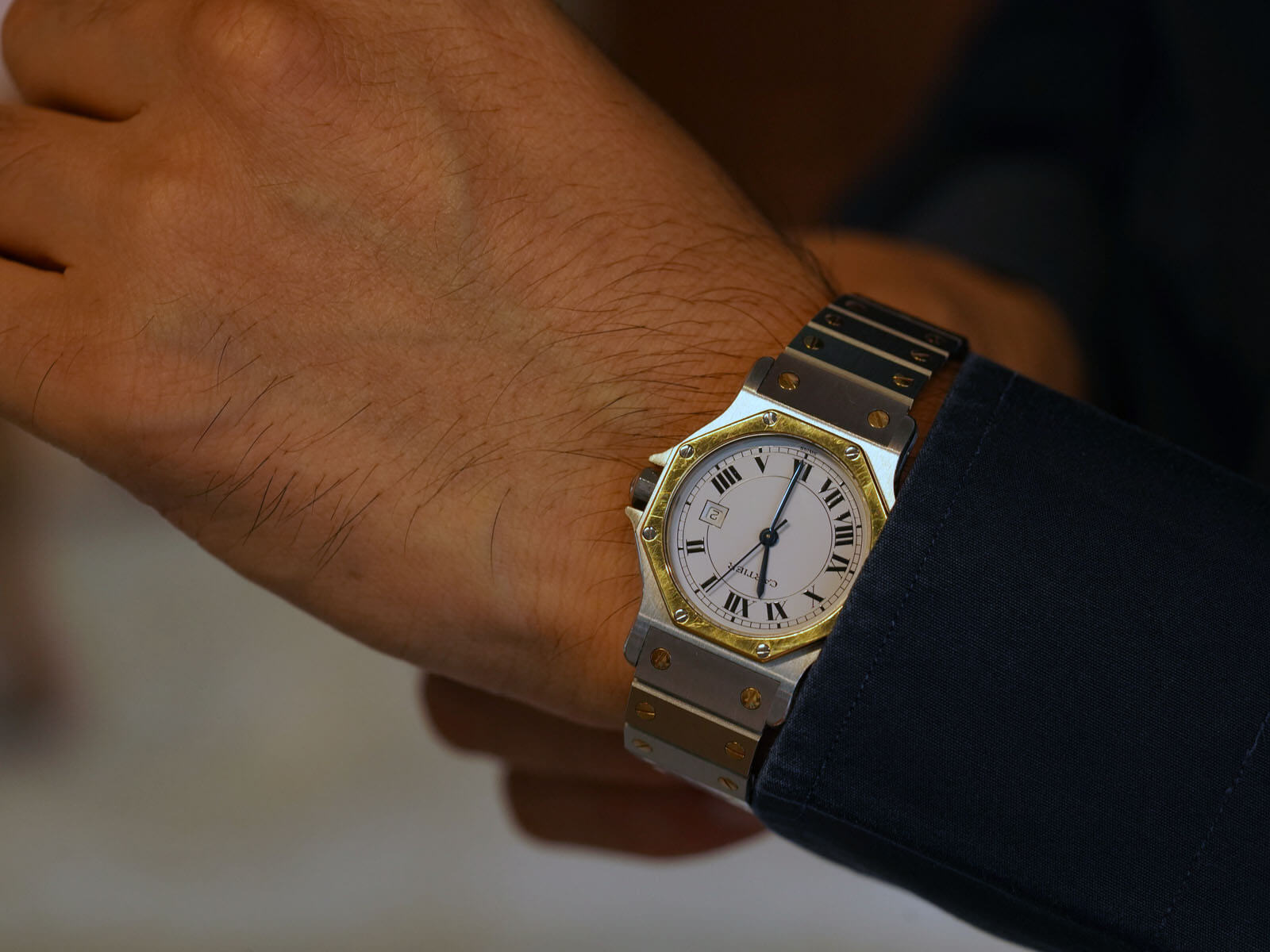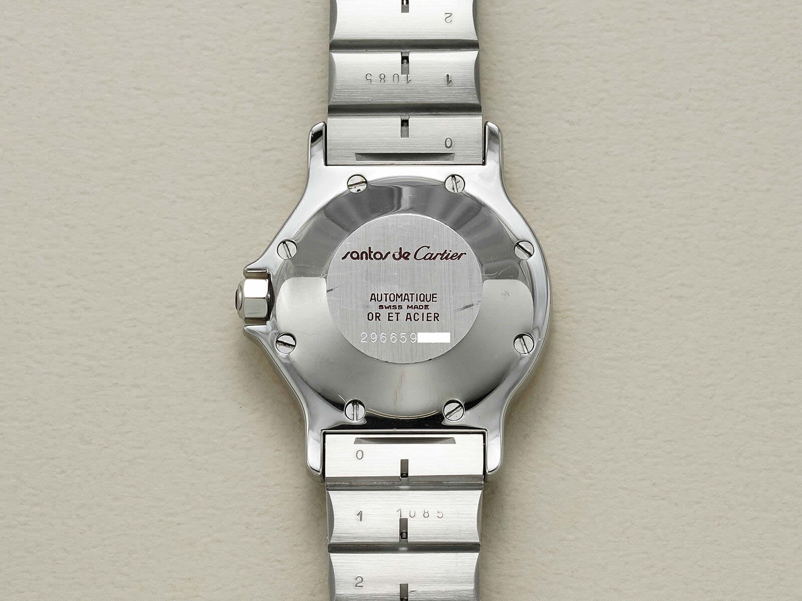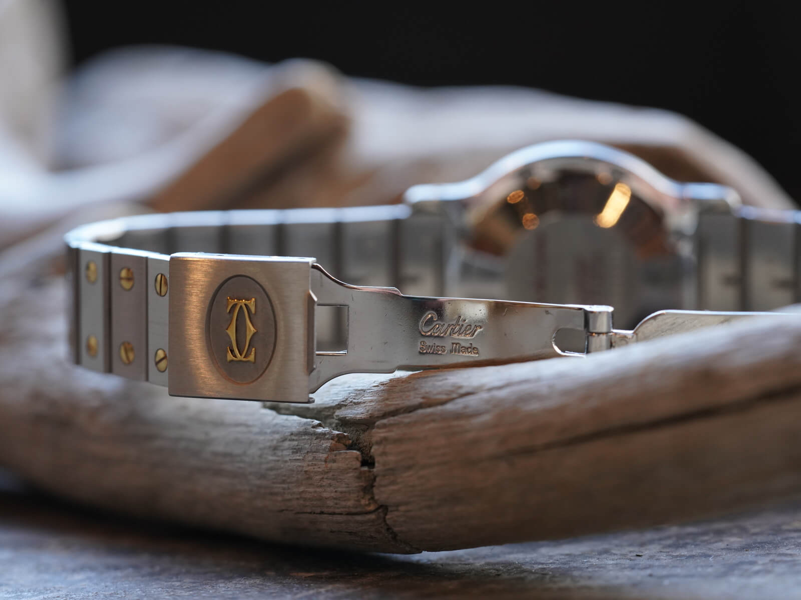 今回ご紹介のRef.2966は、モデル発売当初にしか存在しない自動巻きムーブメント搭載の一本です。ジュエラーらしいソリッドゴールドを使用したデザインに、伝統のホワイトローマンダイヤルと、ブルースチールハンドにカボションリューズ。ステンレスケースとのコンビカラーが、洗練されたジュエリー要素を感じさせてくれるスポーツウォッチ。この感覚は他の時計ブランドからは感じることのできない、カルティエならではの高度なデザイン言えます。