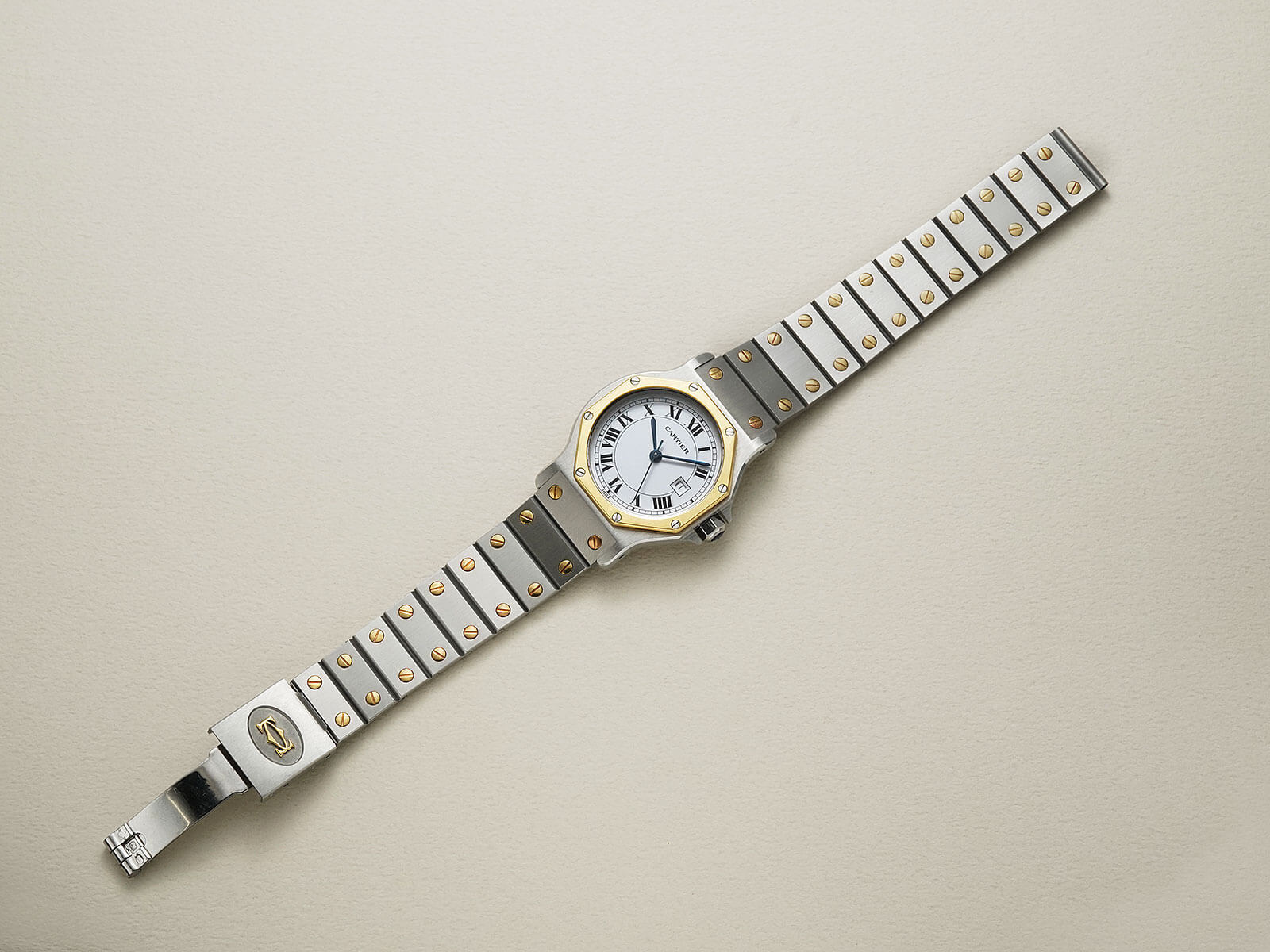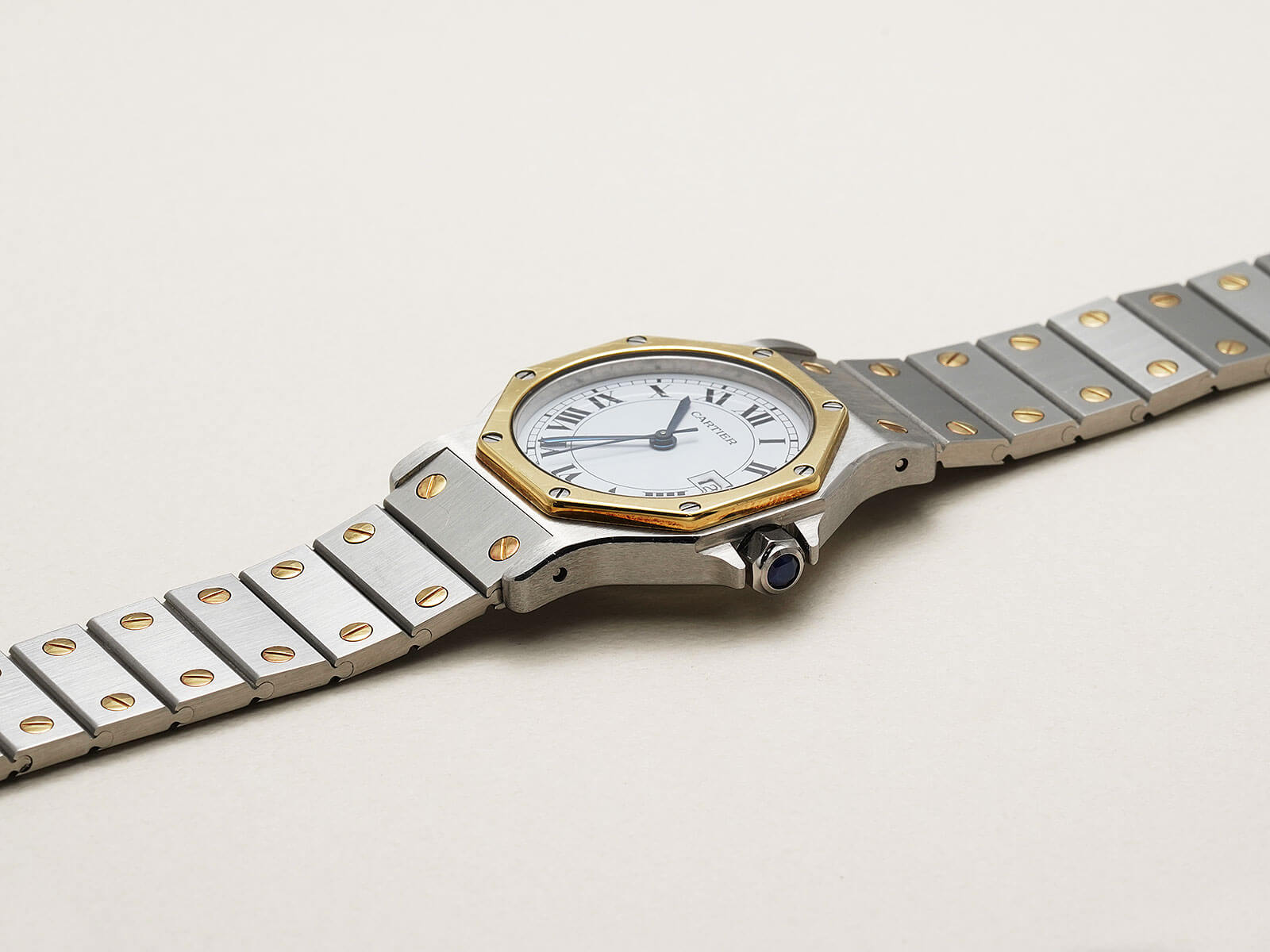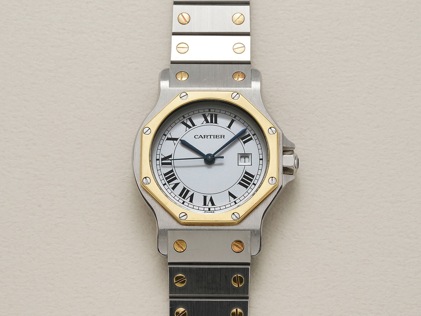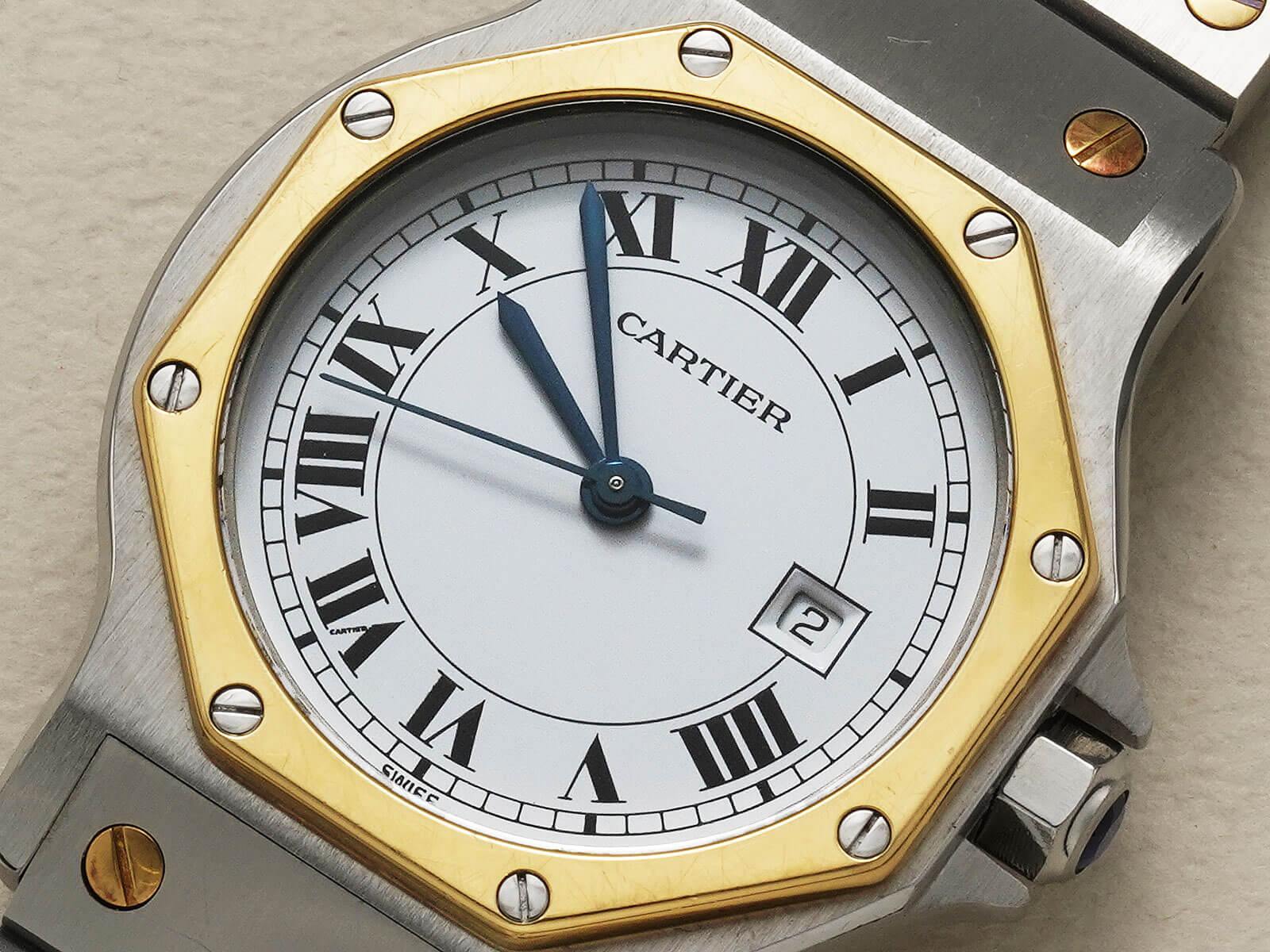 カルティエを代表するサントスシリーズの生産終了モデル「サントスオクタゴン / Santos Octagon」。八角形を意味するオクタゴンのモデル名の通り、サントスシリーズらしいベゼルデザイン、シリーズ初のステンレスを使用したスポーツテイストの強いデザインでラグジュアリースポーツウォッチとして、当時から人気の高いモデルでした。