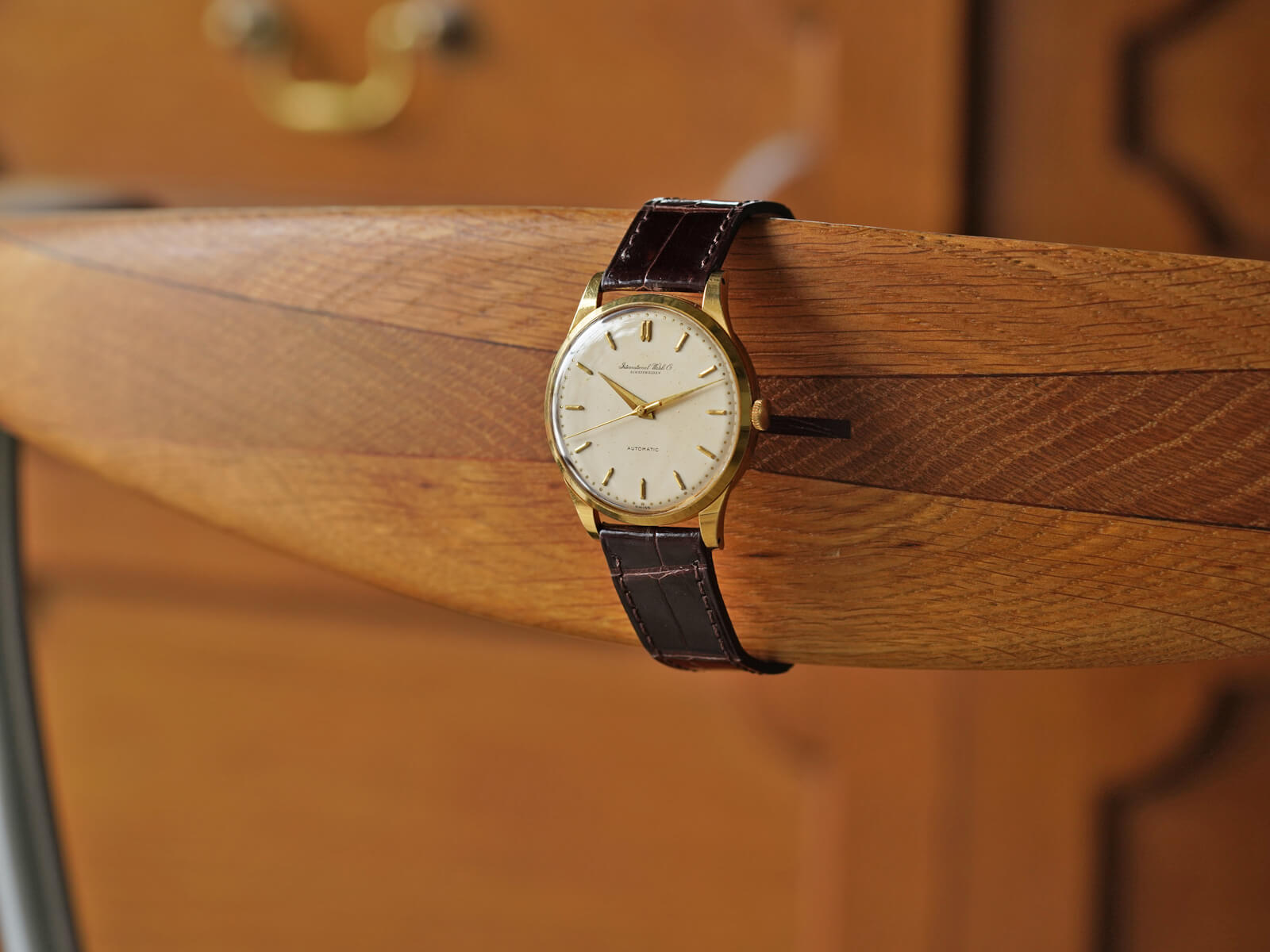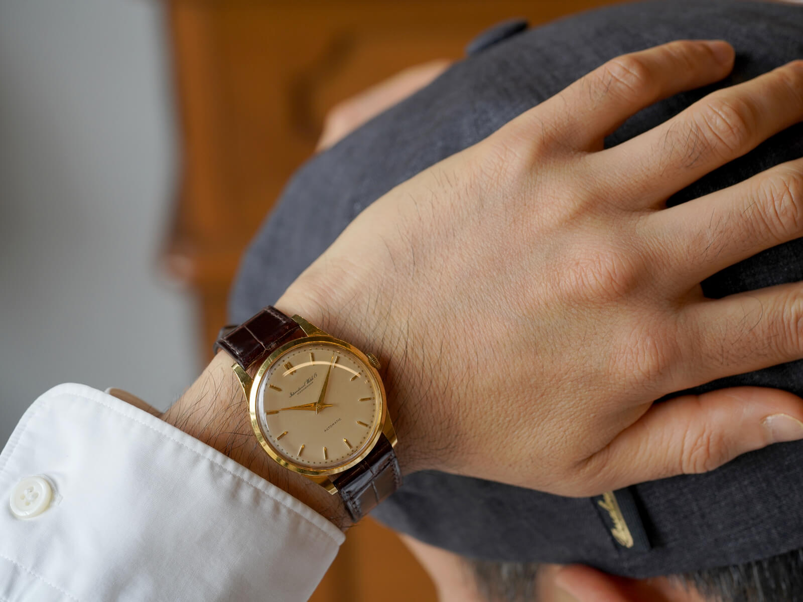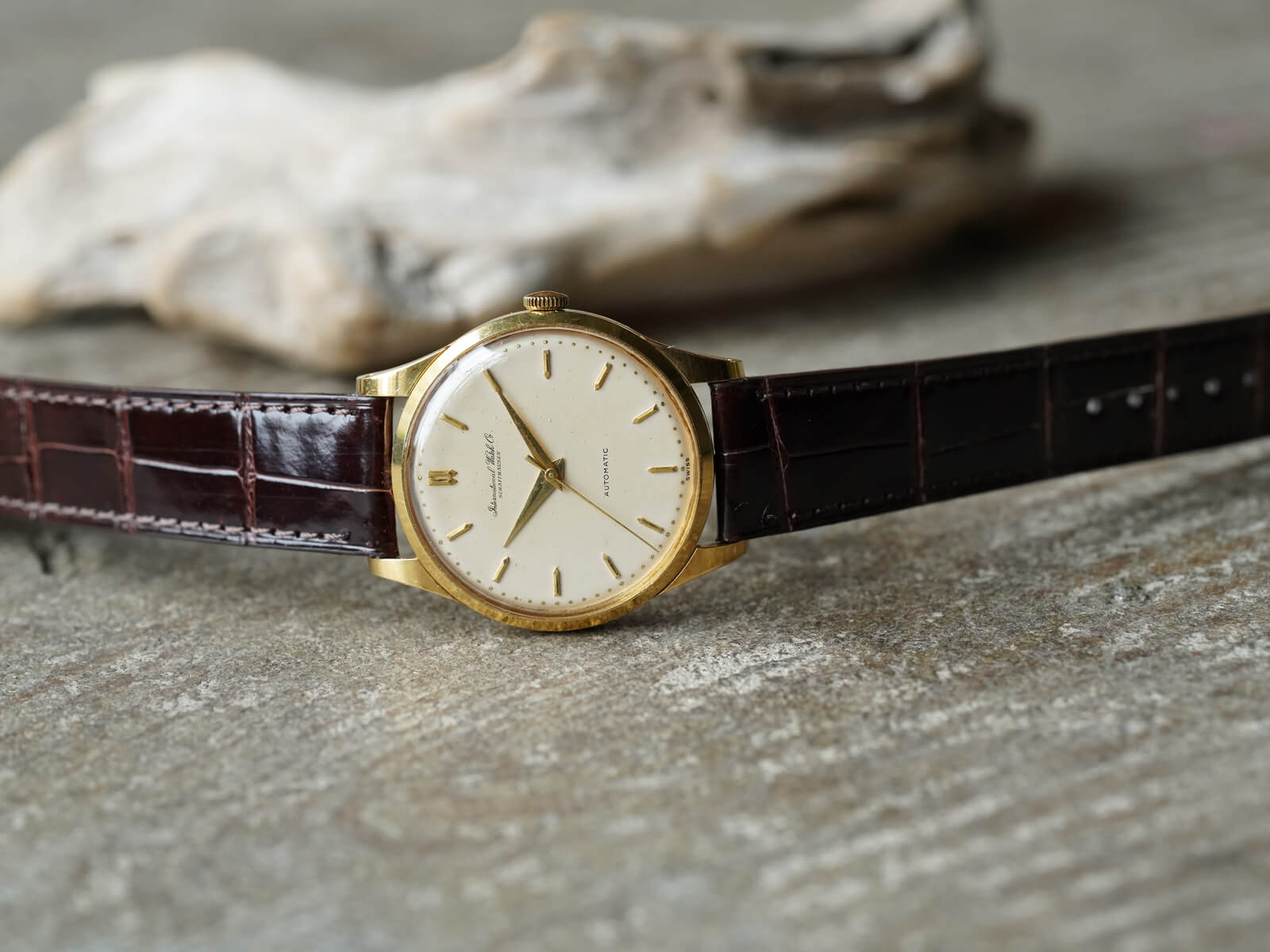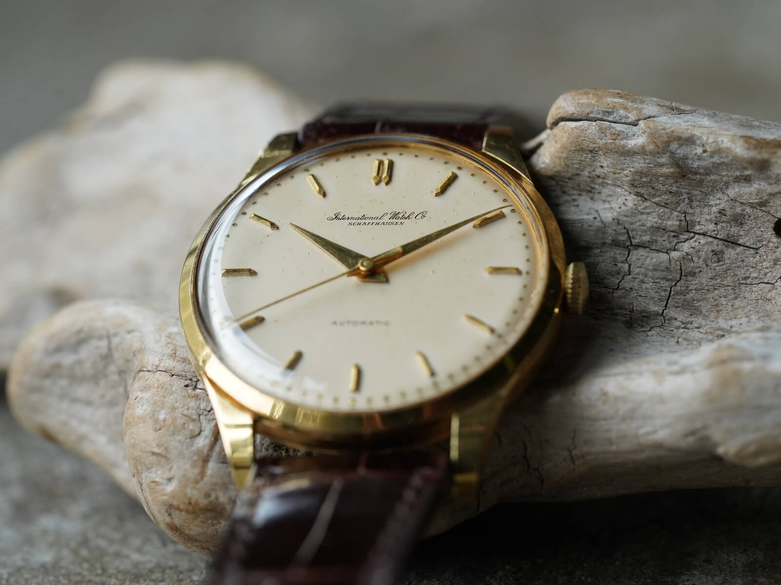 今回のご紹介は、IWCらしくシンプルでスマートな印象のモデルです。経年により程よくセピア化したアイボリーダイヤルに、ゴールドのバレットインデックスとドルフィンハンドが、風格を感じさせてくれる一本。オールドインター特有である、品の良い筆記体ロゴと金属のボールが埋め込まれたミニッツマーカーも健在し、職人気質を感じさせてくれる拘りのディテールが魅力です。