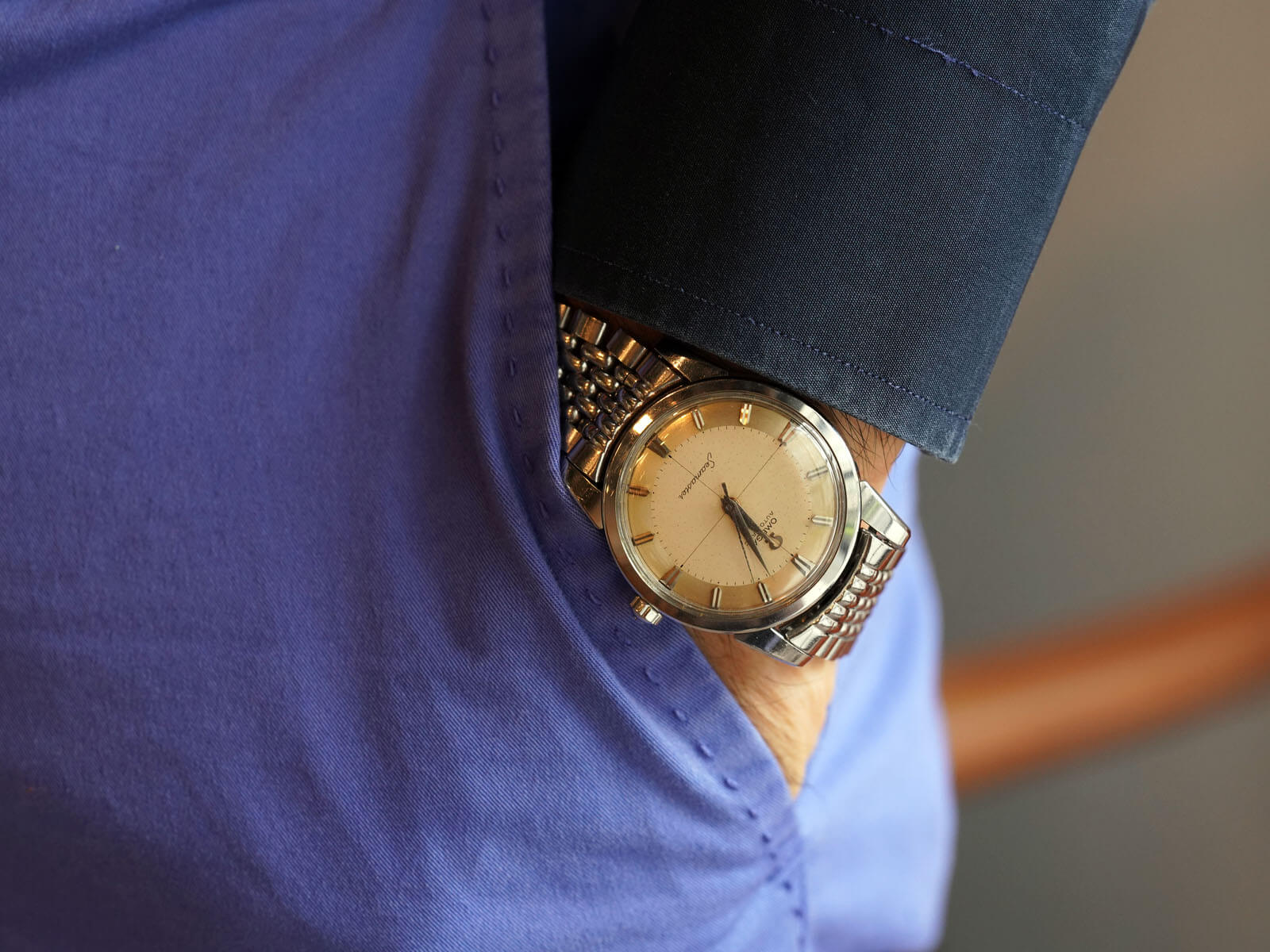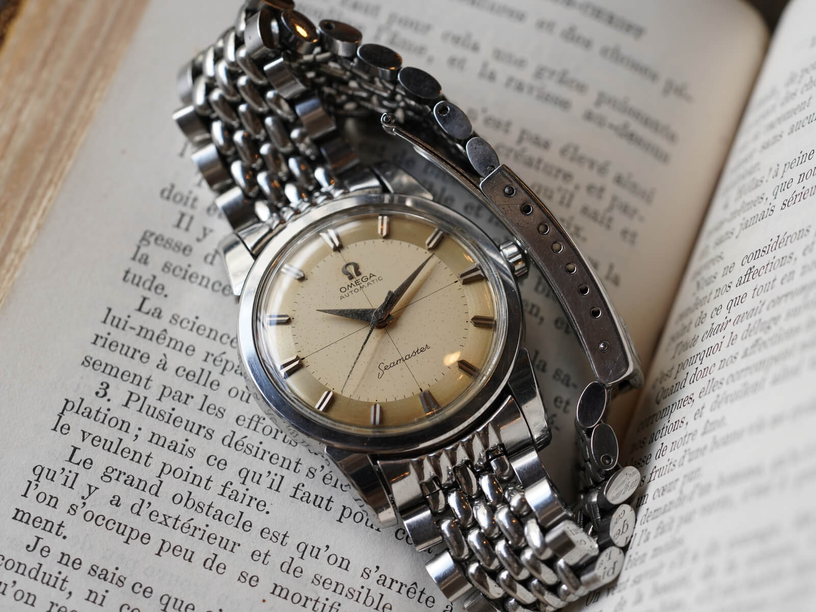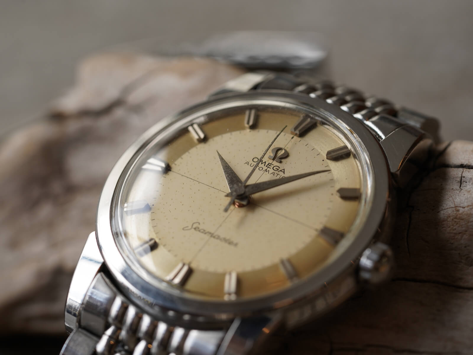 今回は、1950年代のスナップバック式ウォータープルーフステンレスケースに、独特なレイルウェイツートンカラーのアイボリーダイヤルを持つ、Ref.2846-13SC/2848のご紹介です。経年による素晴らしい褐色したダイアルに、12時下のアップライトのオメガロゴとスポーティーなドルフィンハンド。インデックスの立体的な縦長のバレット(砲弾型)が輝きを放ち、独特の雰囲気を演出してくれます。プラスチック風防の中央と竜頭に施されたオメガマーク、「Seamaster」の頭文字には初期モデルの証である「下がりS」と呼ばれるシブいロゴ、そして50年代に多くあるクロスダイヤルなど、ヴィンテージ特有のディーテールが多く揃った魅力を堪能できる逸品です。
