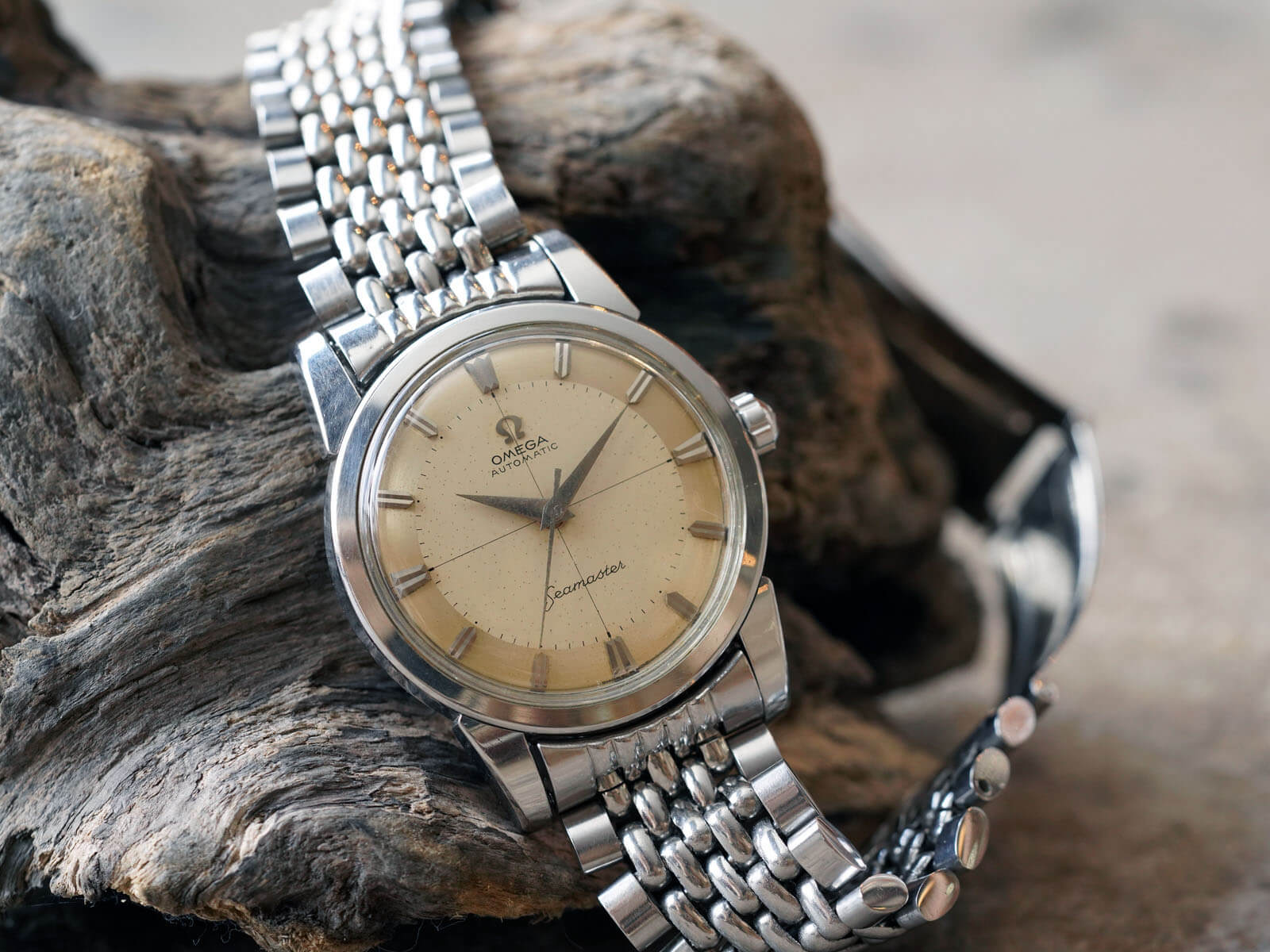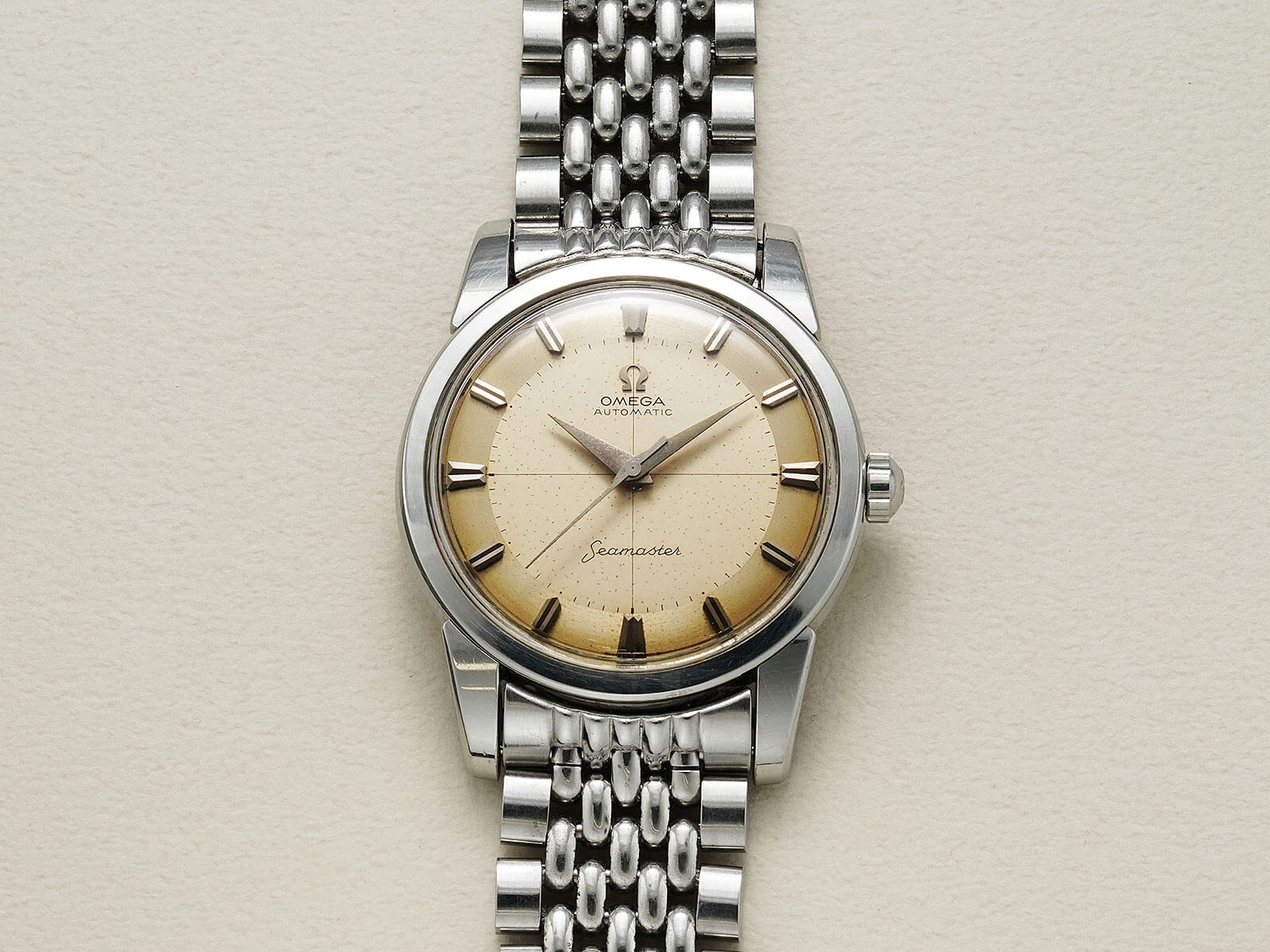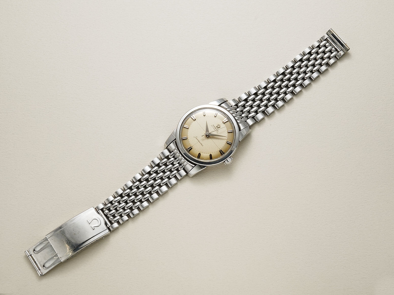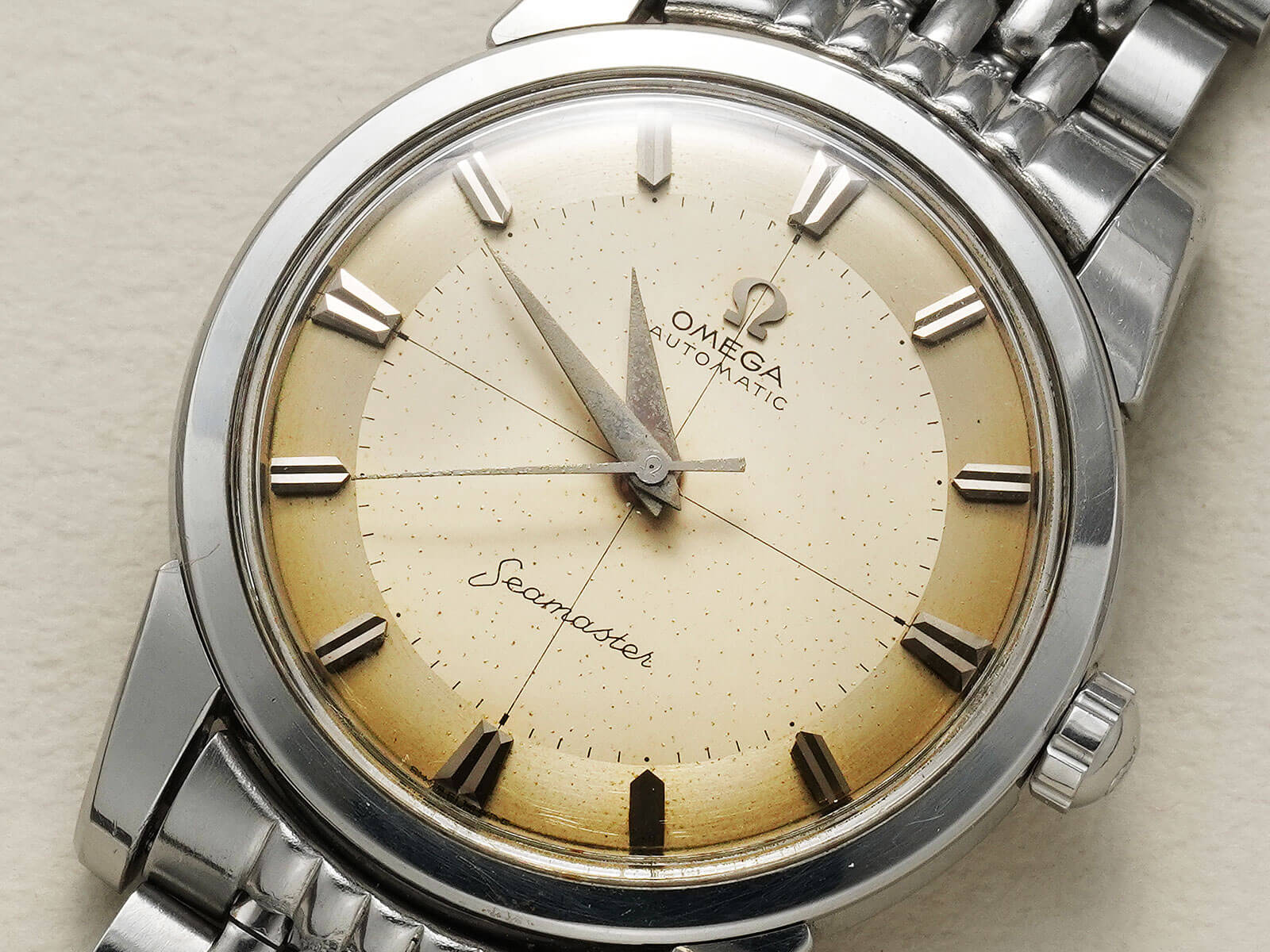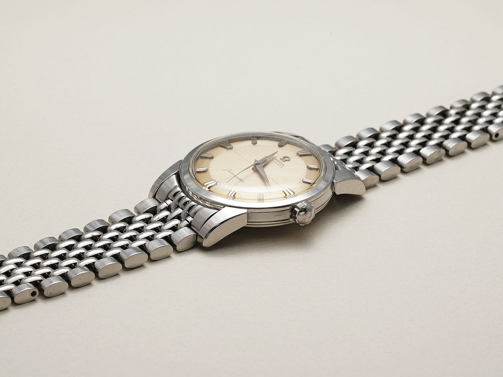 貴重なオメガ純正ステンレス製7連ライスジュビリーブレスレットが付属する事に加え、ケースの状態が良く、大切に使われていた事が伺える、素晴らしい時計です。是非お手に取って御覧ください。
