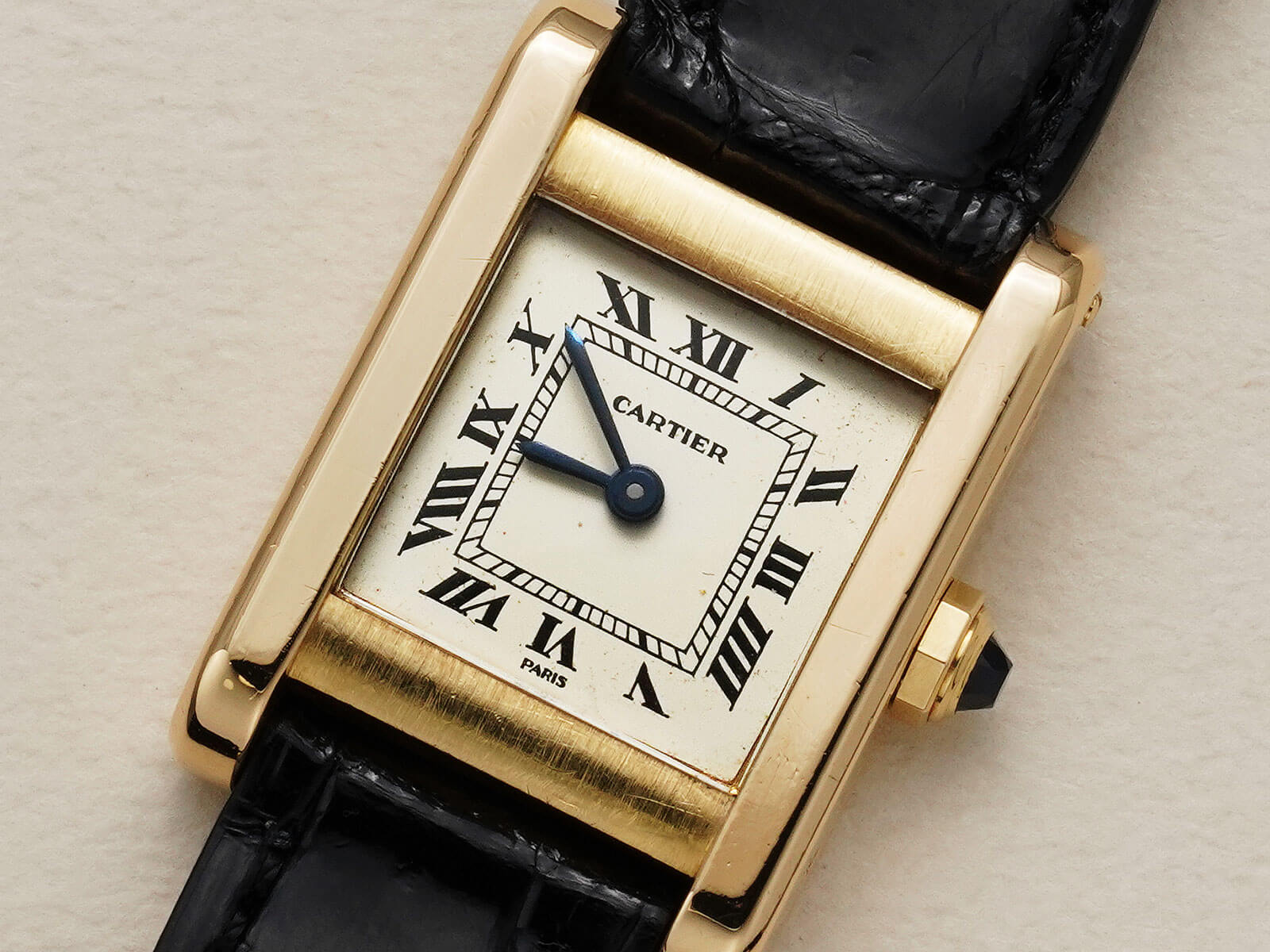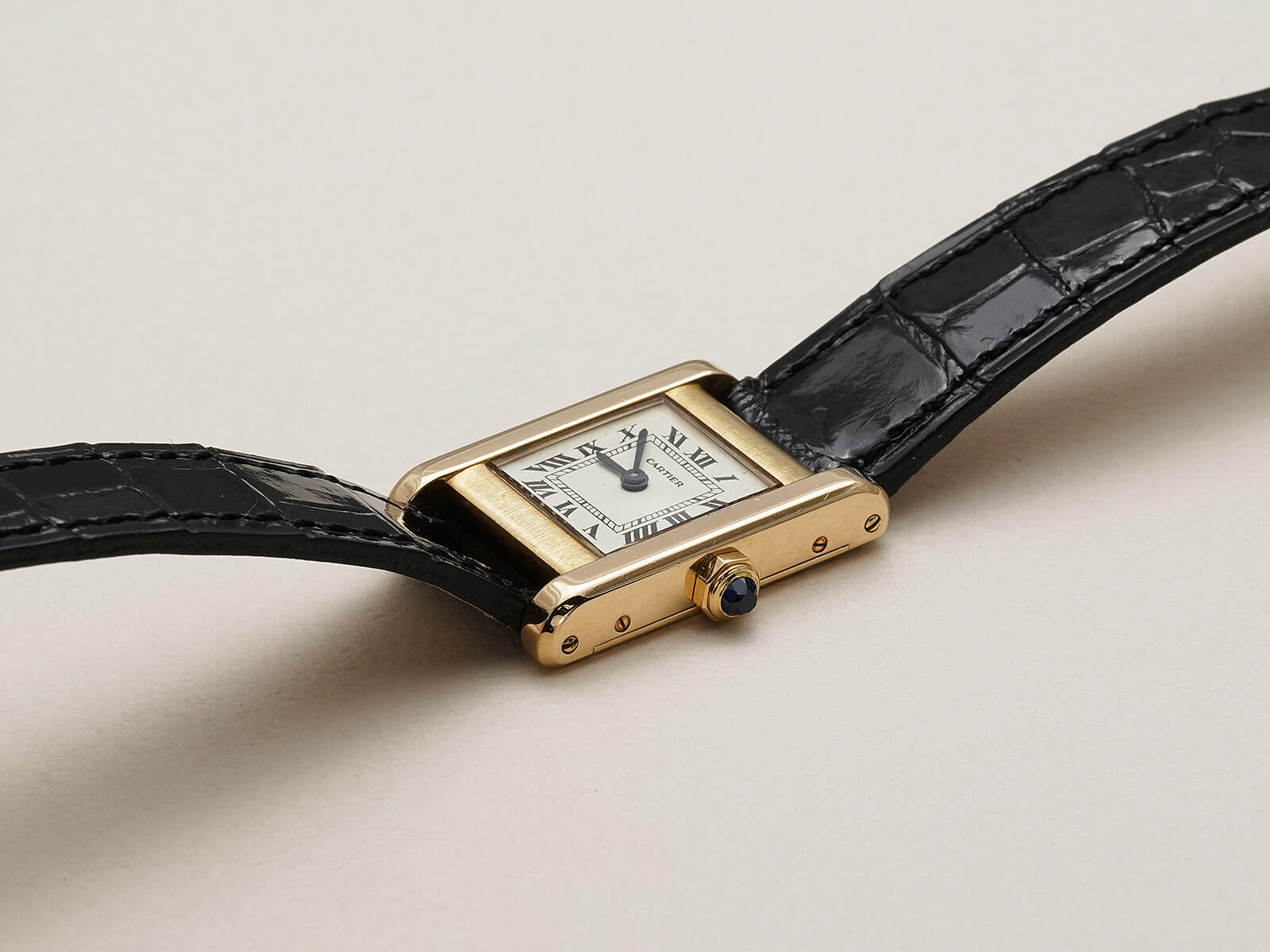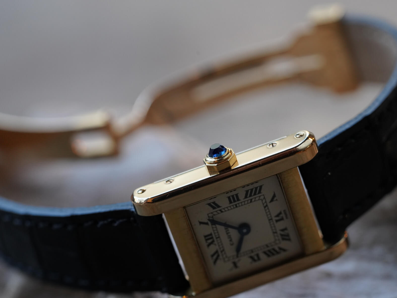 今回ご紹介のRef.78093は、1973年からスタートした[Louis Cartier Collection / ルイカルティエコレクション]にて発売されたモデルの一つでもあります。アールデコの概念を色濃く映し出しているデザインに、ソリッドゴールドモデルのみに見られる、PARIS表記のホワイトローマンダイヤルにブルースチールハンド、サファイアカボションリューズ等、カルティエ伝統のディティールが美しく、人を惹きつける不思議な力を感じてしまいます。
